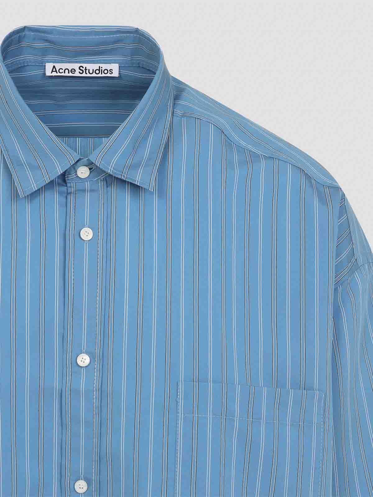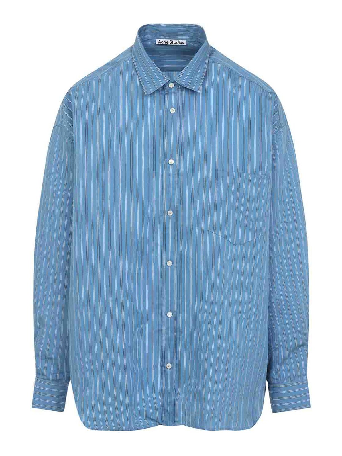 Blaues Lyocellhemd von Acne Studios. Hergestellt aus einer Mischung aus Lyocell und Polyester, spitzer Kragen, Knopfverschluss auf der Vorderseite, aufgesetztes Brusttasche, aufgesetztes Logo auf der Rückseite, abgesenkte Schultern, lange Ärmel, geknöpfte Manschetten, runder Saum. Durchgehend mehrfarbiges blaues Streifenmuster.