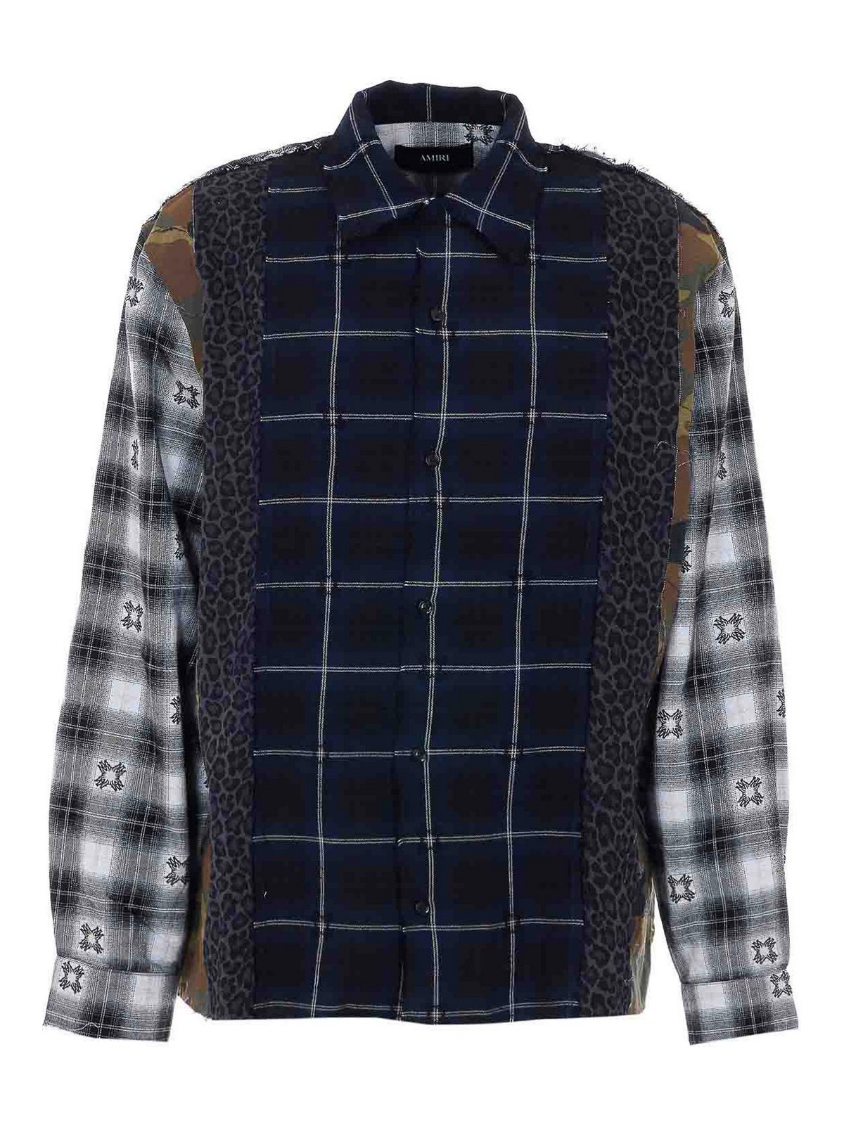 Mehrfarbiges Amiri-Hemd mit Knopfverschluss an der Vorderseite, regulärer Kragen, Patchdetail, Karomuster, Leopardenmuster, Camouflage-Detail, regulärer Kragen