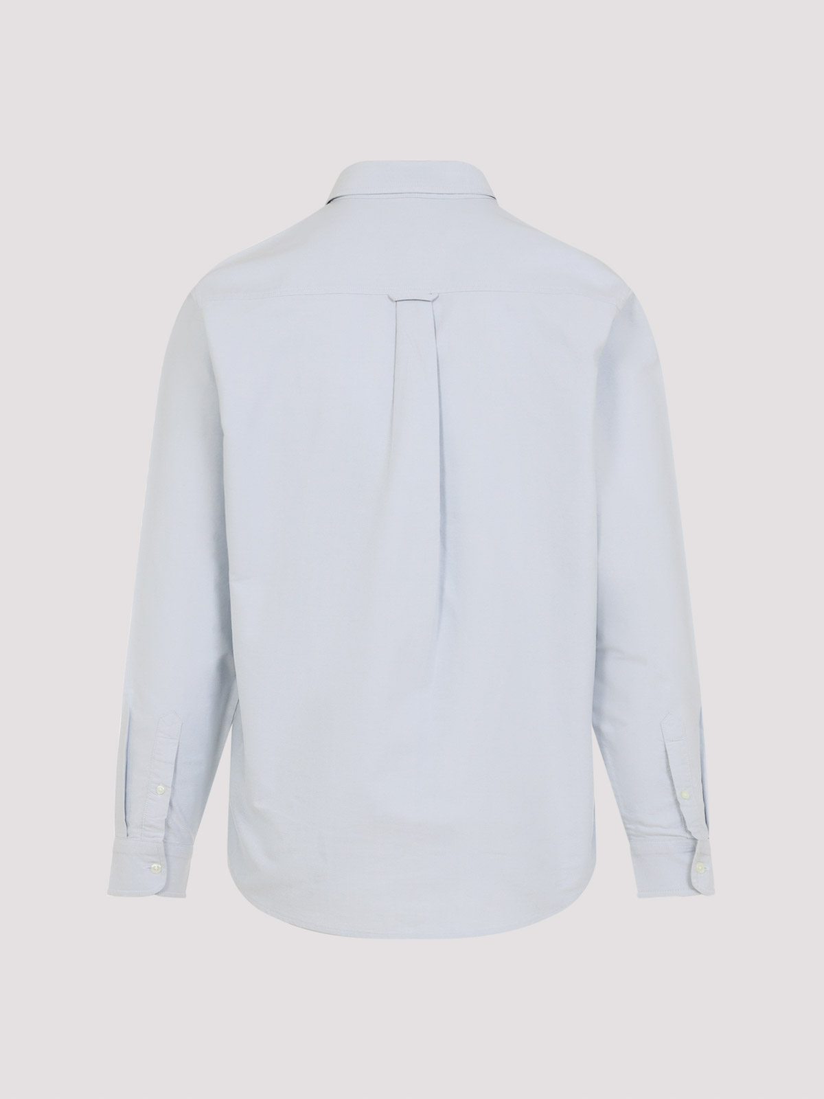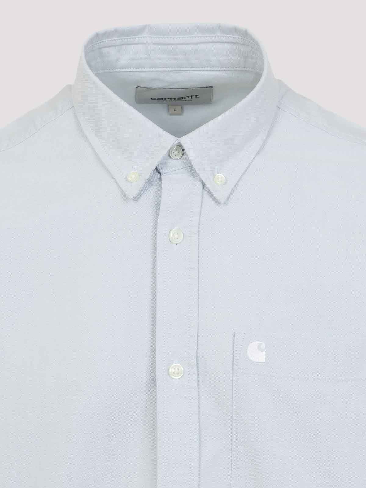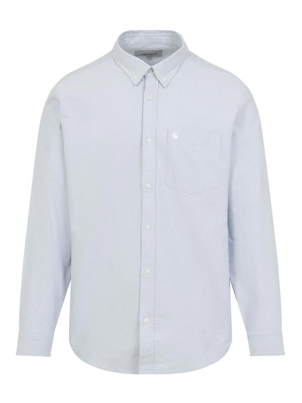 Hellblaues Baumwollhemd mit Carhartt Wip LS C-Logo. Hergestellt aus hellblauer Oxford-Baumwolle, garngefärbter, Button-Down-Kragen, Knopfverschluss auf der Vorderseite, aufgesetzte Tasche mit C-Logo-Detail, lange Ärmel, geknöpfte Manschetten, Rückenpasse, Schlaufe und kastenförmige Falte, runder Saum.