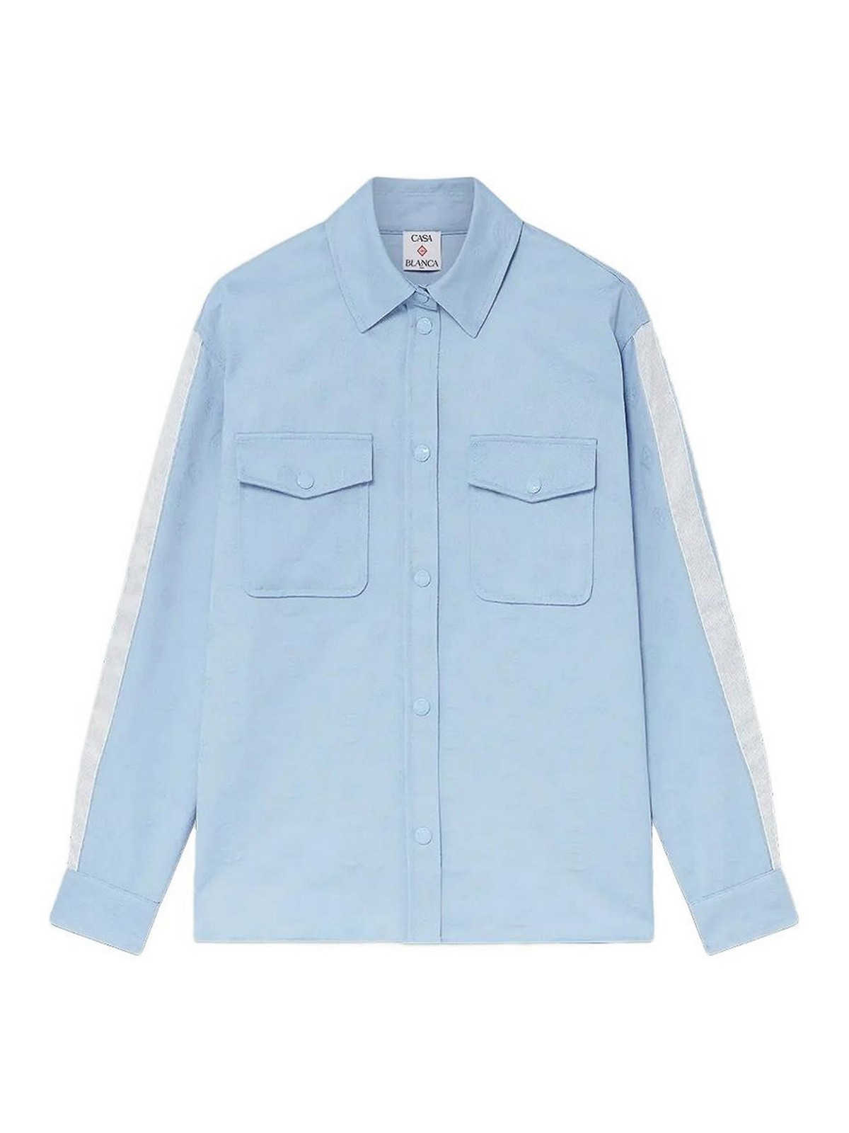 Hellblaues Baumwollhemd von Casablanca mit Allover-Muster, Logo-Streifendetails an den Ärmeln, klassischem Kragen, aufgesetzten Brusttaschen, langen Ärmeln und Knopfverschluss auf der Vorderseite. Der gerade Schnitt und das elegante Design sorgen für Komfort und eine natürliche Passform, während die grafischen und maßgeschneiderten Details diesem Stück einen raffinierten, modernen Stil verleihen, perfekt für lässig-schicke Looks oder herausragende Alltagsoutfits.
