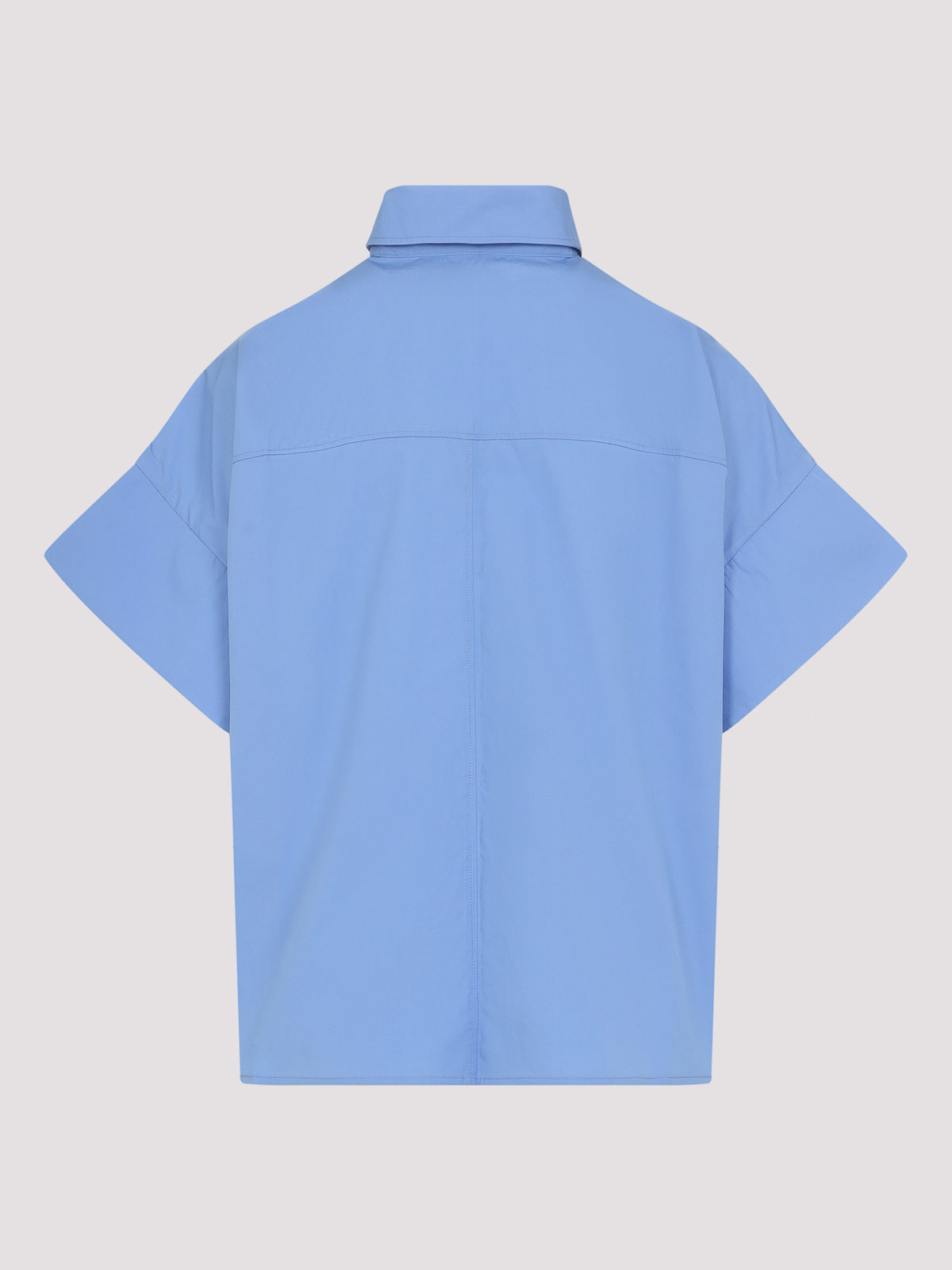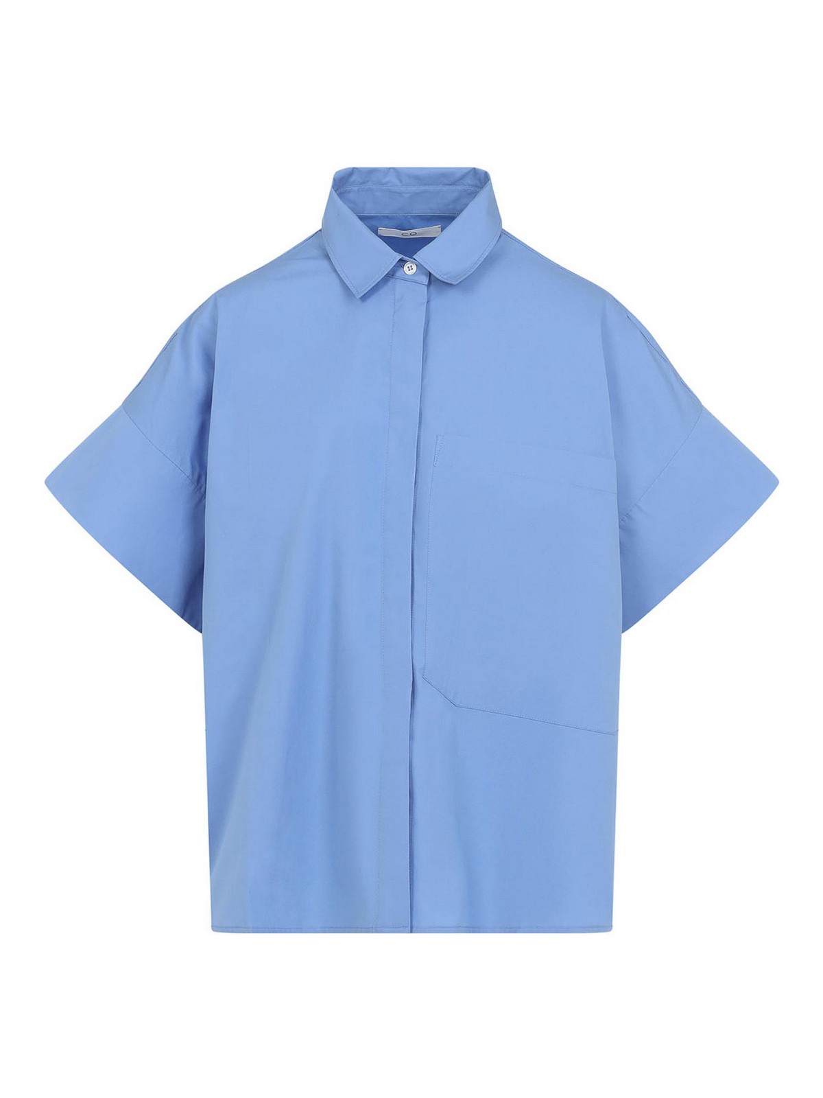 Hellblaues Baumwollhemd Co Boxy ss. Boxyfit-Hemd aus hellblauer Baumwollpopeline mit spitzem Kragen, verdecktem Knopfverschluss auf der Vorderseite, skulpturalen kurzen Ärmeln, übergroßer aufgesetzter Brusttasche, Rückenpasse und geradem Saum.