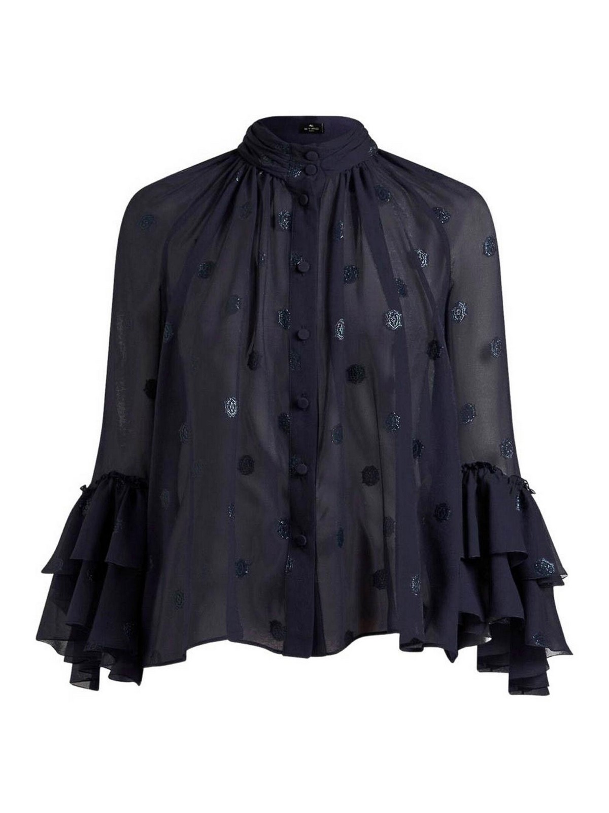 Relax-Fit-Hemd aus reiner Seidengeorgette mit durchsichtigem Effekt. Dieses Modell mit hohem Kragen zeichnet sich durch metallische Fil-Coup-Verzierungen und weite Volants an den Ärmelenden aus. Regulärer Rollkragenpullover mit drei viertellangen Ärmeln, die mit verdeckten Knöpfen geschlossen werden, hergestellt in Italien Das Model ist 5' 9 (177 cm) groß und trägt Größe 40