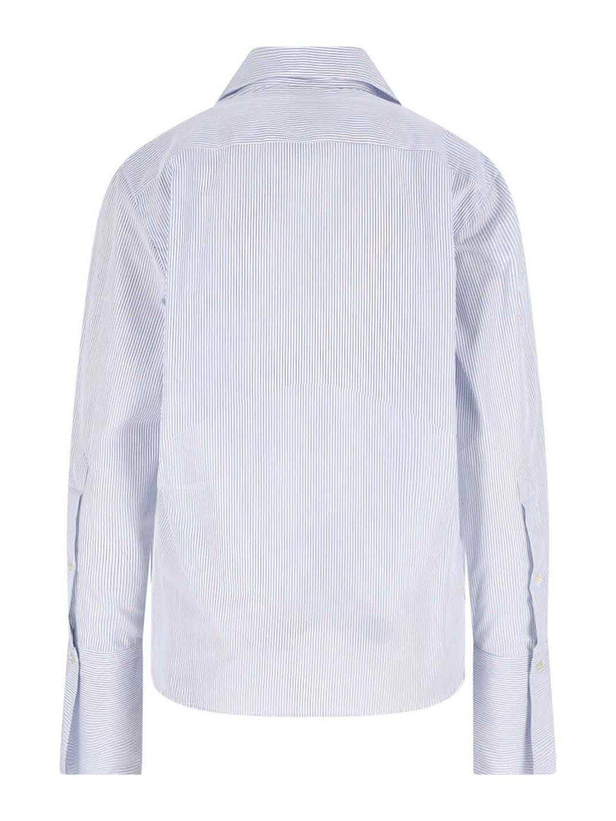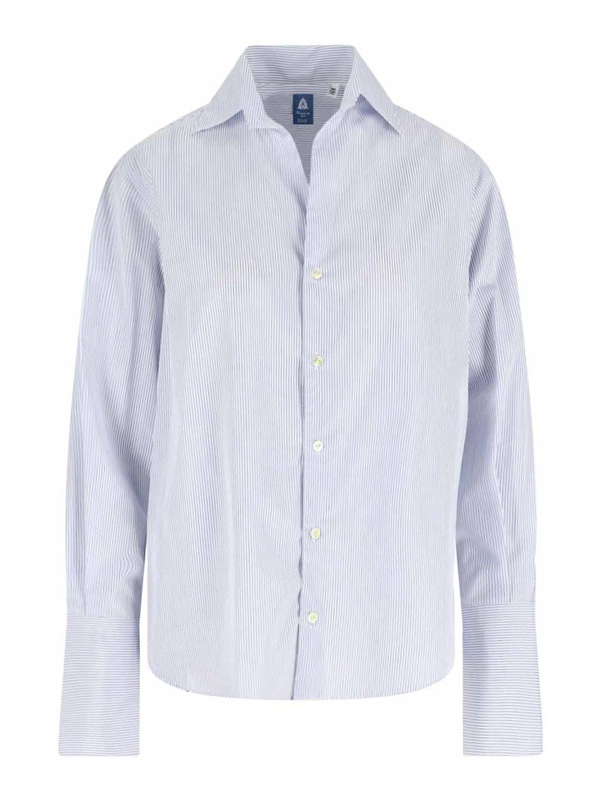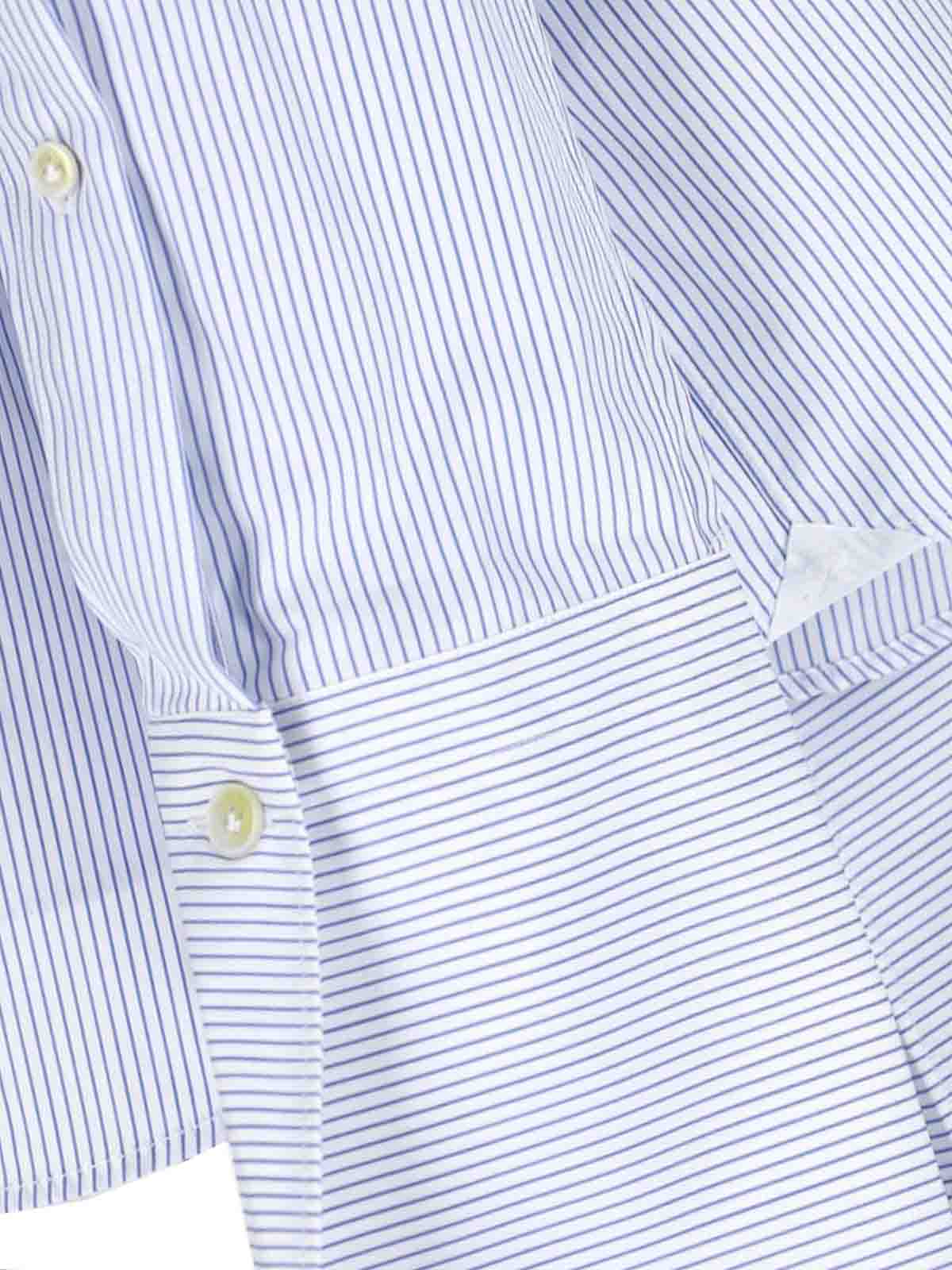 Finamore 1925 Napoli-Hemd aus hellblauer Baumwolle, Streifenmuster, klassischer Kragen, Knopfverschluss, lange Ärmel, geknöpfte Manschetten, geschwungener Saum.