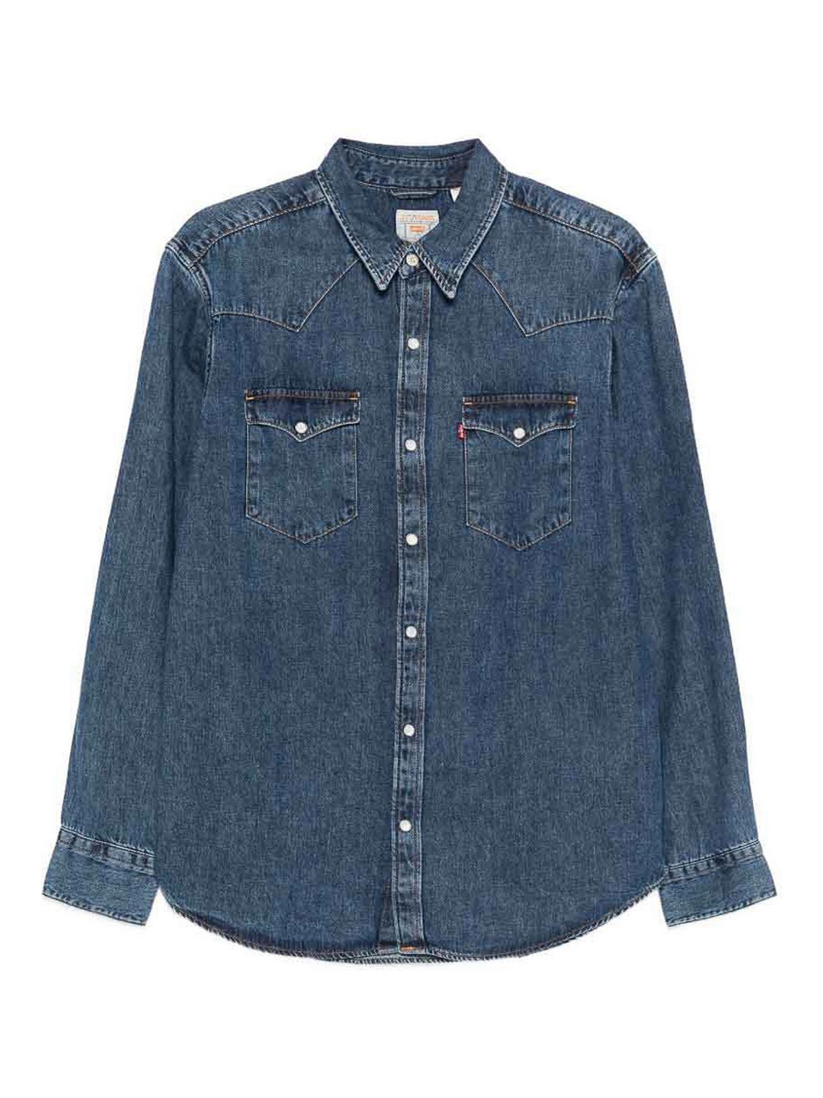 Blaues Denim-Barstow-Westernhemd von Levis mit einem klassischen und ikonischen Western-inspirierten Design. Es verfügt über einen spitzen Kragen, einen Druckknopfverschluss auf der Vorderseite, zwei Brusttaschen und einen geschwungenen Saum. Es ist ein vielseitiges Stück, das sich perfekt mit Ihrer Lieblingsjeans kombinieren lässt, um einen lässigen Denim-on-Denim-Look zu kreieren