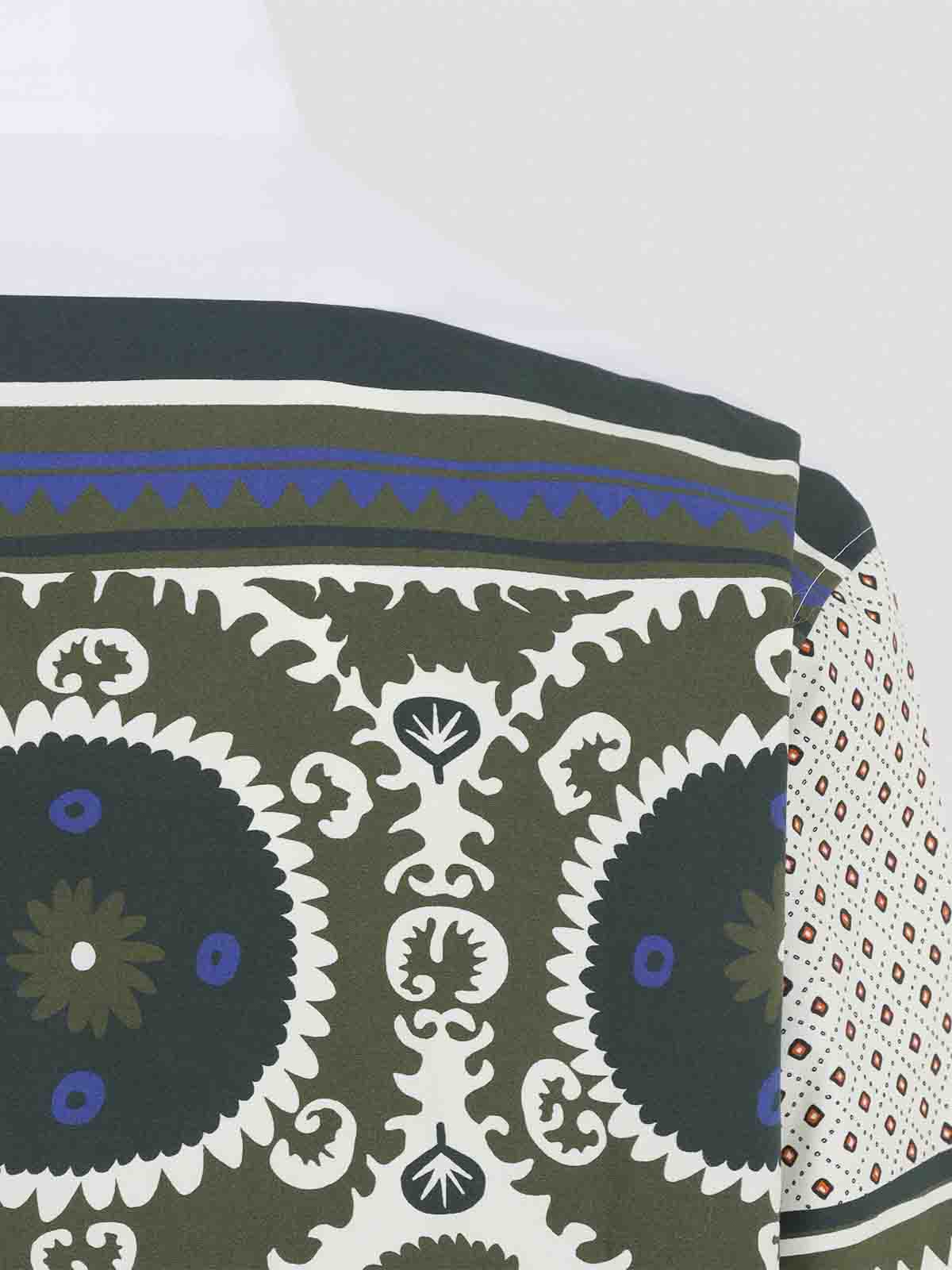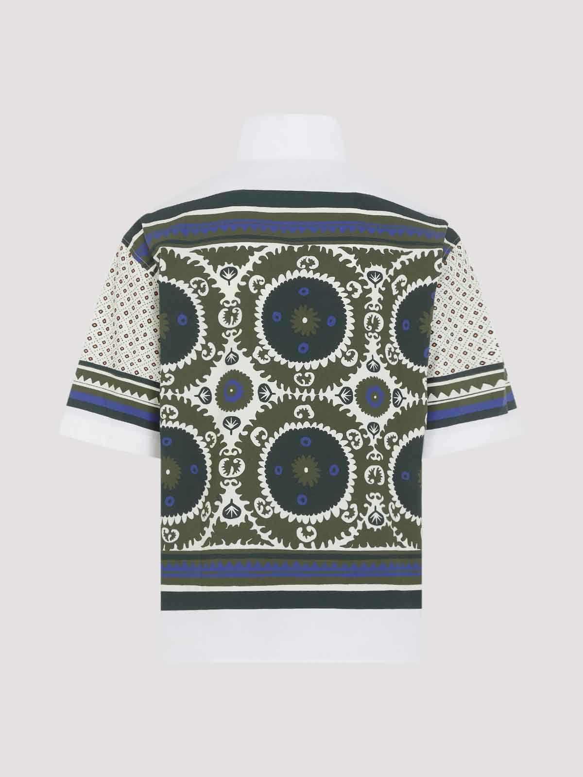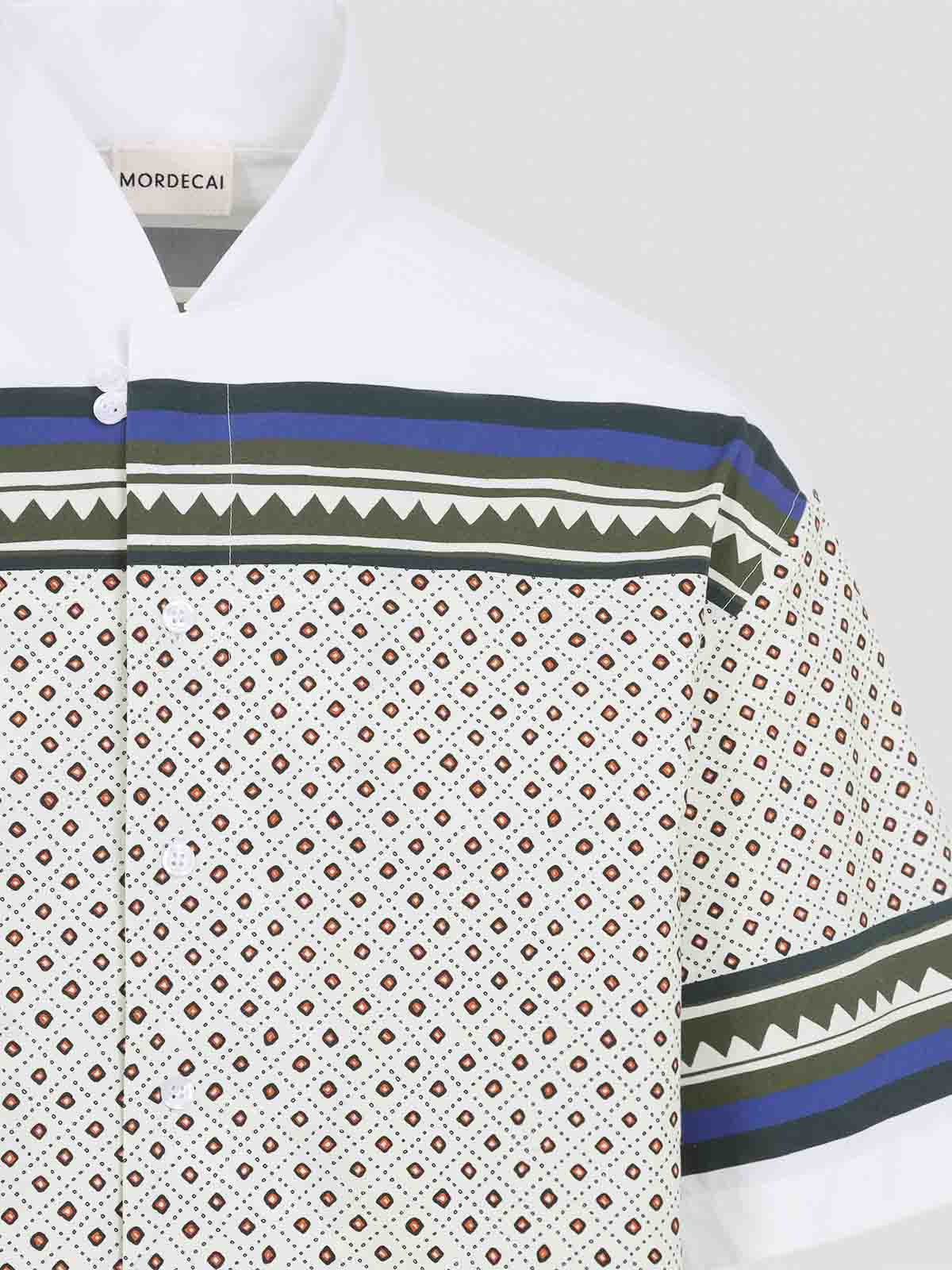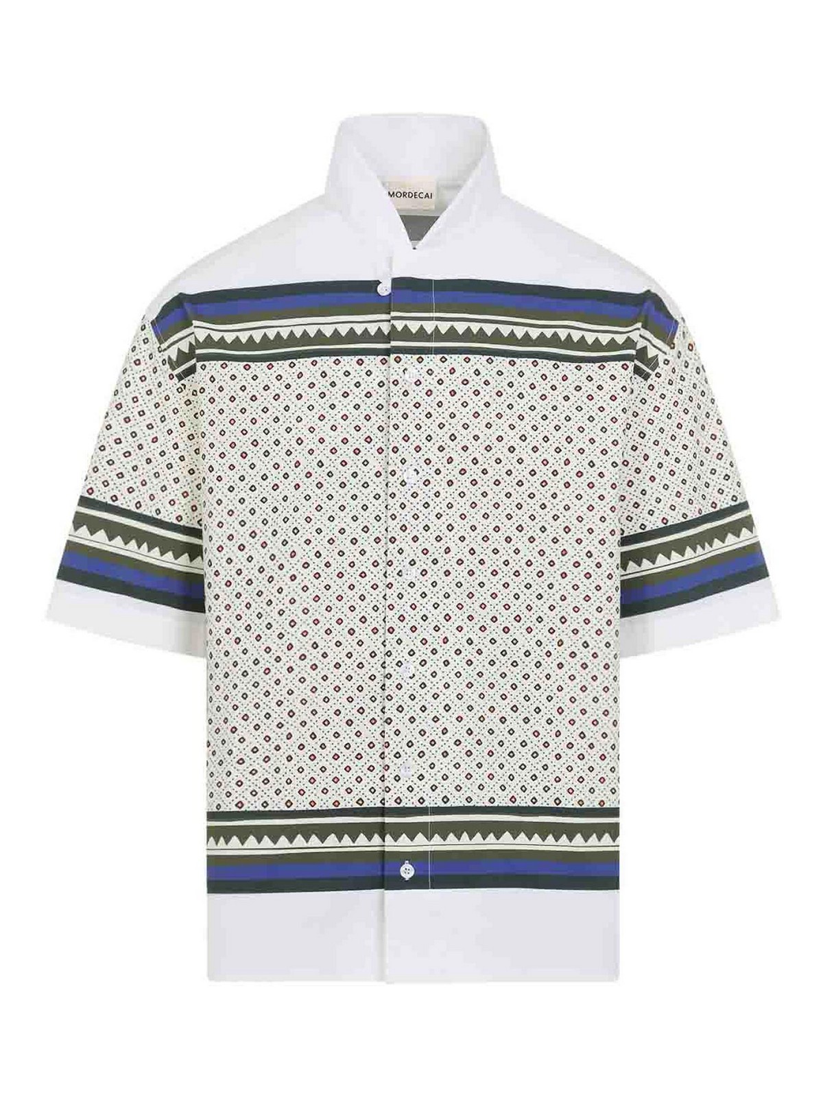 Blaues Bandana-Bowlinghemd aus Baumwolle. Hemd aus reiner Baumwolle, Stehkragen im koreanischen Stil, Knopfverschluss auf der Vorderseite, verdeckter Verschluss auf der Vorderseite, abgesenkte Schultern, gerader Saum. weißer Hintergrund mit durchgehendem rotem, blauem und grünem geometrischem Muster.