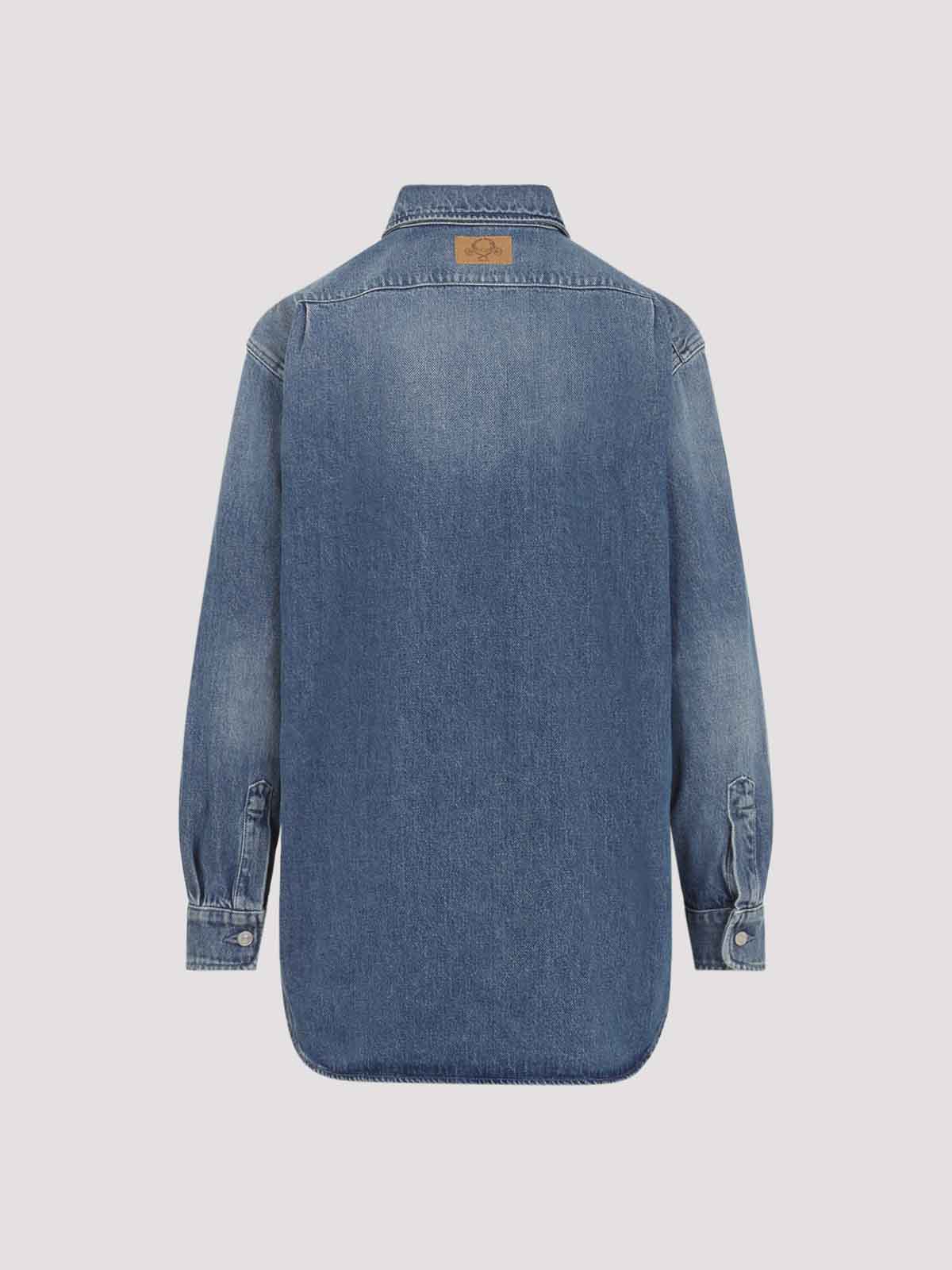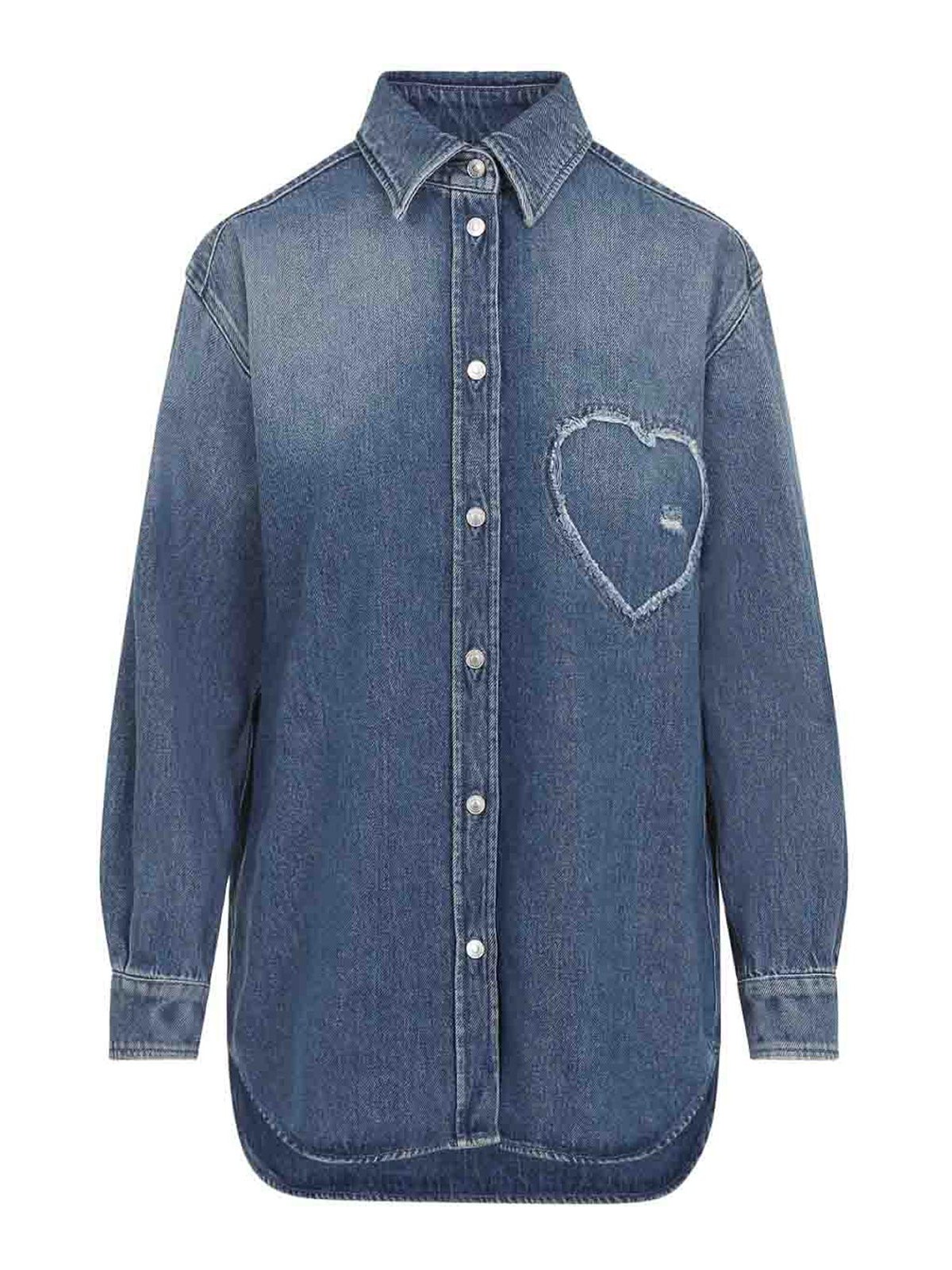 Blaues Baumwoll-Jeanshemd in Herzform von Moschino. Hemd aus reiner Baumwolle, spitzer Kragen, Knopfverschluss auf der Vorderseite, seitliches Herzdetail mit Fransen, Logo auf der Rückseite, lange Ärmel, geknöpfte Manschetten, asymmetrischer Saum. Overwash-Effekt.