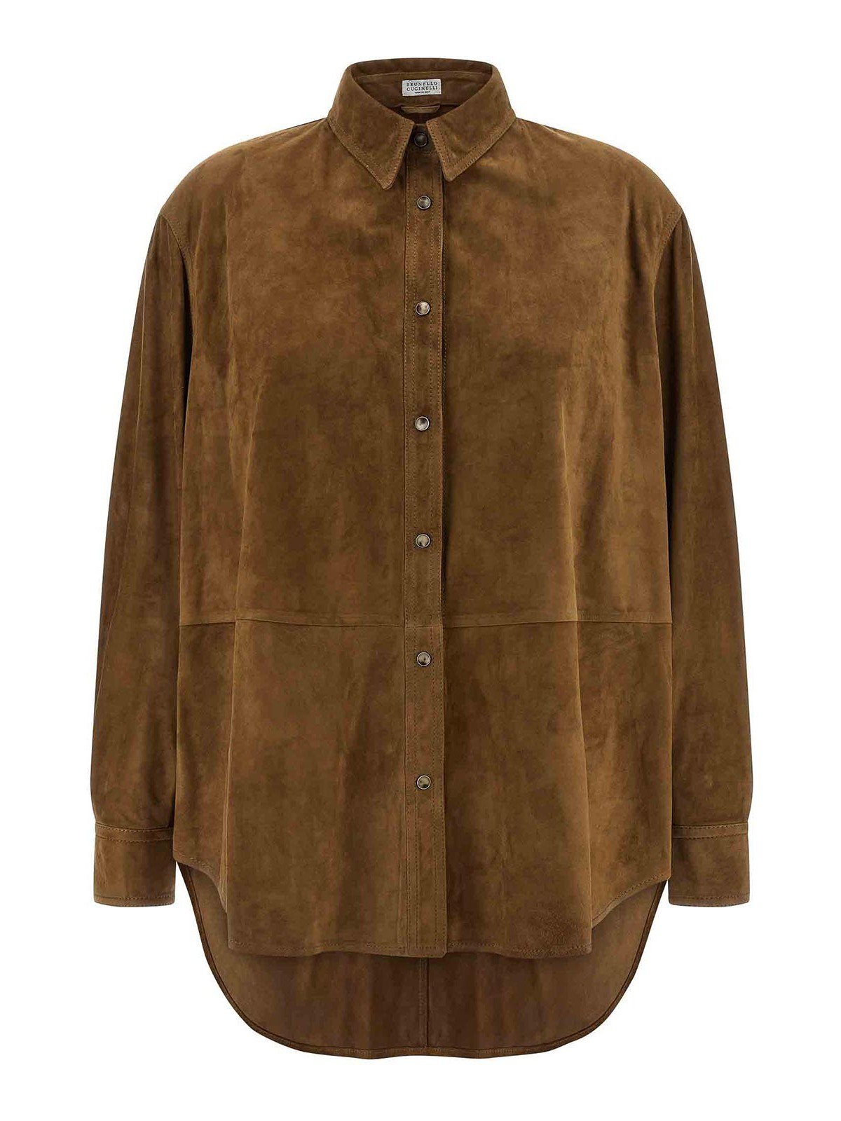 Wildlederhemd mit Panelkonstruktion, Moile-Detail auf der Rückseite, Horndruckknopfverschluss auf der Vorderseite, lange Manschettenärmel.