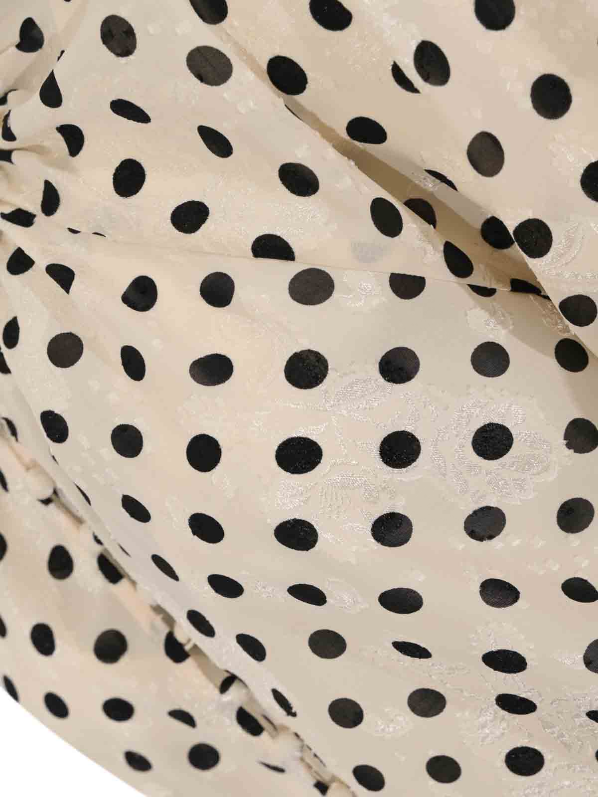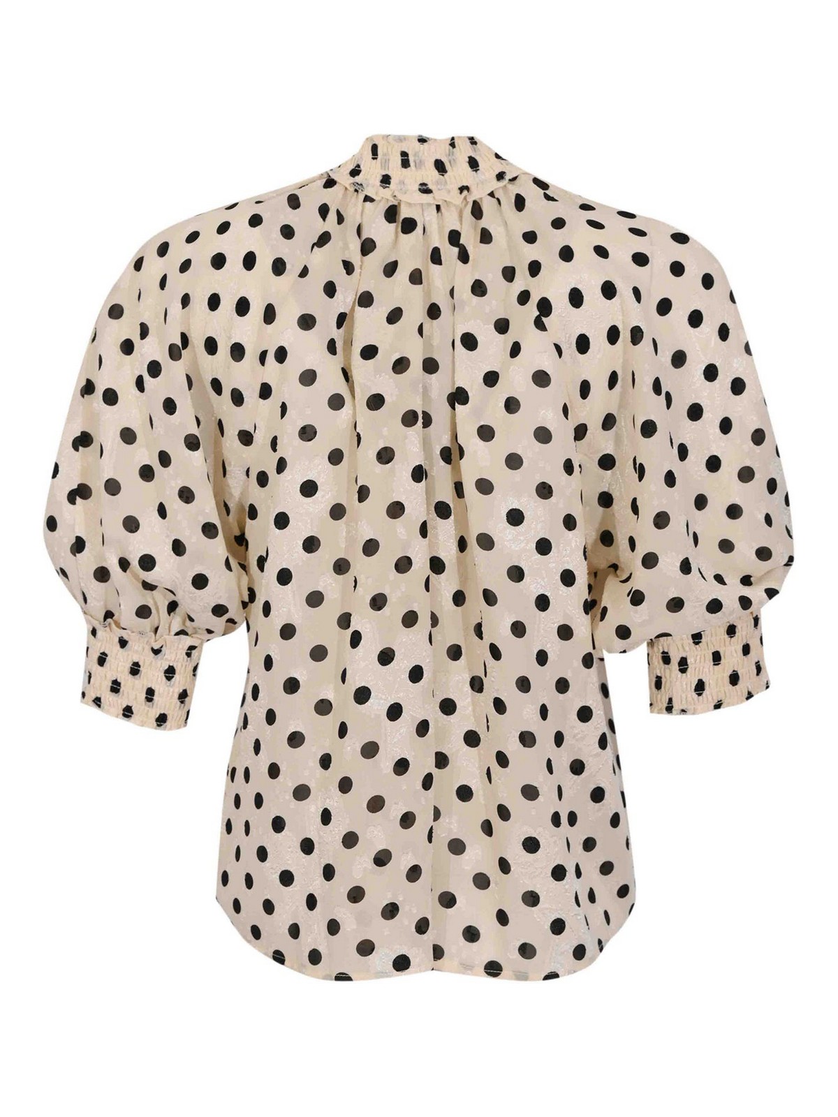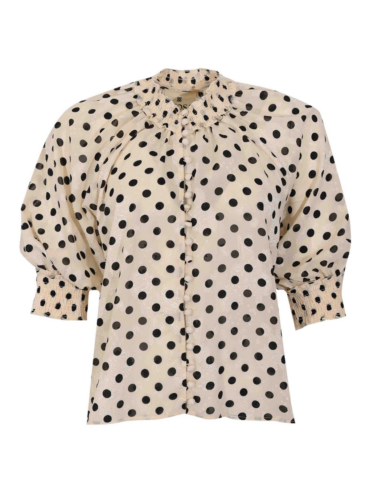 Damenhemd aus leichtem Stoff, Amosa, Modell a26ssca35, Stoff: leichter Stoff mit Jacquard-Verarbeitung, Muster: Tupfen mit farblich abgestimmter Blumenstickerei, Ärmel: kurz gepufft mit elastischen Bündchen, Kragen: hoch gerafft, Verschluss: Vorderseite mit verdeckten Knöpfen, Taschen: nicht vorhanden, Details: halbtransparenter und heller Stoff, Raffungen an Kragen und Schultern, voluminöse Ärmel, elastische Manschetten mit Smokingdetail, zarter Blumenprint in den Stoff integrierte Stickerei, fließende und feminine Linie, Futter: nein, Passform: weich