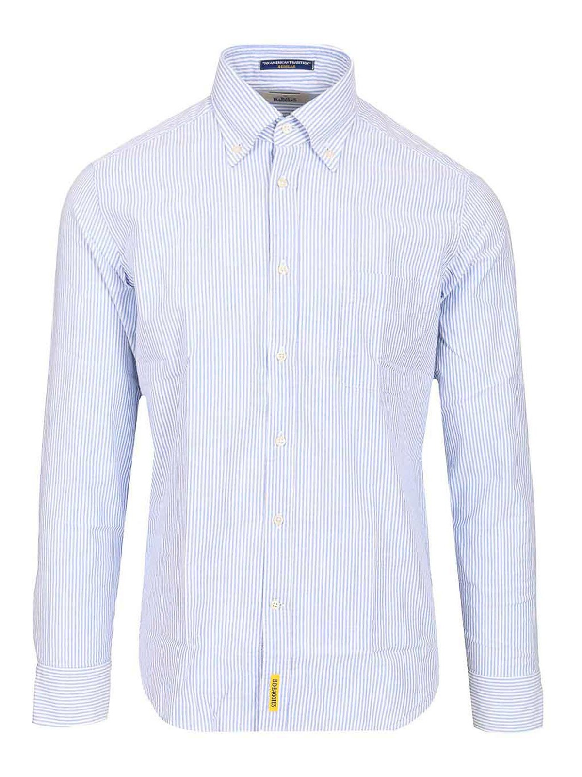 Gestreiftes Bradford-Hemd aus Baumwolle von b d baggies mit einem strukturierten Button-Down-Kragen, einer Brusttasche, einer Knopfleiste auf der Vorderseite und einem kleinen Etikett, das am Saum aufgenäht ist.