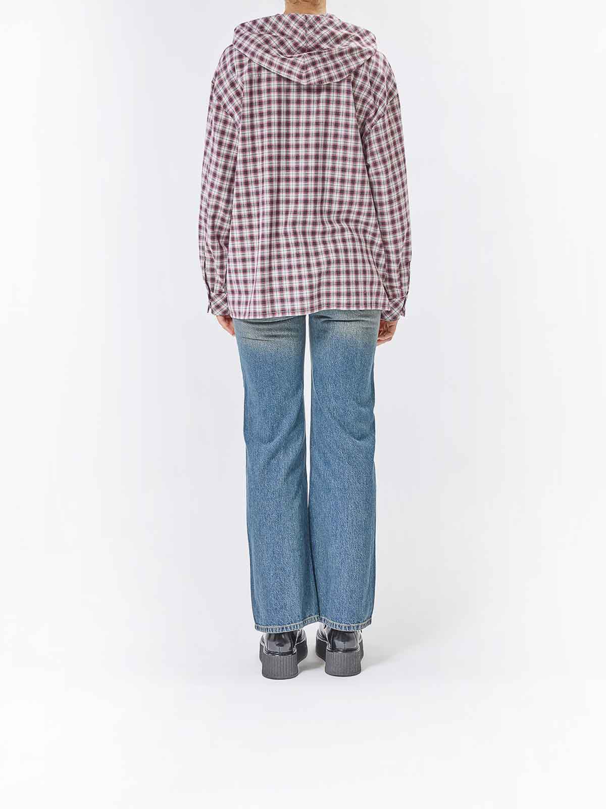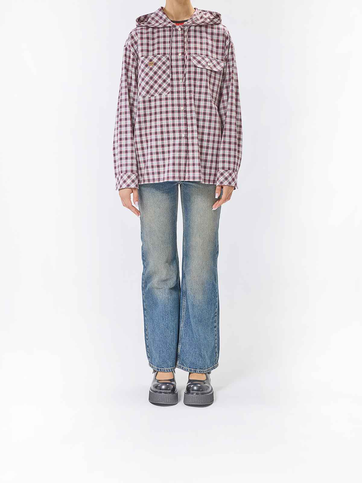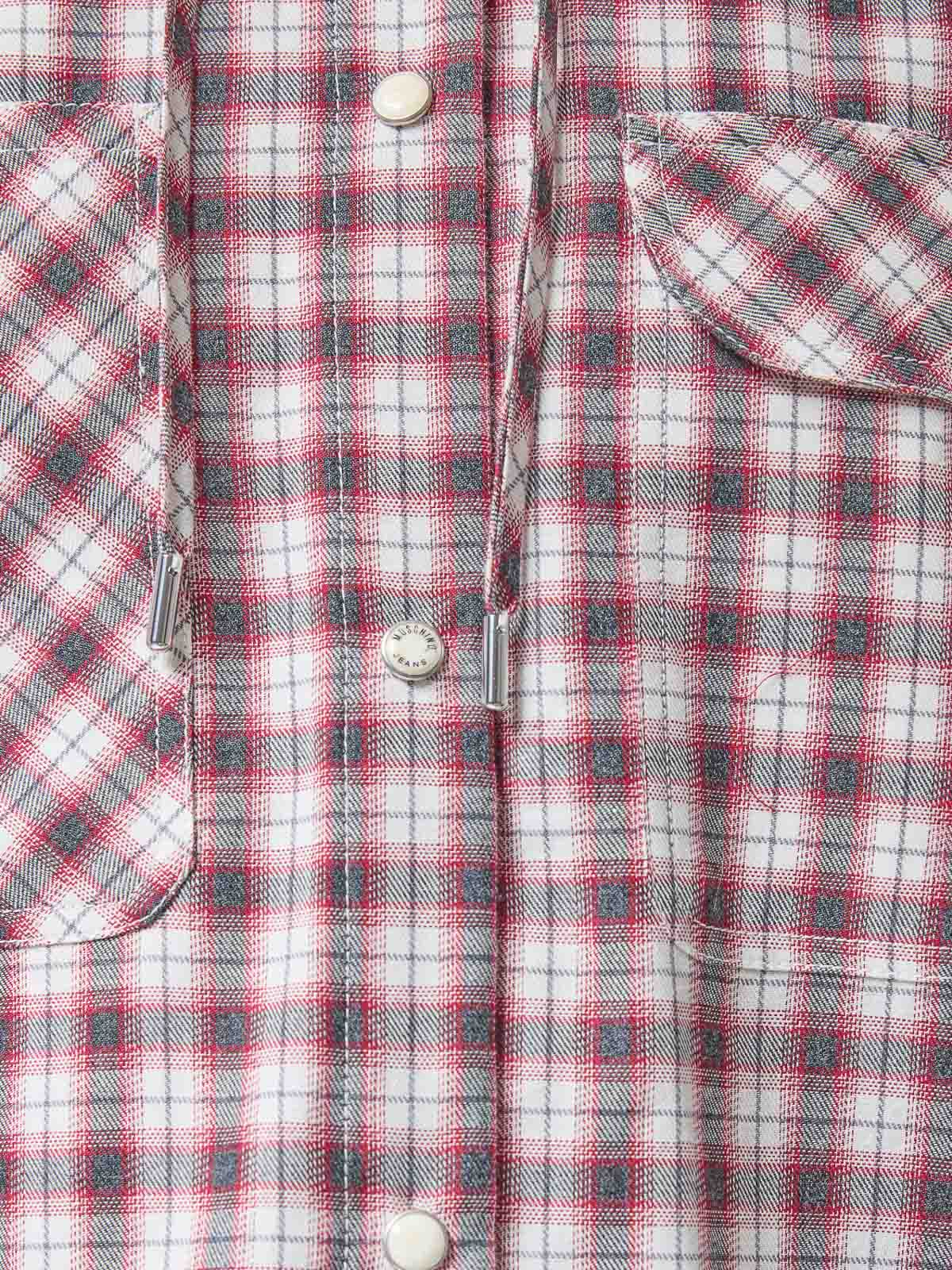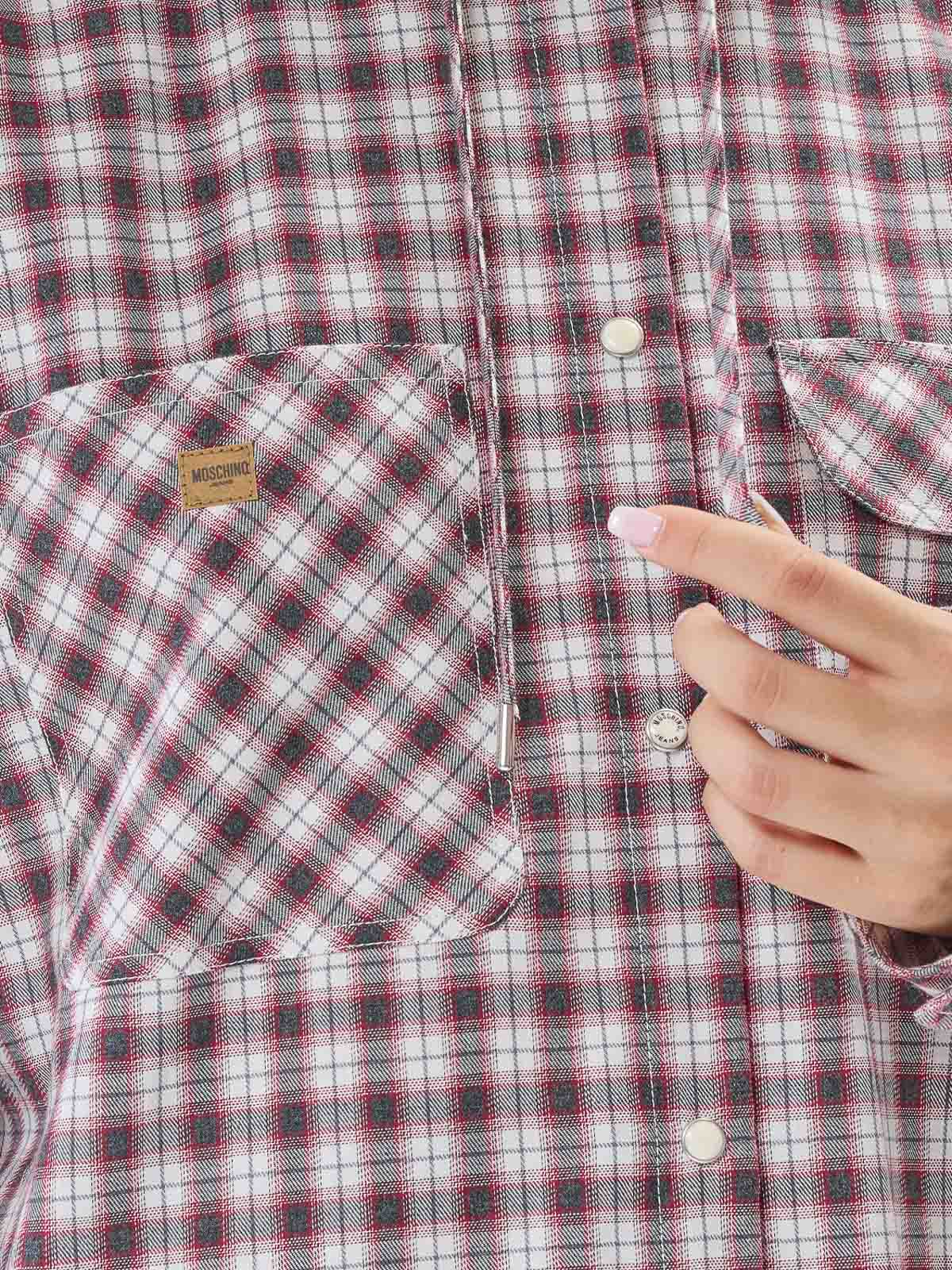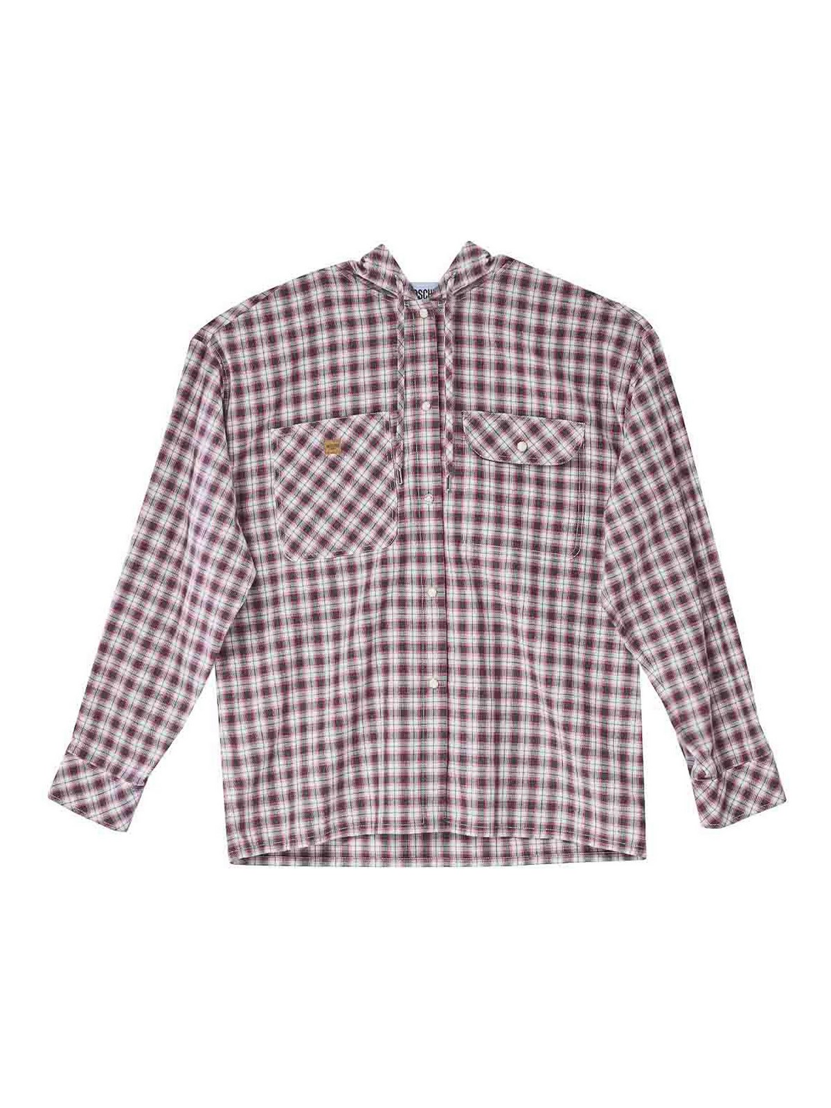 Mehrfarbiges Kapuzenhemd. Moschino Langarmhemd aus Baumwolle mit Karomuster, einer Kapuze, zwei aufgesetzten Fronttaschen und einem Druckknopfverschluss. Lange Ärmel, Karomuster, Kapuze, zwei aufgesetzte Taschen, Druckknopfverschluss, Moschino-Etikett an der Tasche. Farbe: mehrfarbig. 100% Baumwolle