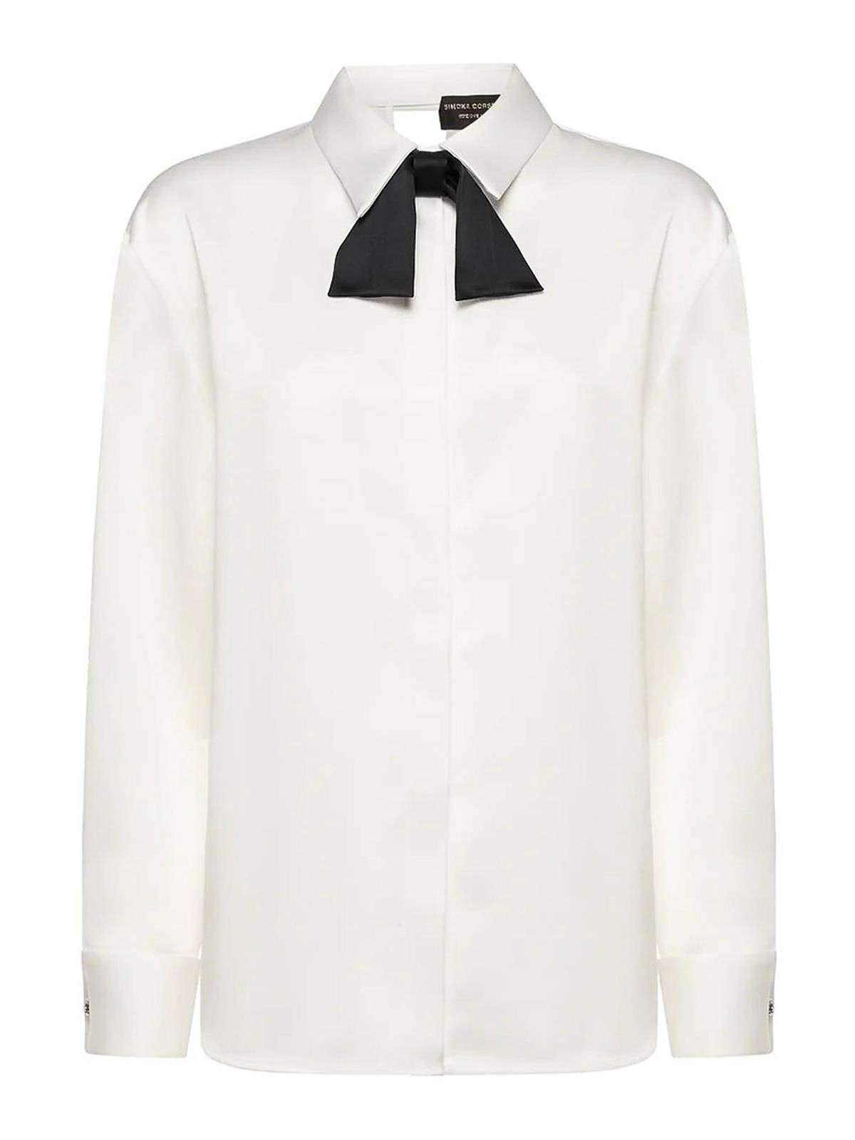 Simona Cotrsellini Smokhemd mit ungebundener schwerer Satinfliege, tiefer Öffnung auf der Rückseite, spitzem Kragen, Fliege mit Riemen, verdecktem Knopfverschluss vorne und goldenen Manschettenknöpfen, abgerundeter Saum.