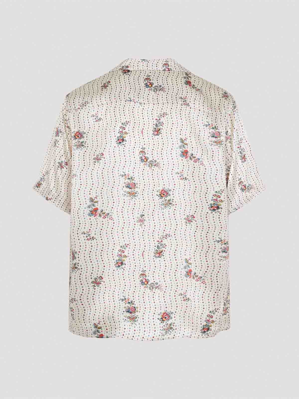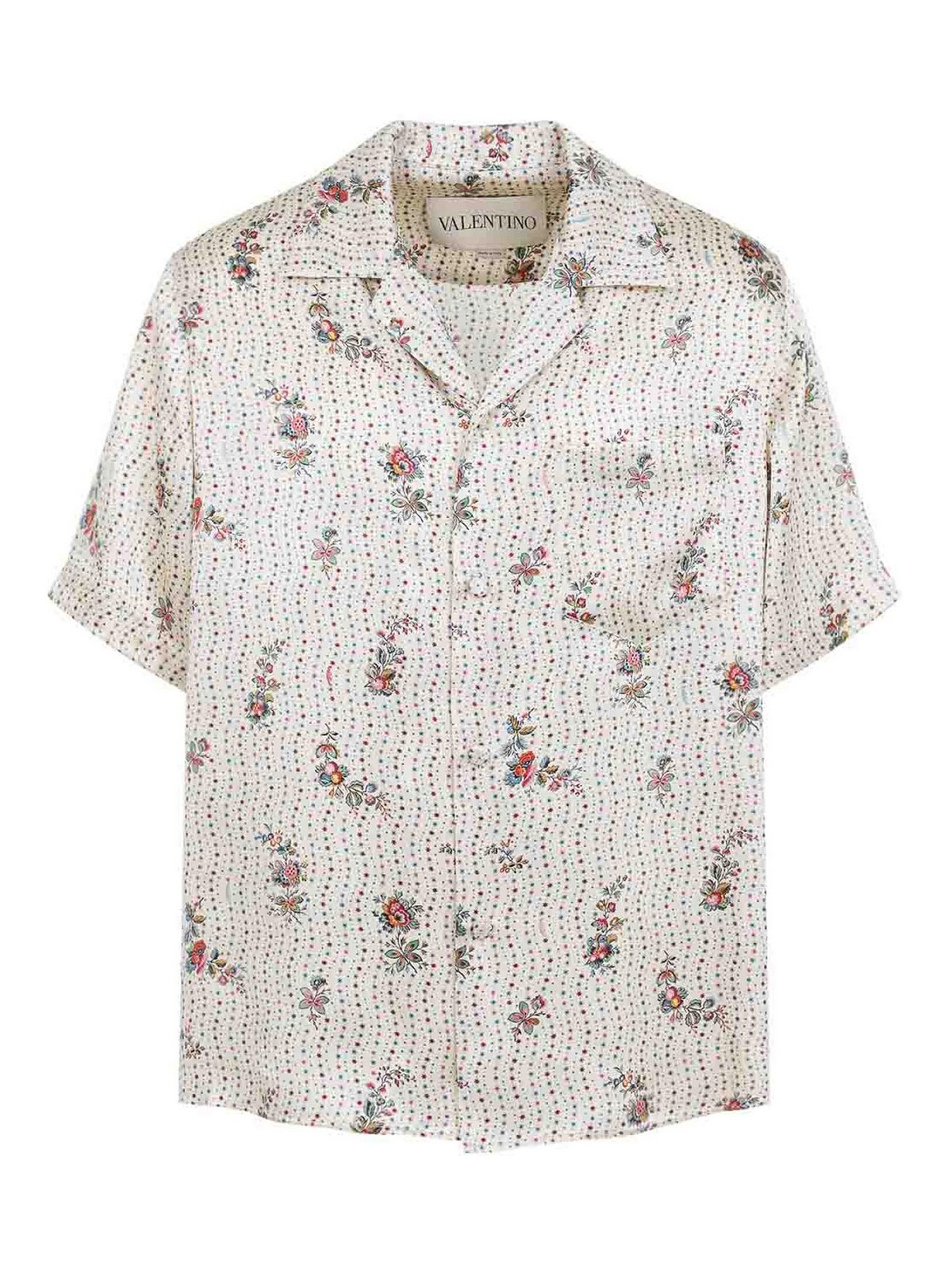 Weißes Seidenhemd von Valentino. Hergestellt aus weißem Seidensatin mit dem charakteristischen Papierblumendruck überall. Es verfügt über einen Bowlingkragen, einen Knopfverschluss auf der Vorderseite, eine aufgesetzte Brusttasche, kurze Ärmel, eine Rückenpasse und eine kastenförmige Passform.