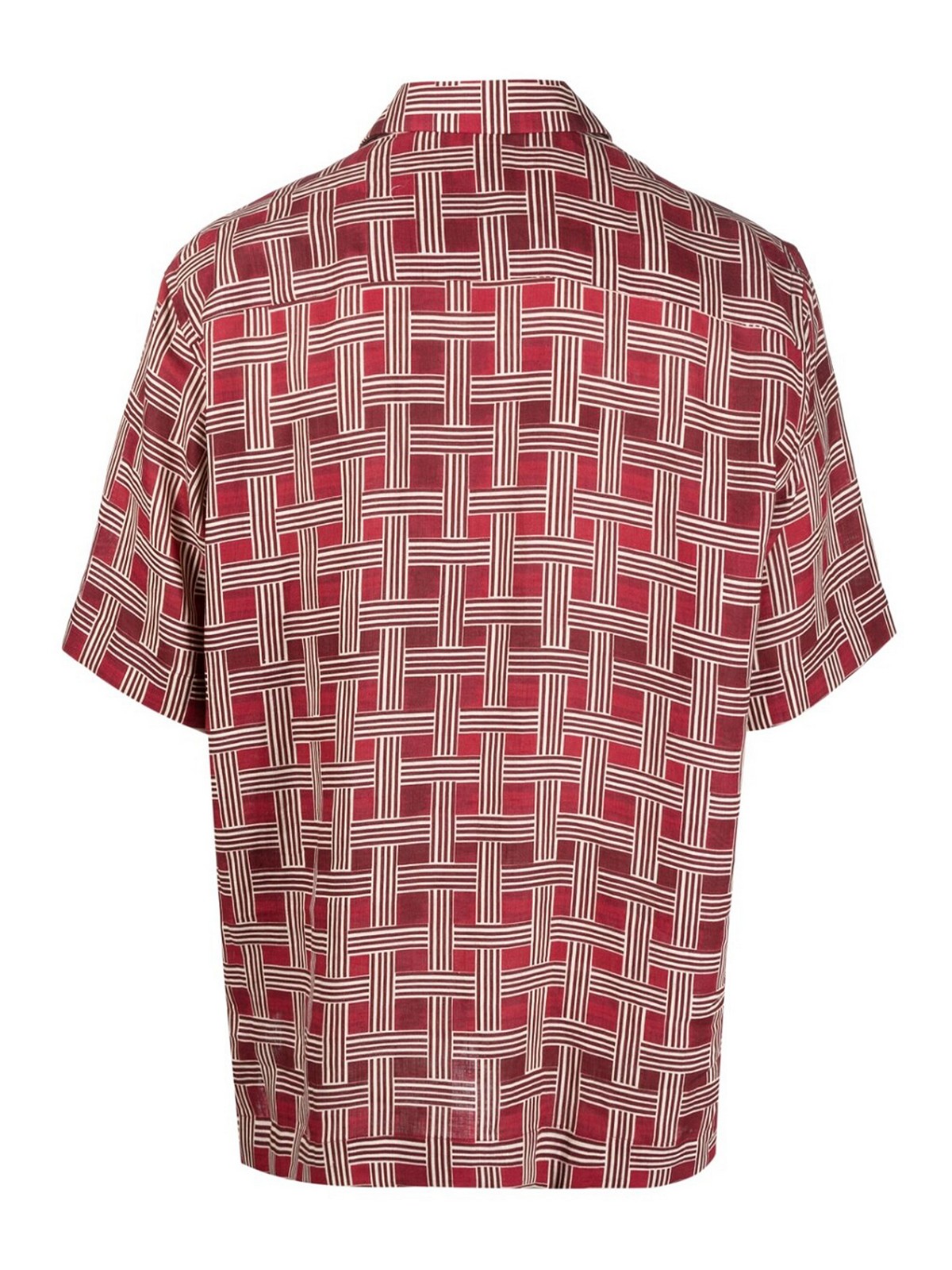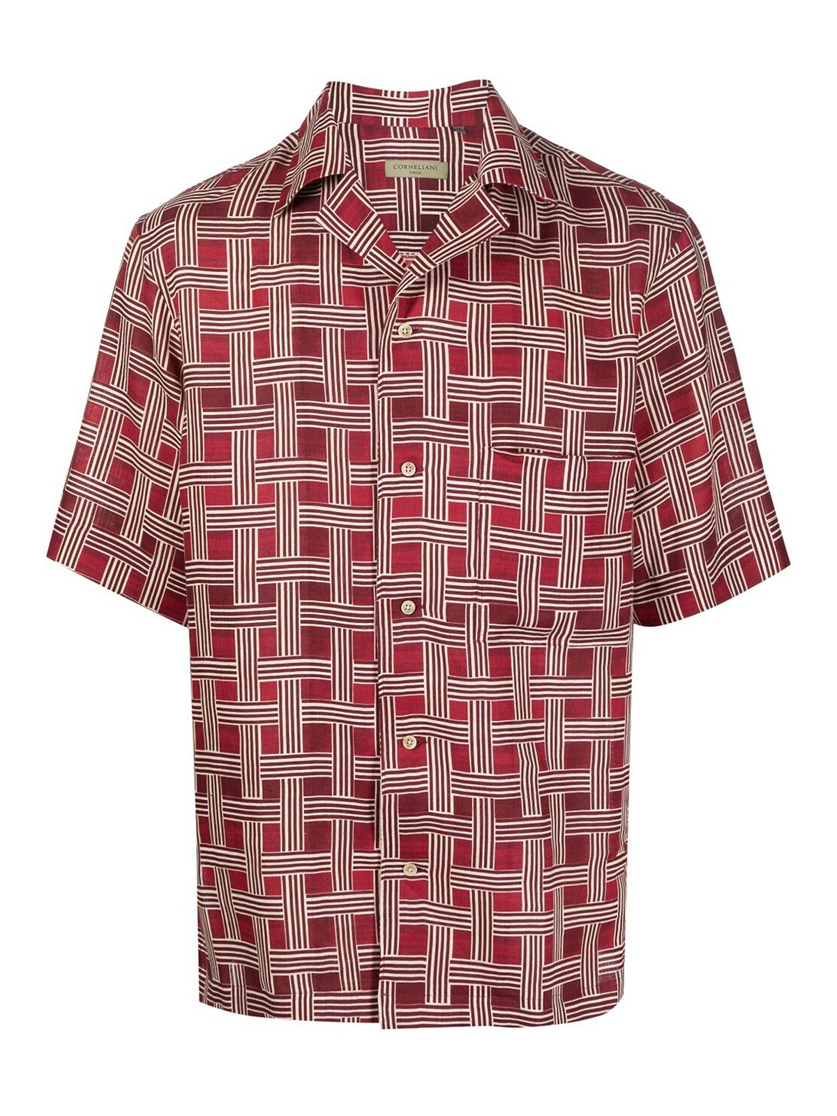 Gestreiftes Leinenhemd von Corneliani mit folgenden Eigenschaften: bordeauxrotes, beigefarbenes Leinen/Flachsmuster, gekerbter Kragen, Knopfverschluss vorne, kurze Ärmel, aufgesetzte Brusttasche und gerader Saum, Größe: Hemd