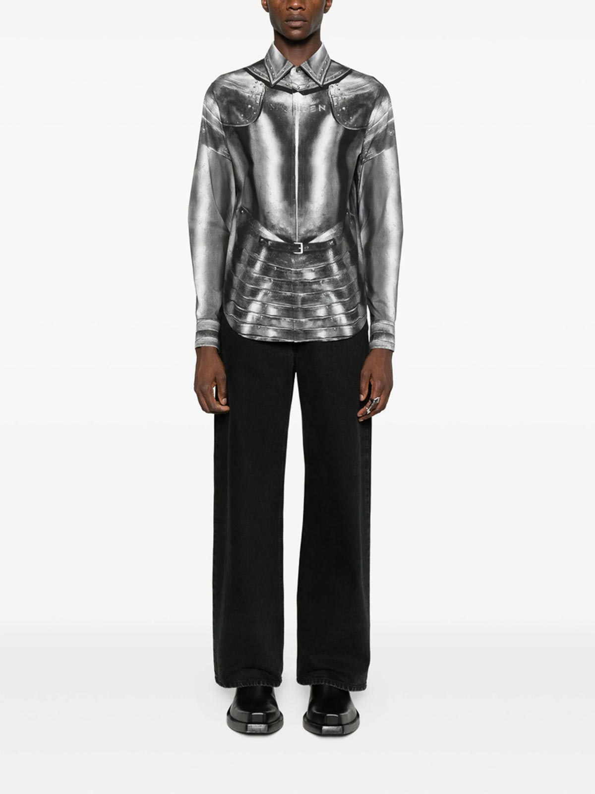 Graue, durchgehende Rüstung mit Knöpfen und langen Ärmeln und geknöpften Manschetten