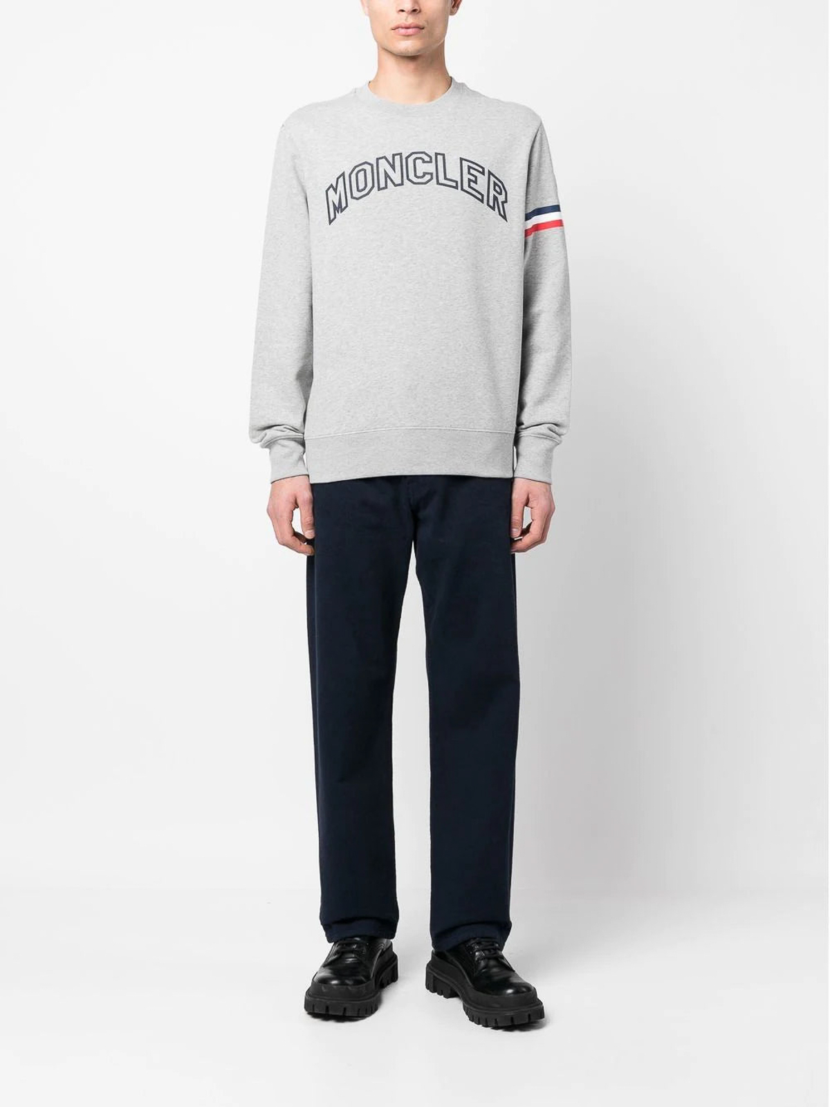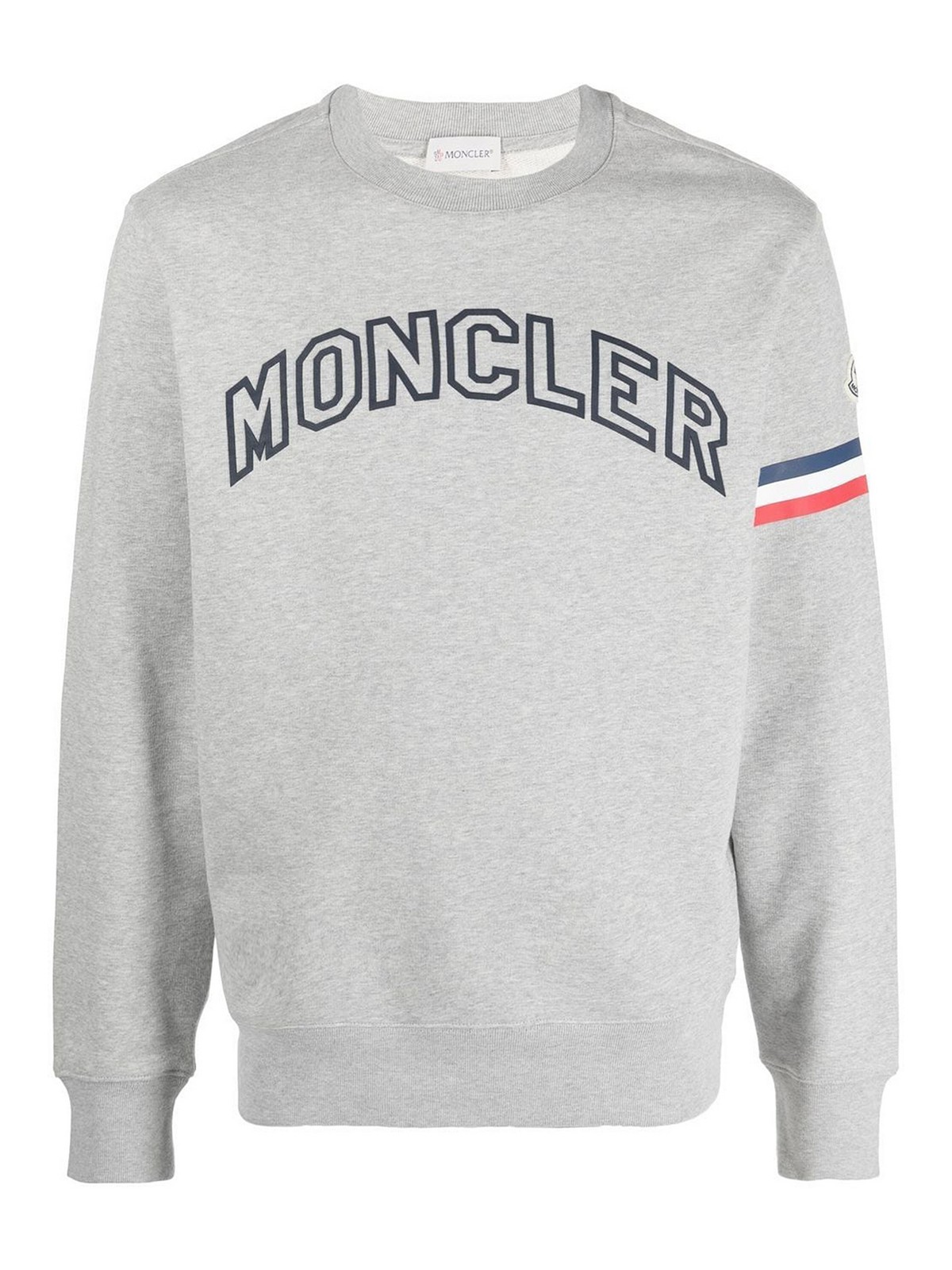 hellgraue Baumwolle, Logo-Prägung auf der Vorderseite, Applikation, Logo-Grafikprint, Ärmel, Rundhalsausschnitt, lange Ärmel, gerippte Ärmelabschlüsse und Saum