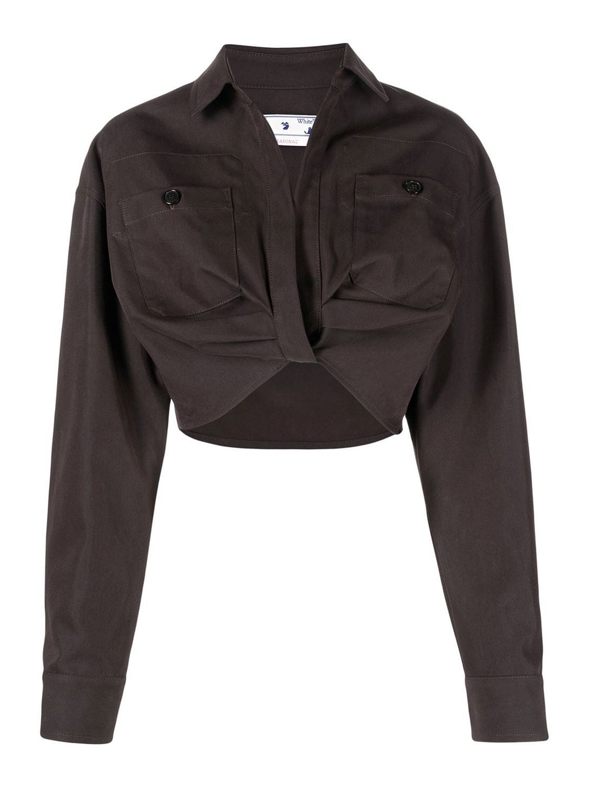 Kurz geschnittenes Langarmhemd von Off-White aus dunkelgrauem Baumwollmischgewebe, kurz geschnittene, geraffte Details, klassischer Kragen, lange Ärmel und zwei aufgesetzte Fronttaschen