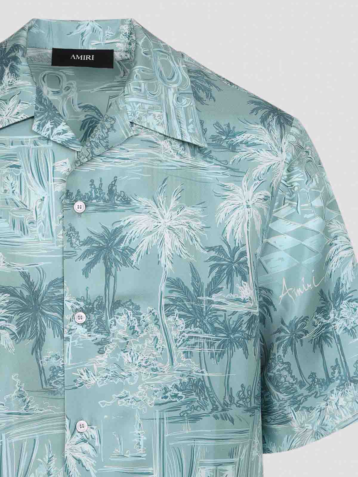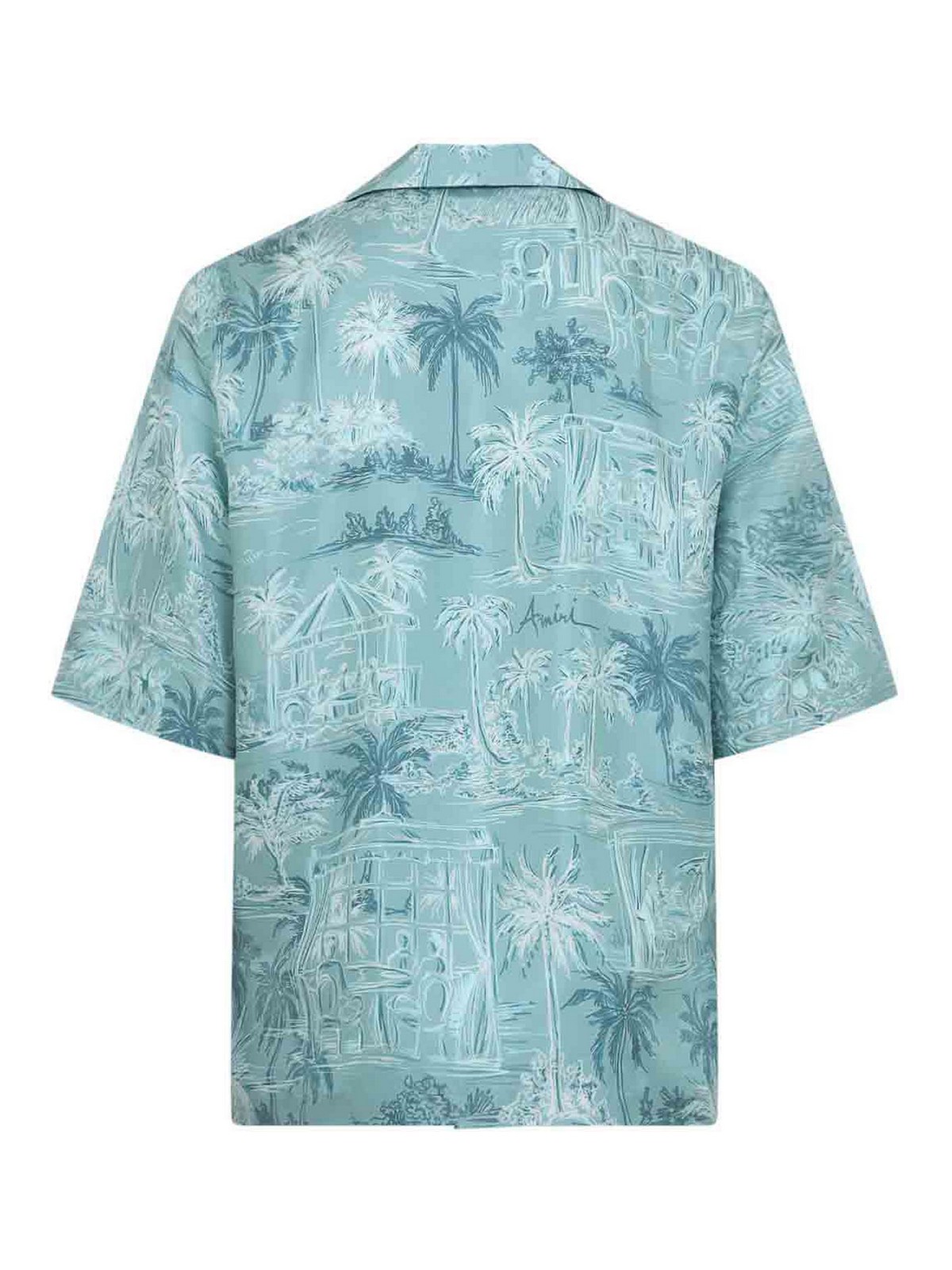 Amiri Bowlinghemd aus blaugrüner Seide mit Chateau-Sketch. Blaugrünes Hemd aus reiner Keramik. Bowlingkragen, Knopfverschluss auf der Vorderseite, kurze Ärmel, gerader Saum. Durchgehend mehrfarbiges blaues Palmendesign.