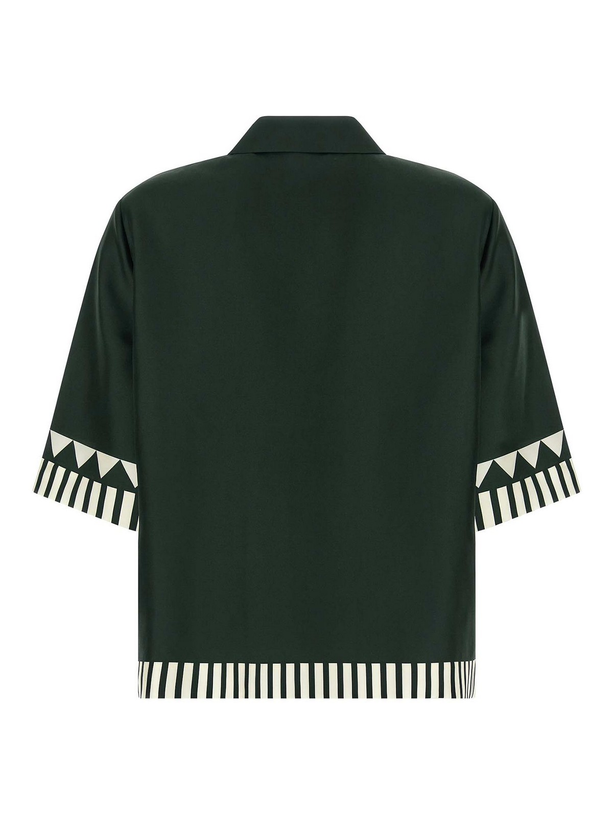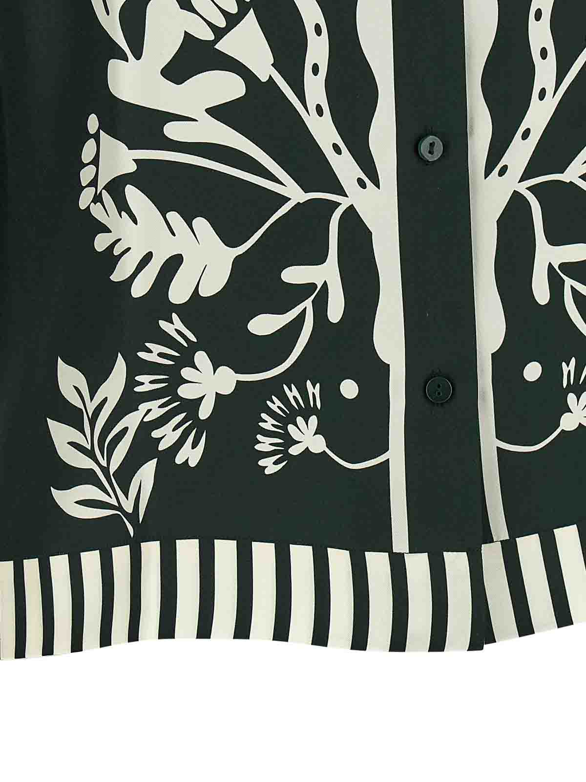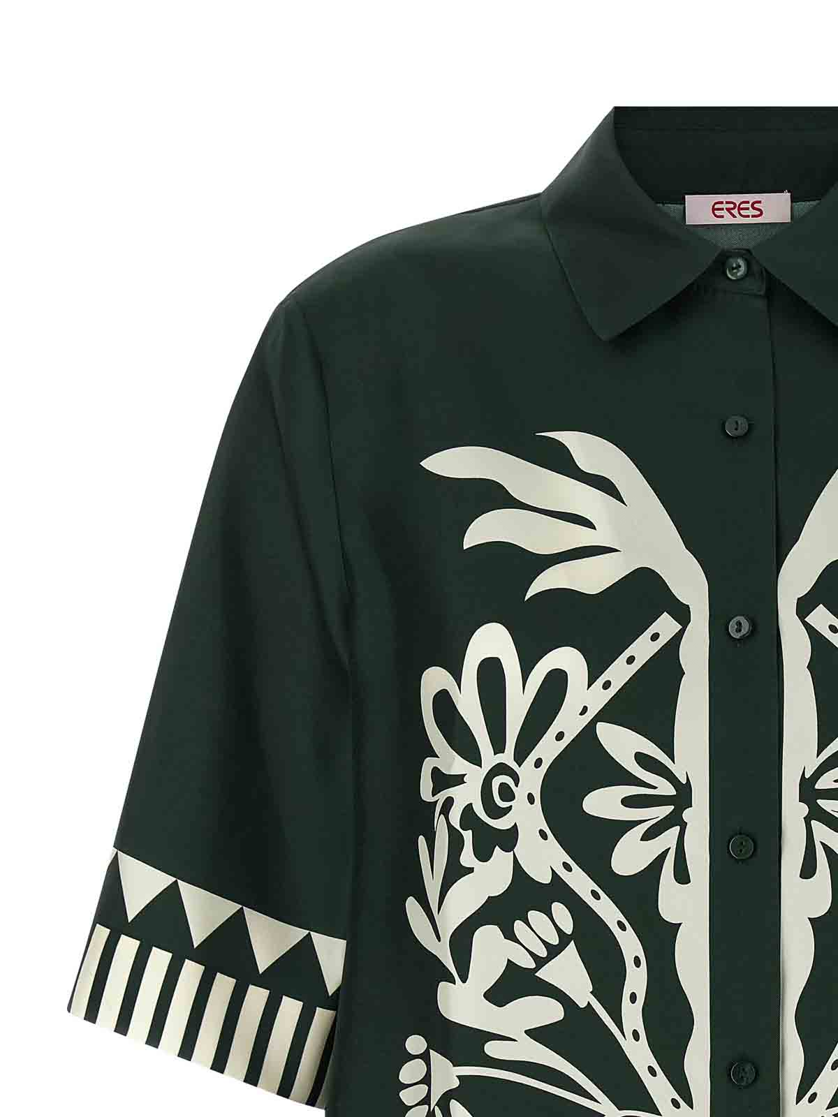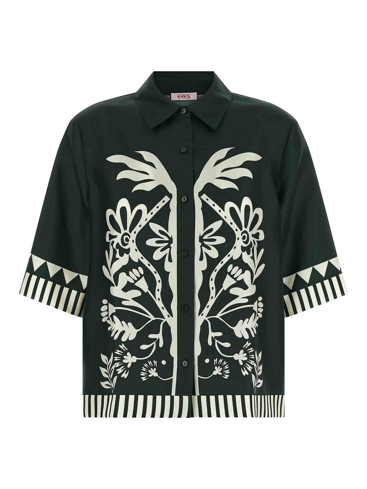 Meraude-Shirt aus Seidentwill mit Panama-Muster, gerade Silhouette, Knopfverschluss auf der Vorderseite, kurze Ärmel.