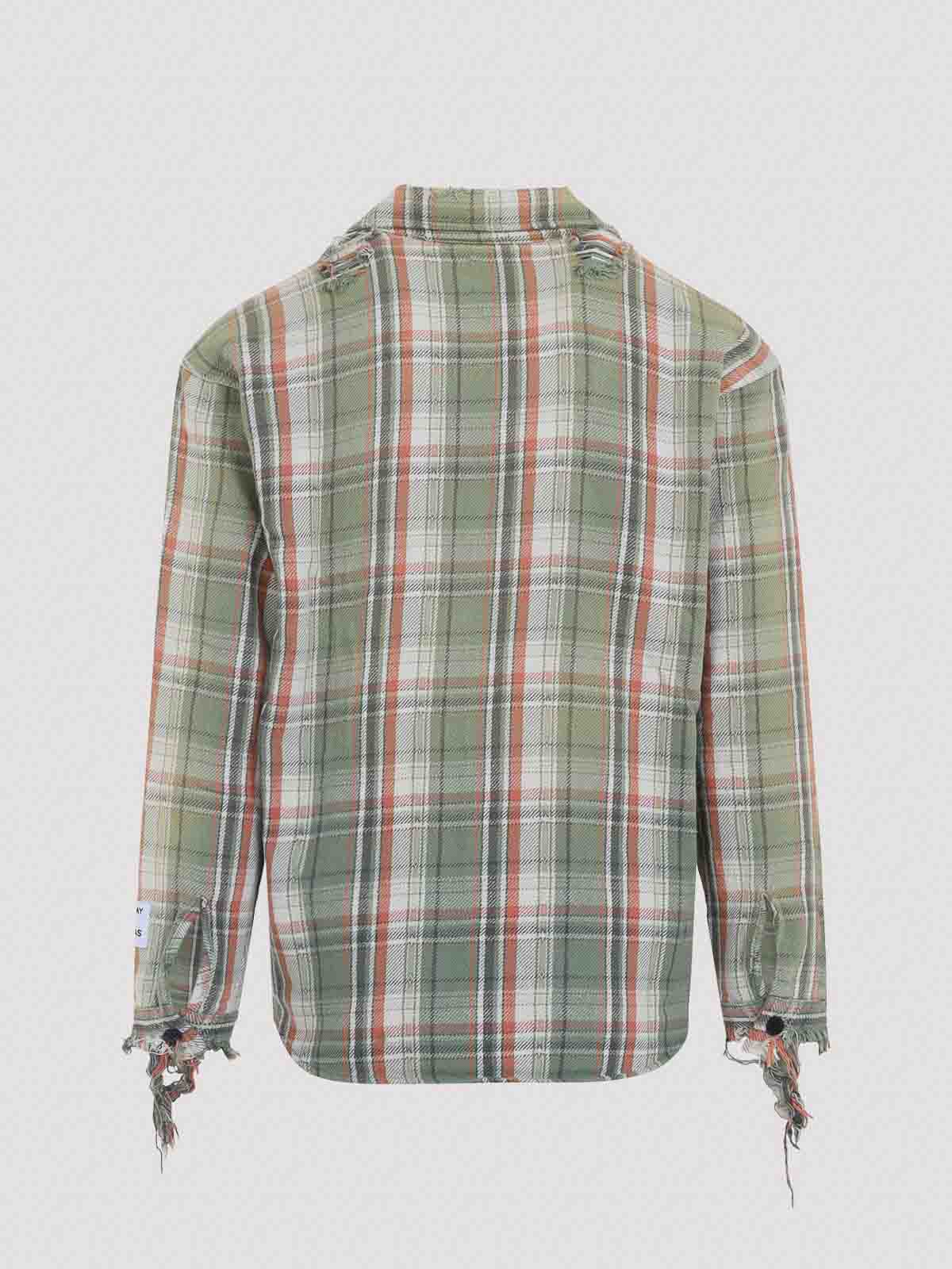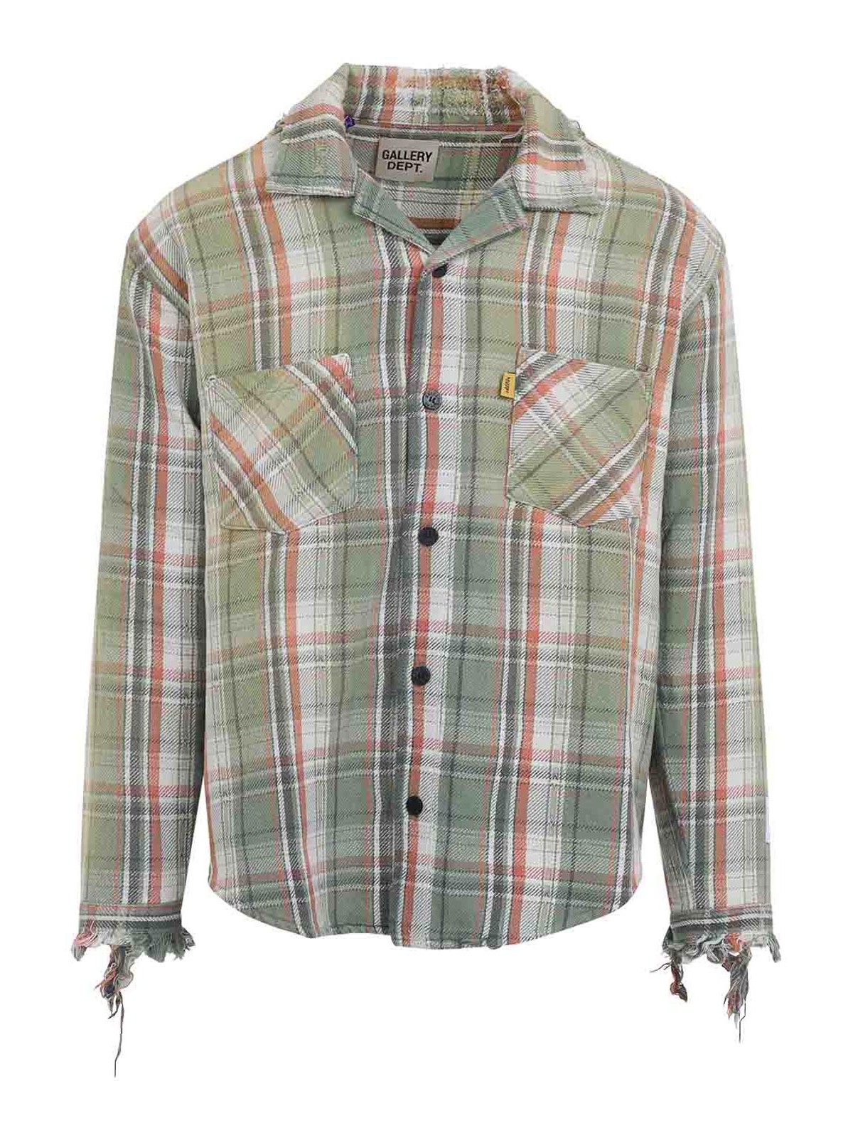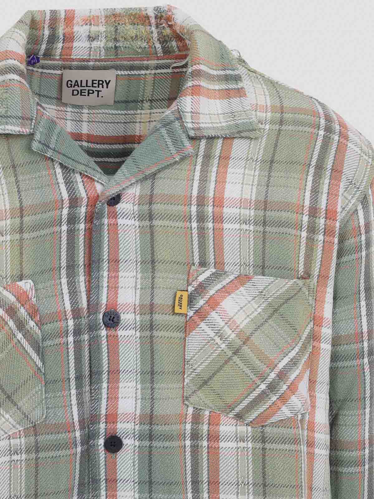 Grünes Flanellhemd von Gallery Dept. Marley. Hergestellt aus verwaschener, grün karierter Baumwolle, spitzer Kragen, zwei Brusttaschen, Knopfverschluss auf der Vorderseite, lange Ärmel, Ärmelabschlüsse und Saum in Used-Optik.