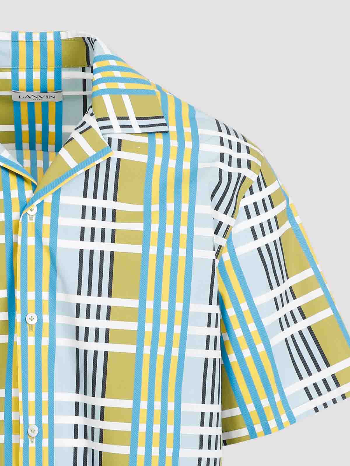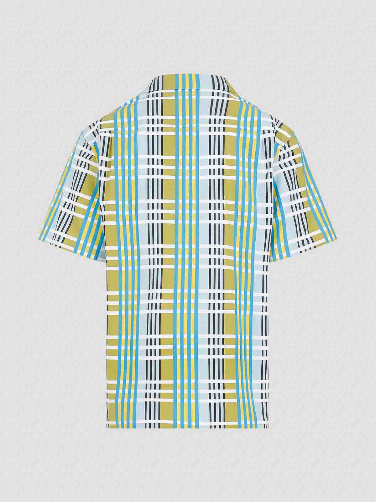 Grünes Bowlinghemd aus Baumwolle mit Aufdruck. Reingrünes Baumwollhemd, spitzer Kragen, Knopfverschluss vorne, kurze Ärmel, gerader Saum. durchgehend grünes, blaues und weißes Karomuster.