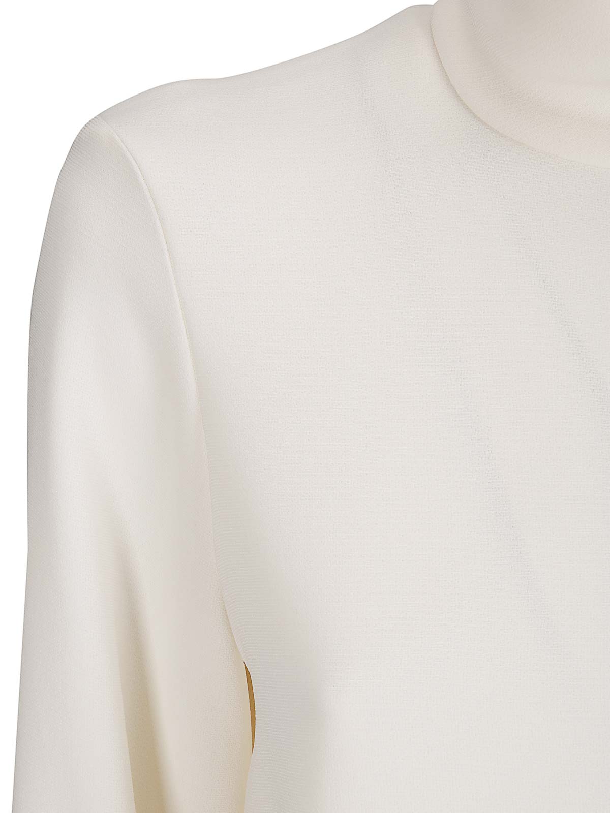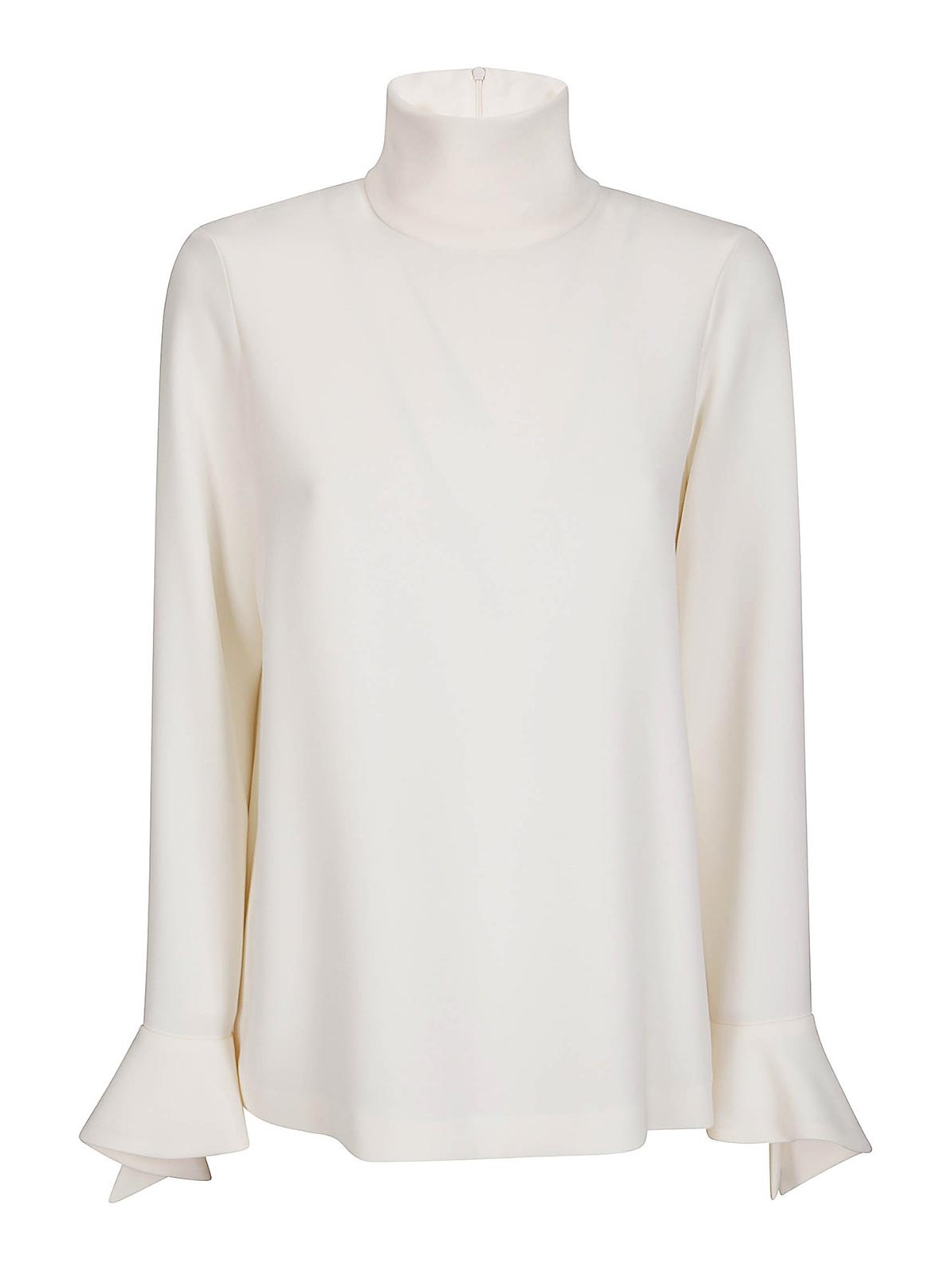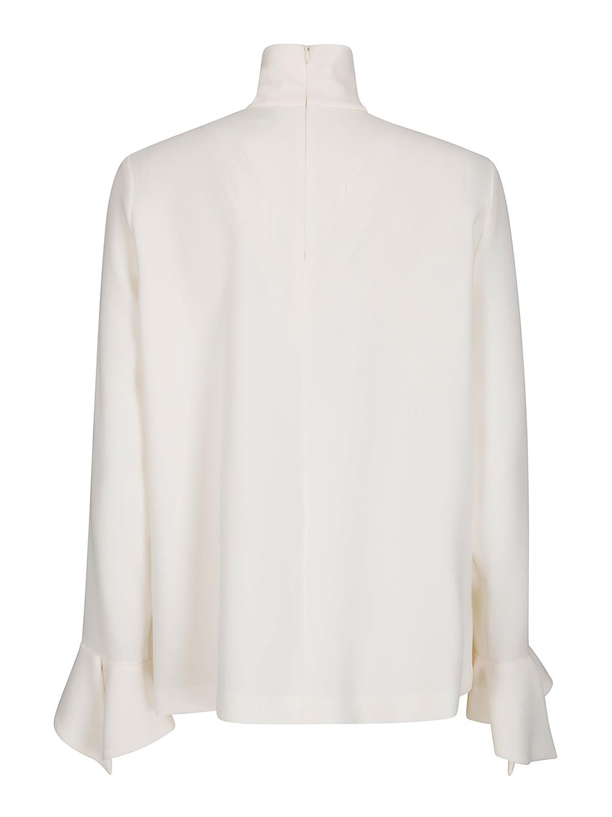 Dickes weißes Hemd mit hohem Kragen und rückseitigem Reißverschluss, Ärmeln mit Glockenenden.