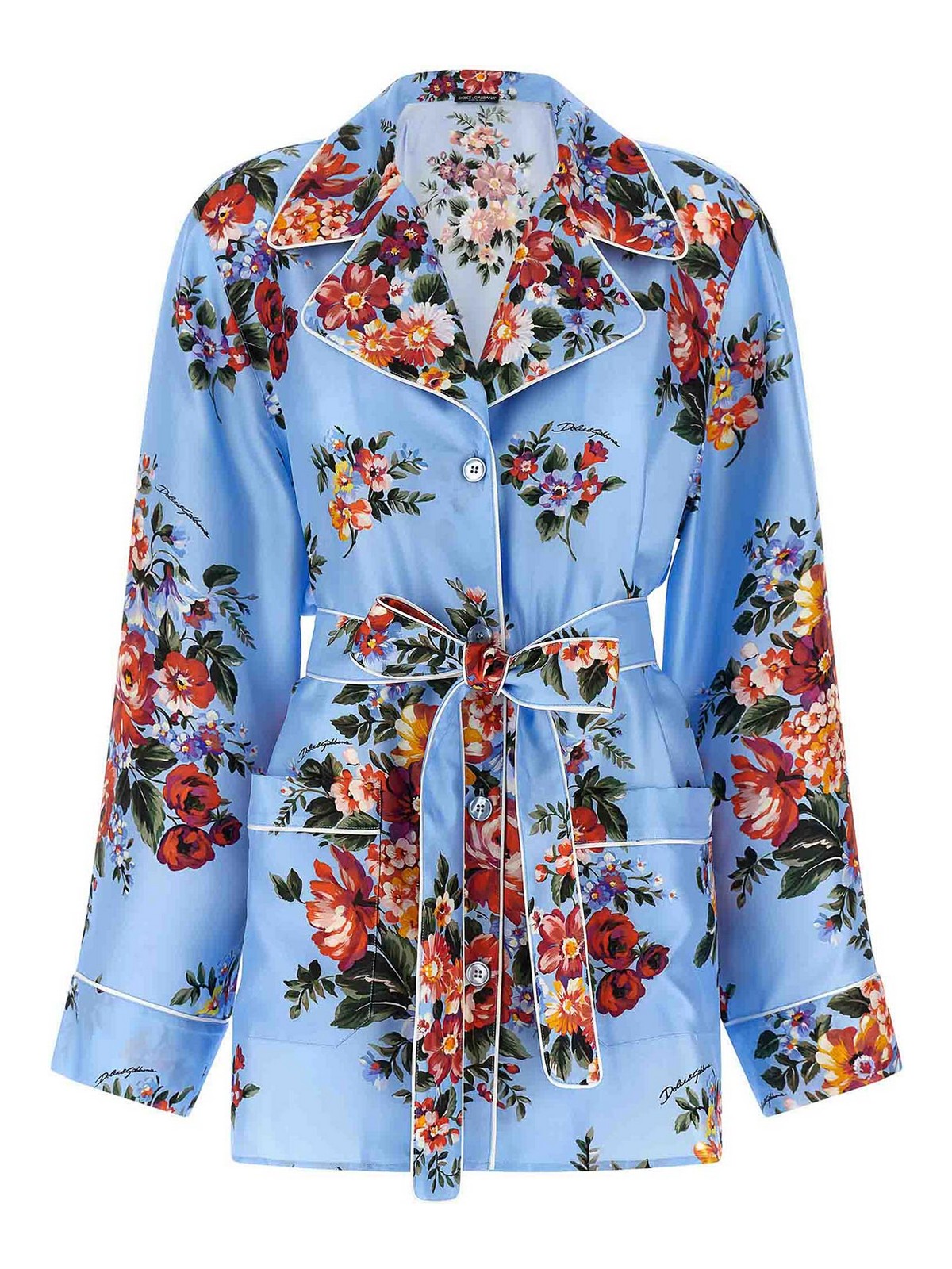 Bluse aus Seidentwill mit durchgehendem „Mazzo di Fiori“ -Print, kontrastfarbener Paspelierung, „Vanity“ -Stil, Reverskragen, Perlmuttknopfverschluss auf der Vorderseite, Taschen, lange Manschettenärmel, abnehmbarer passender Gürtel. Die Unterschiede in der Platzierung des Drucks, die Sie auf diesem Produkt finden, sind charakteristisch für die handgefertigten Produkte von Dolce&Gabbana. Eine Besonderheit, die jedes Kleidungsstück oder Accessoire einzigartig und exklusiv macht.
