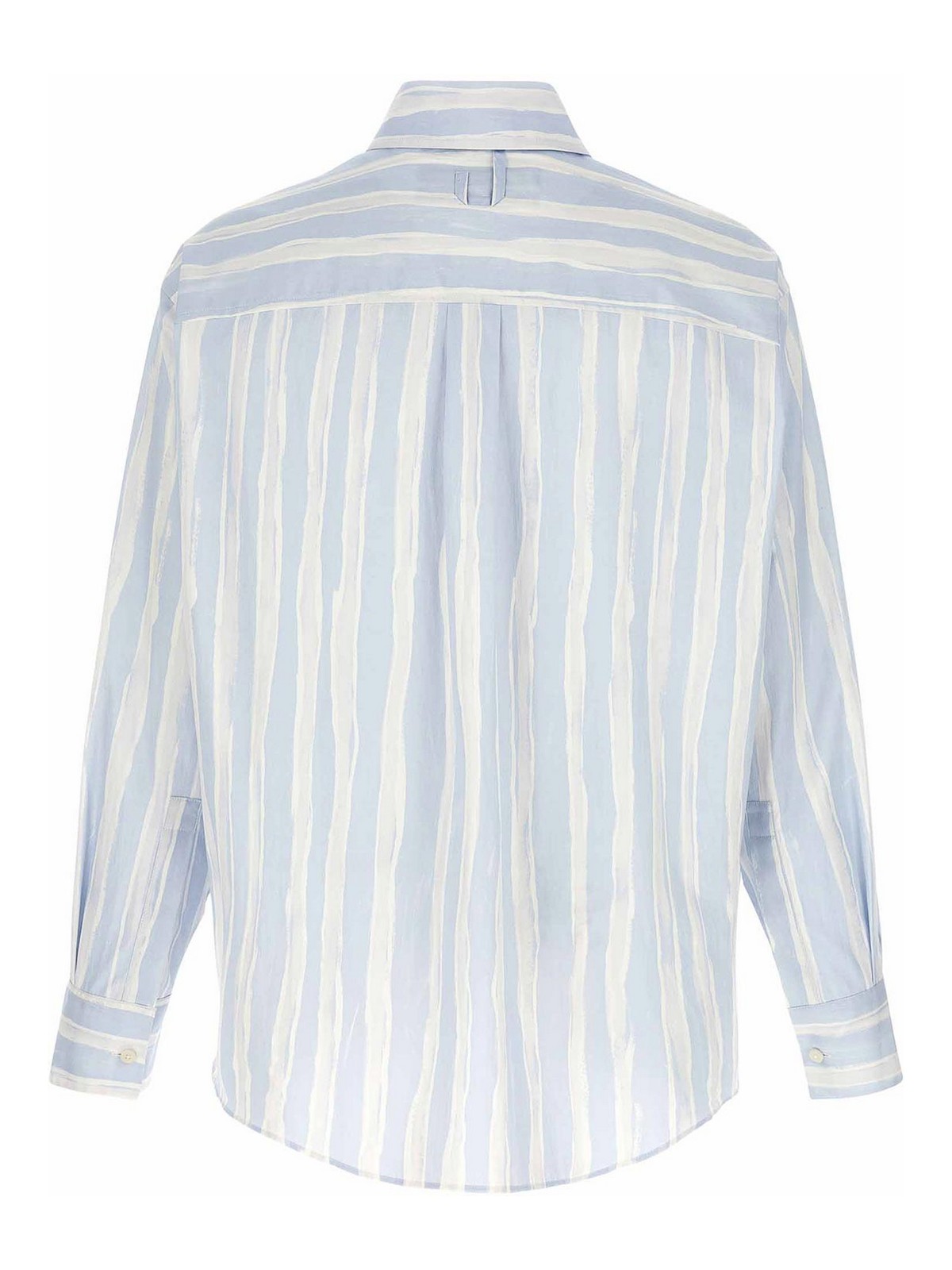 La Chemise Camargue, gestreiftes Hemd aus Baumwollpopeline mit Farbeffekt, Tasche mit Logostickerei, Knopfverschluss auf der Vorderseite, lange Ärmel mit Manschetten und abgesenkten Schultern, asymmetrischer Saum.