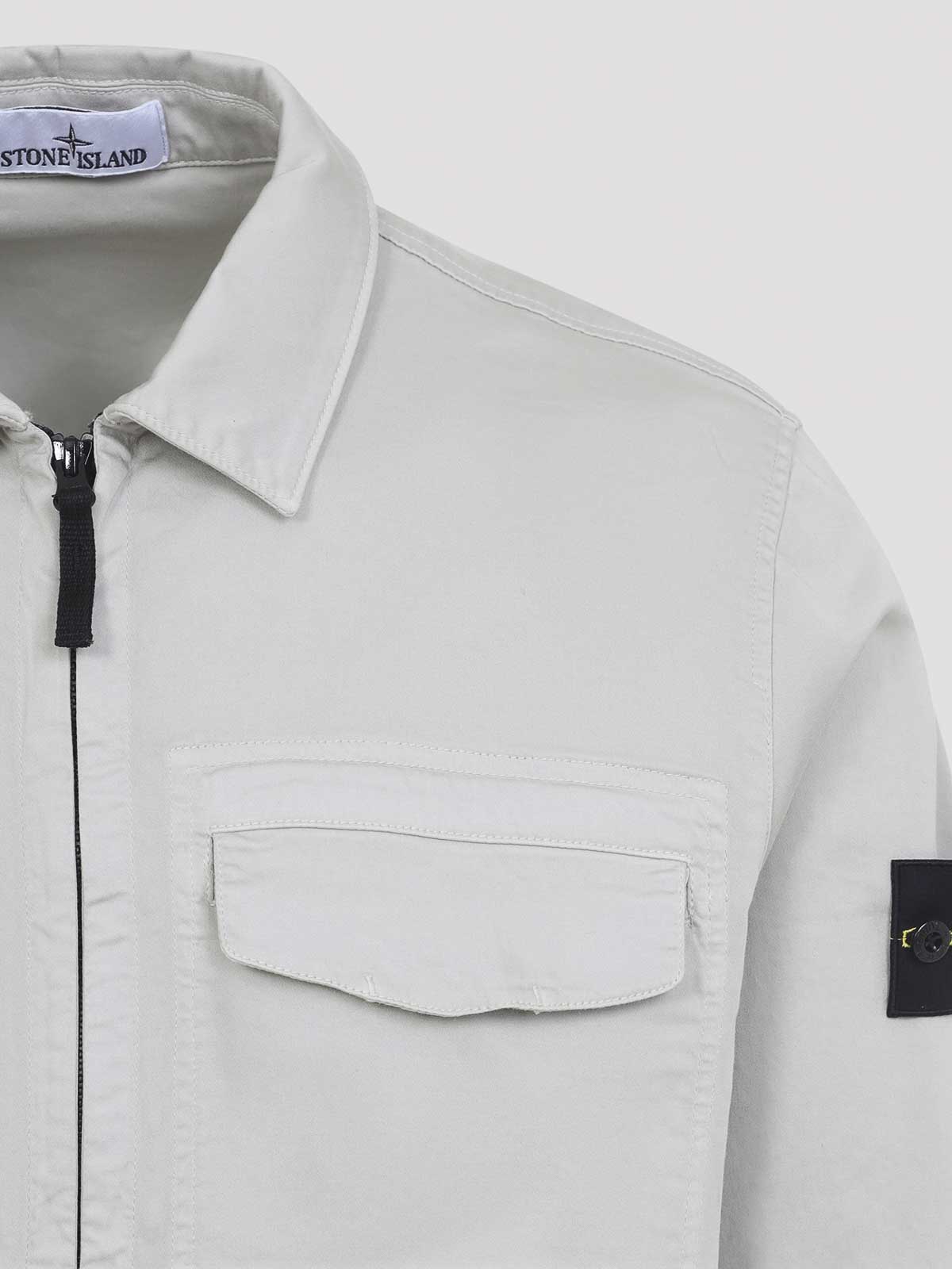 Stone Island Baumwolle in Perlgrau. Hergestellt aus einer Mischung aus Baumwolle und Elastan. Spitzkragen, Reißverschluss auf der Vorderseite, Brusttasche mit Pattentasche, Seitentaschen mit Reißverschluss, lange Ärmel, charakteristisches Logo-Patch auf dem rechten Ärmel, geknöpfte Manschetten, gerader Saum.