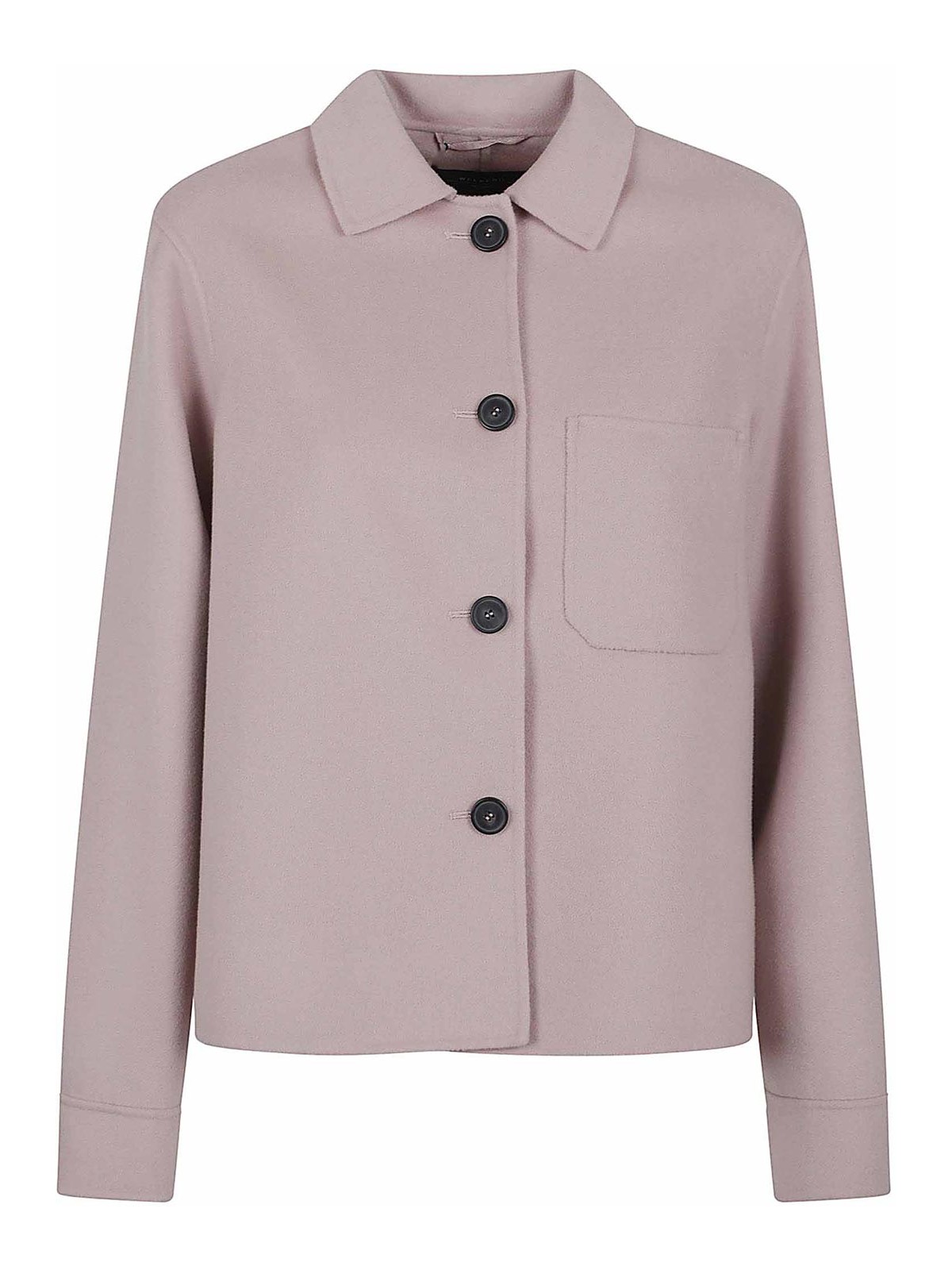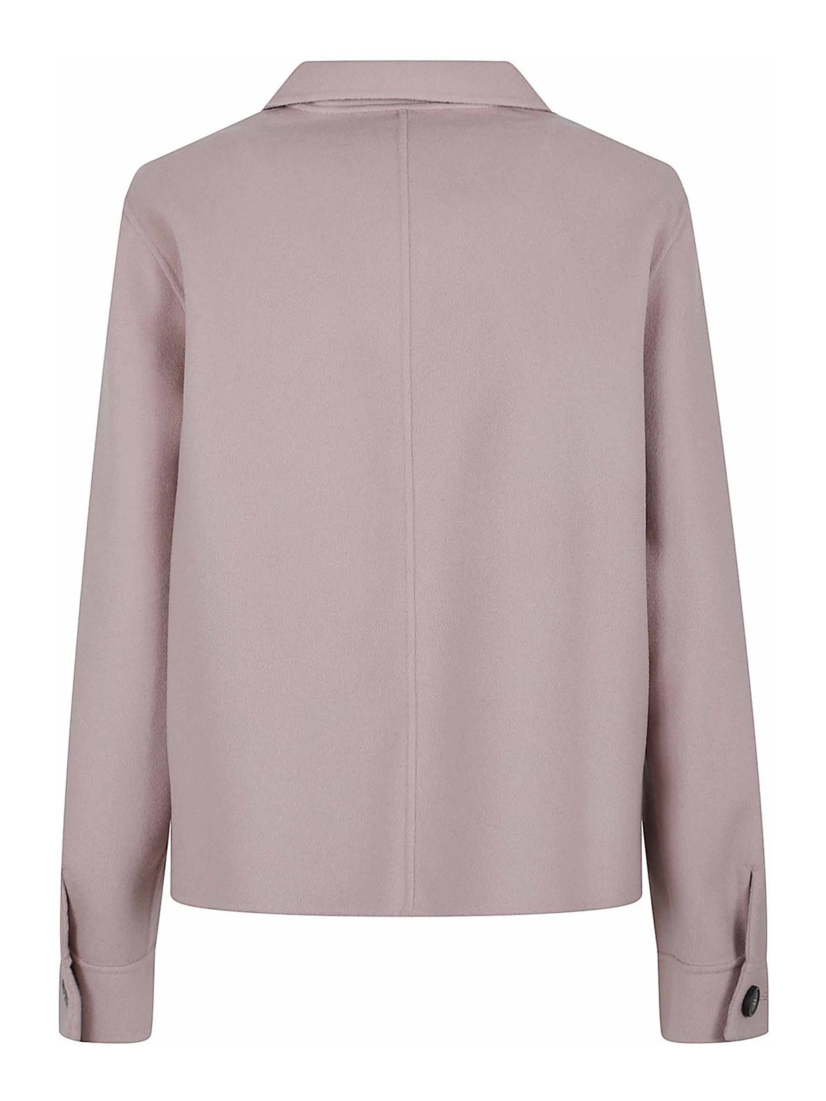 Nordische Jacke aus doppeltem Wollstoff von Weekend Max Mara, lange Ärmel mit abgesenkten Schultern, Frontverschluss mit sichtbaren Knöpfen, klassischer spitzer Kragen, aufgesetzte Brusttasche, Hemdmanschetten mit seitlichem Knopf, einreihiges Design mit leicht ausgestellter Hemdsilhouette.