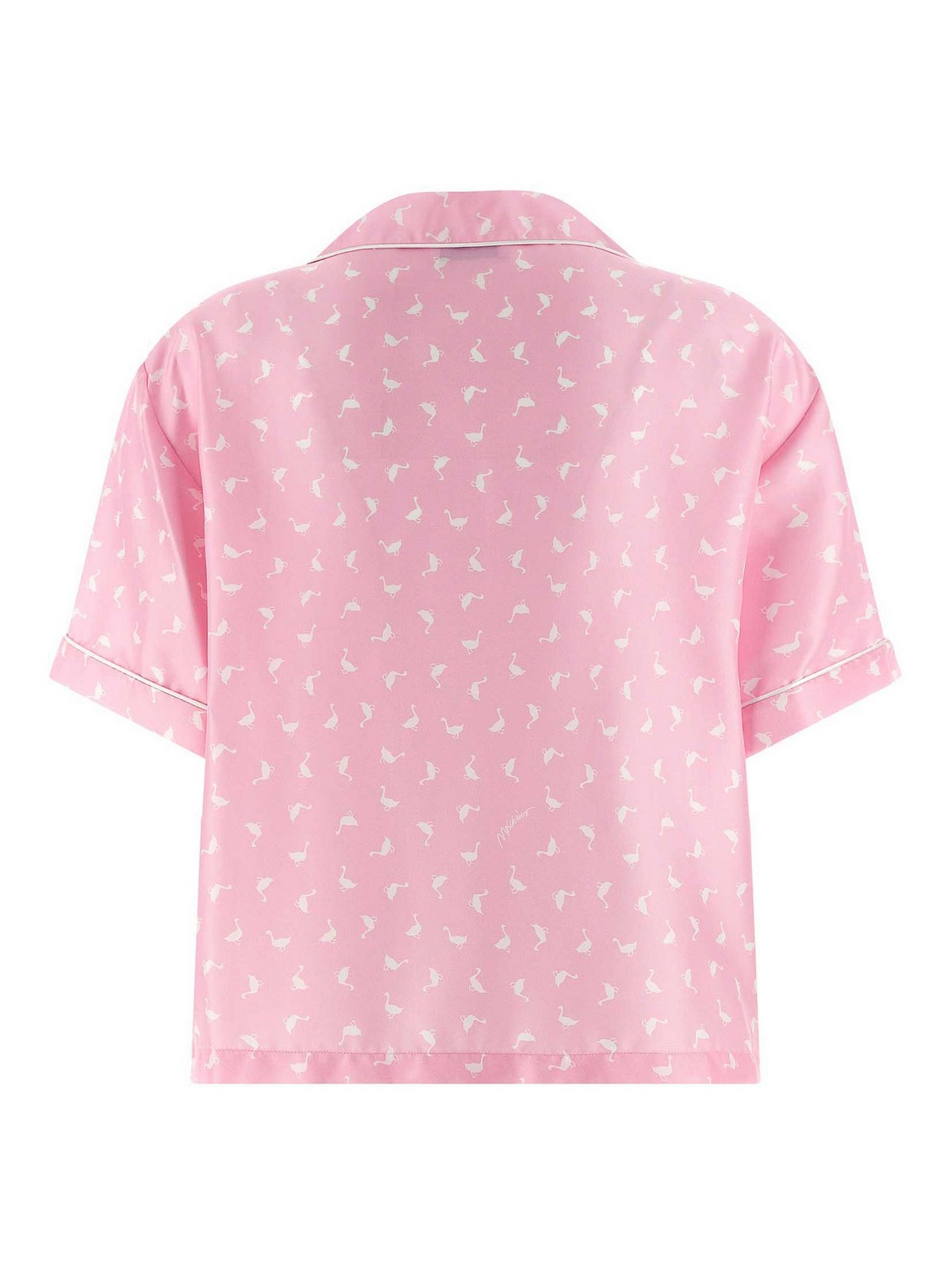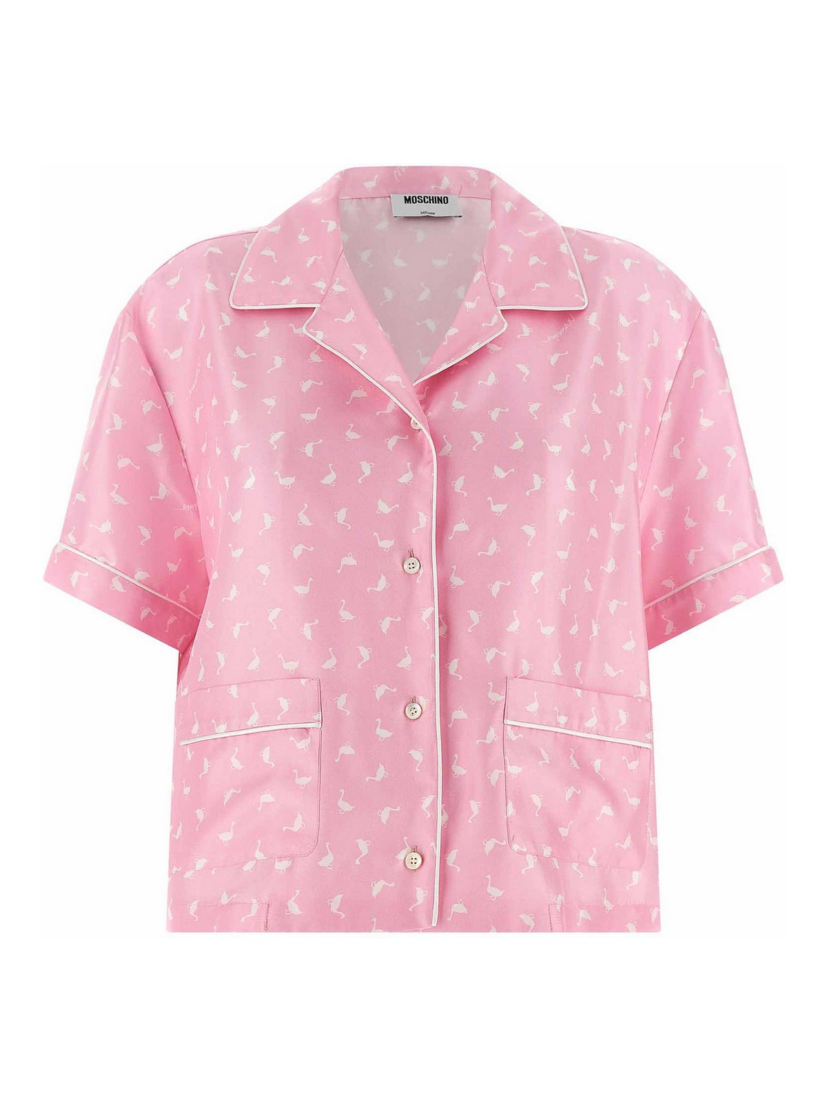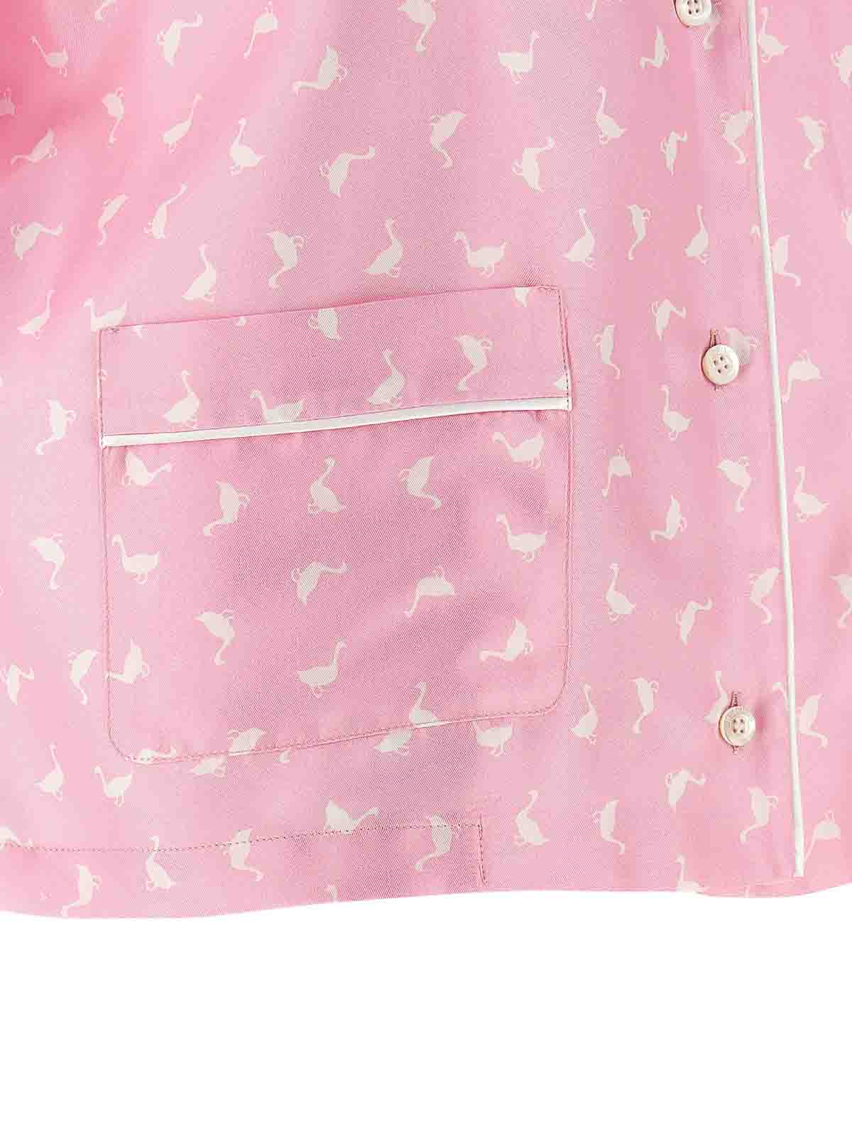 Ganzkörperhemd aus Seidentwill mit Gänse-Print, kontrastierenden einfarbigen Paspelierungen, Pyjama-Crop-Stil, Taschen, Knopfverschluss auf der Vorderseite und kurzen Ärmeln.