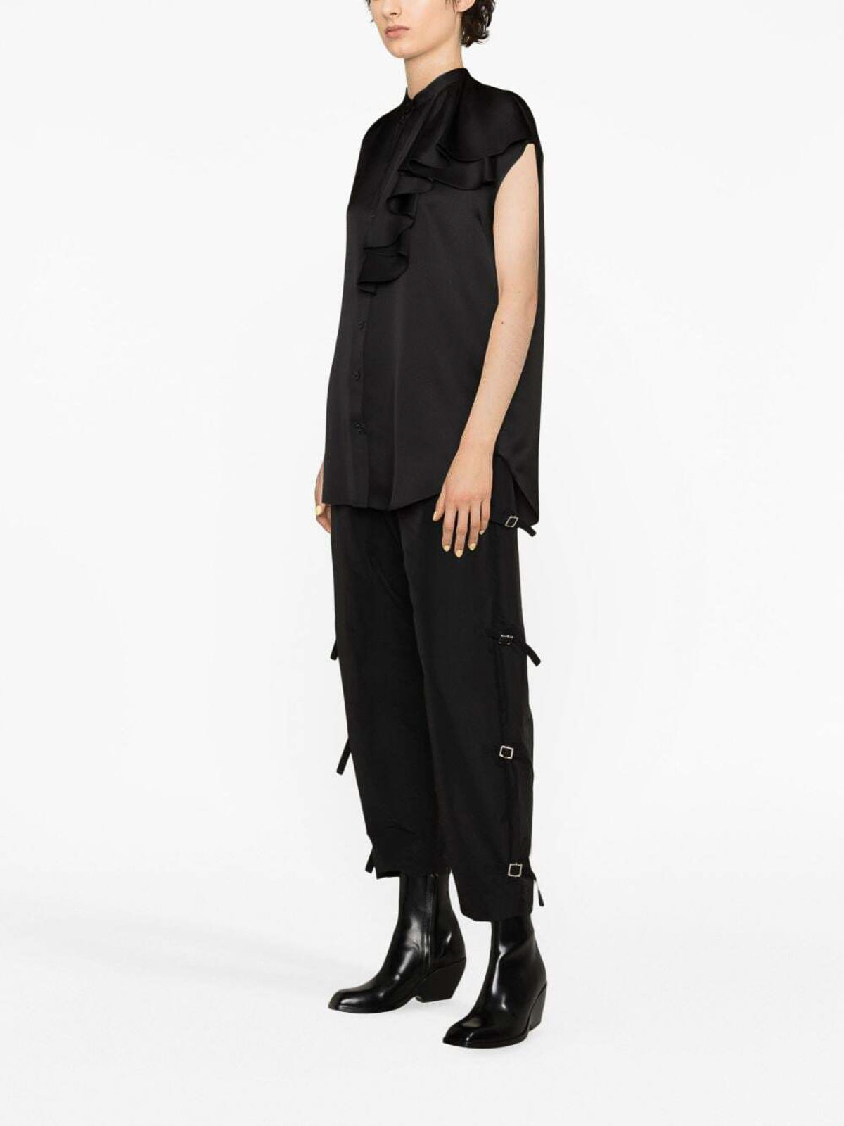Designer-Farbe: Schwarz, Seide, Schwarz, kragenlos, ärmellos, Knopfverschluss vorne, asymmetrischer Rüschenbesatz, geschwungener Saum.