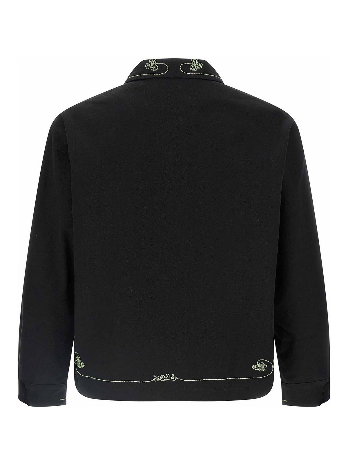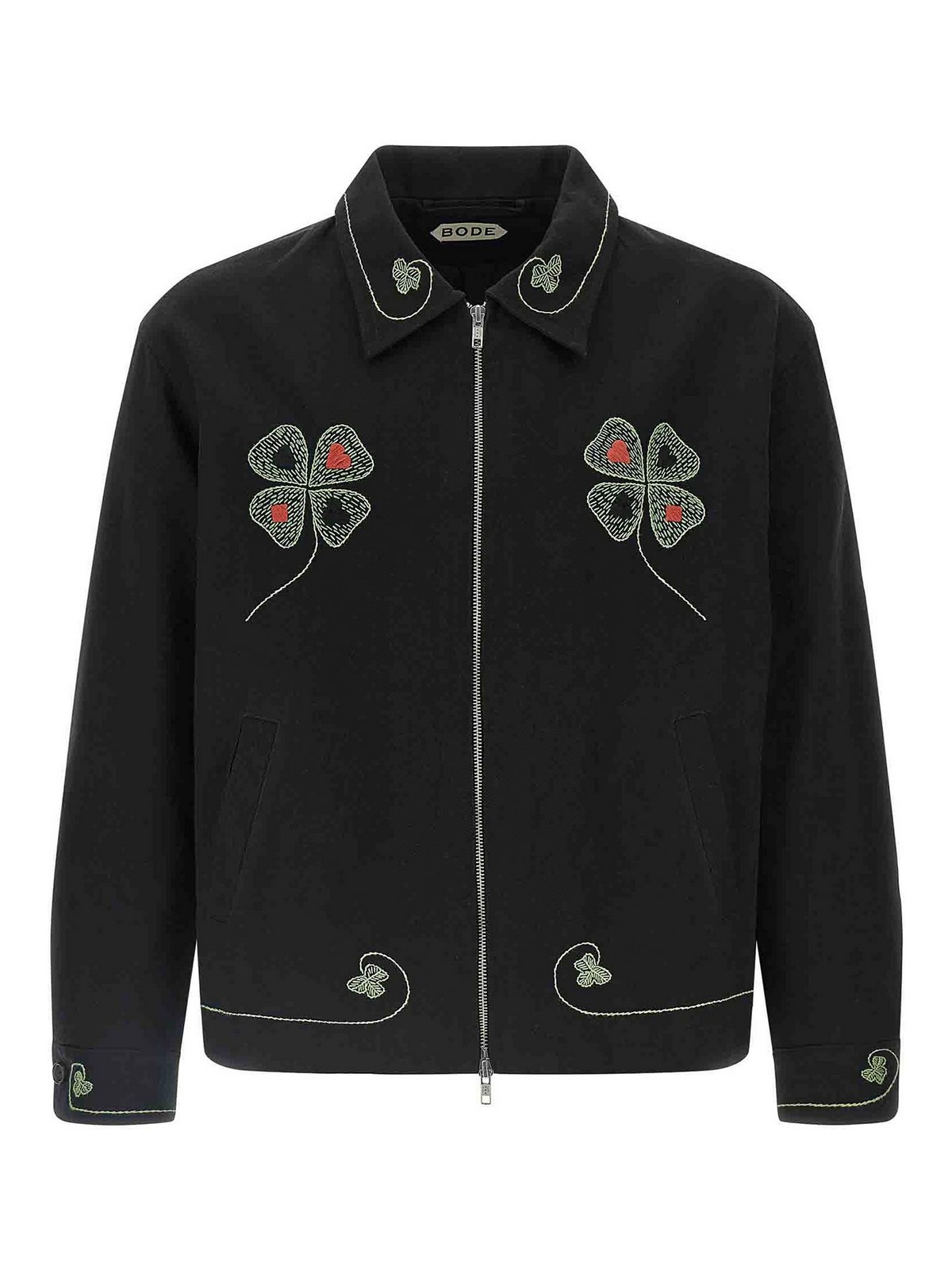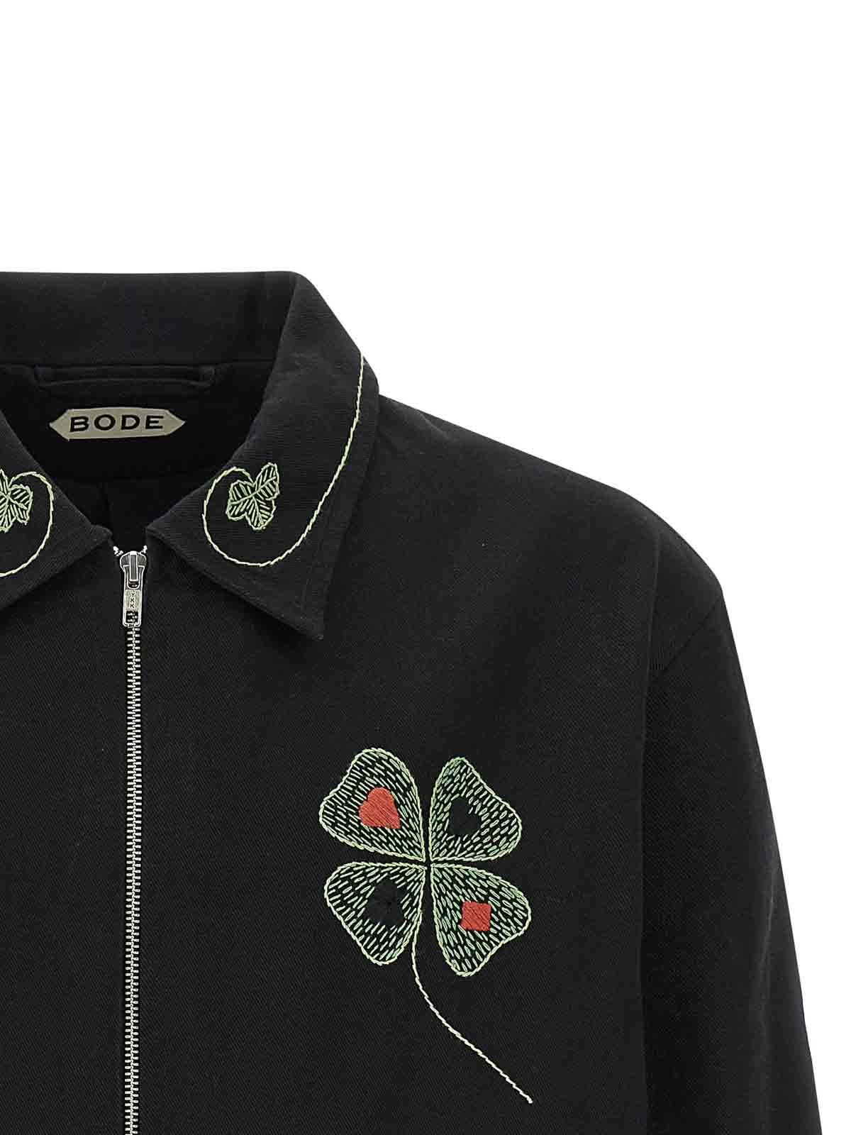'Lucky Draw' Baumwolltwill-Jacke mit Stickmuster Klee und handgefertigten Spielkartenanzügen, Modell für Berufsbekleidung, Hemdkragen, Frontreißverschluss, Taschen, lange Manschettenärmel, Cupro-Futter.