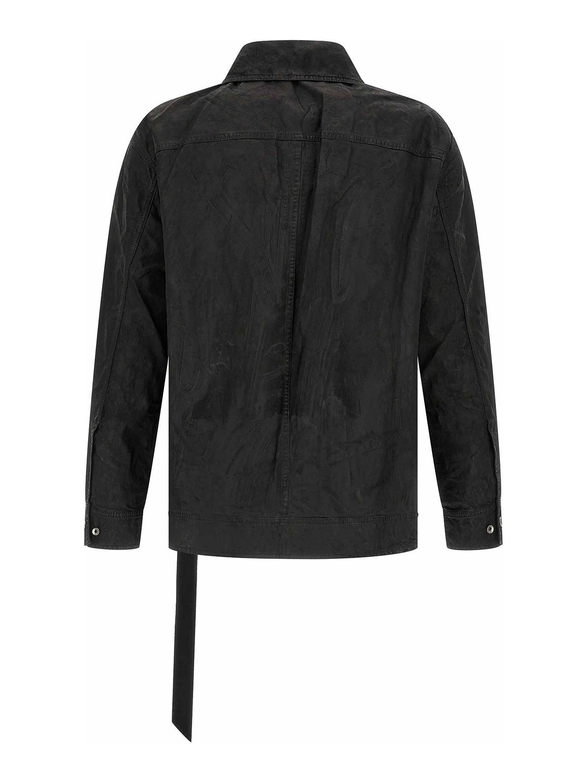 Jumbo-Arbeiterjacke aus Baumwolldenim in beschichteter Optik mit Hemdkragen, Knopfverschluss auf der Vorderseite, Taschen und langen Manschettenärmeln.