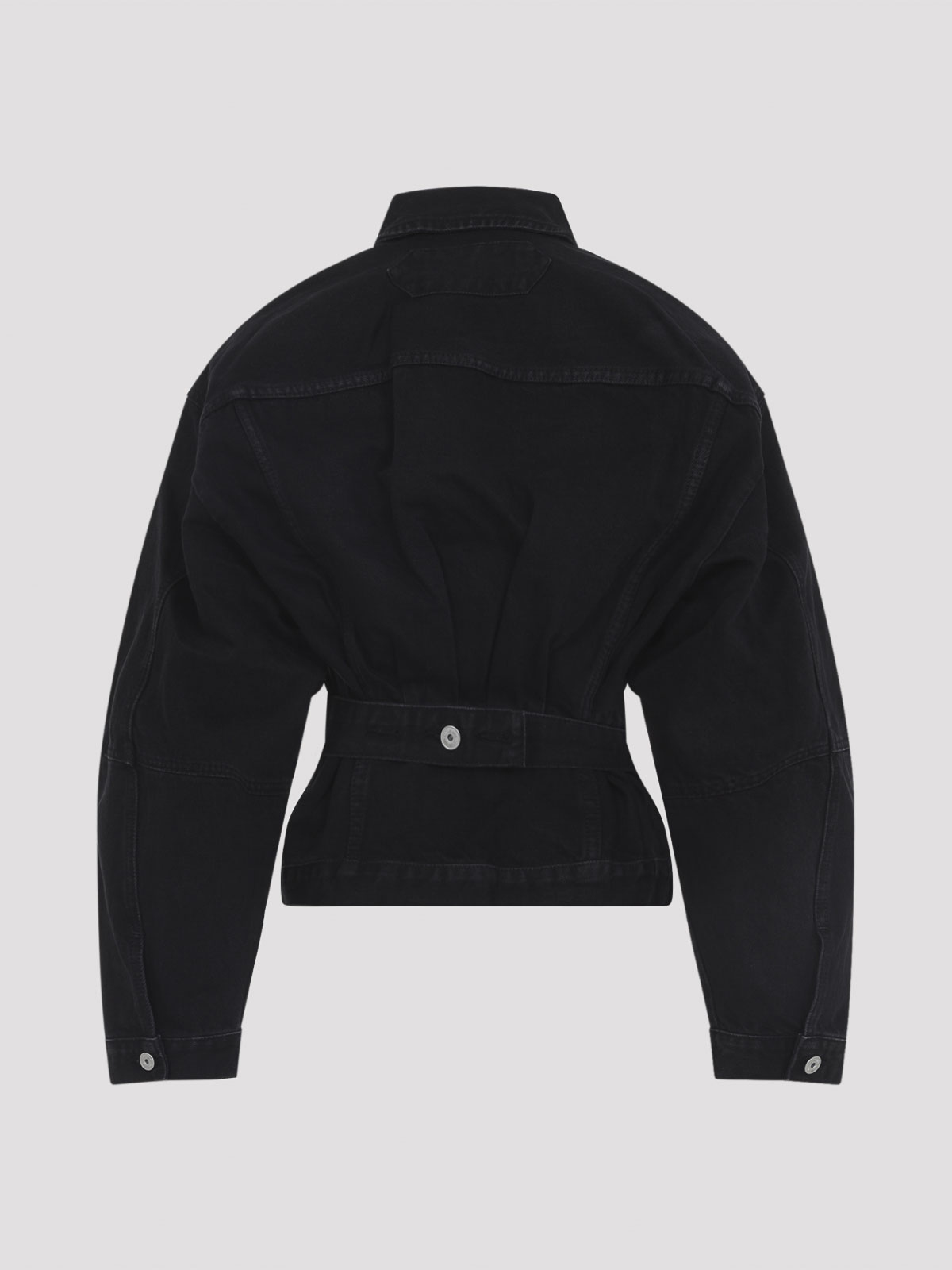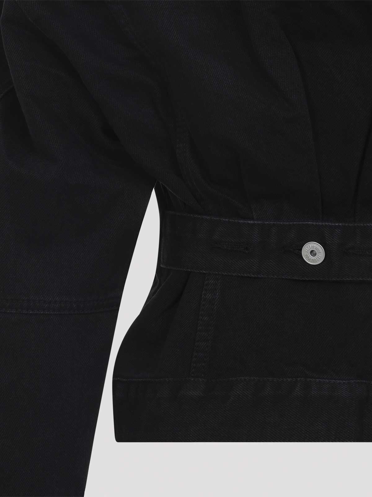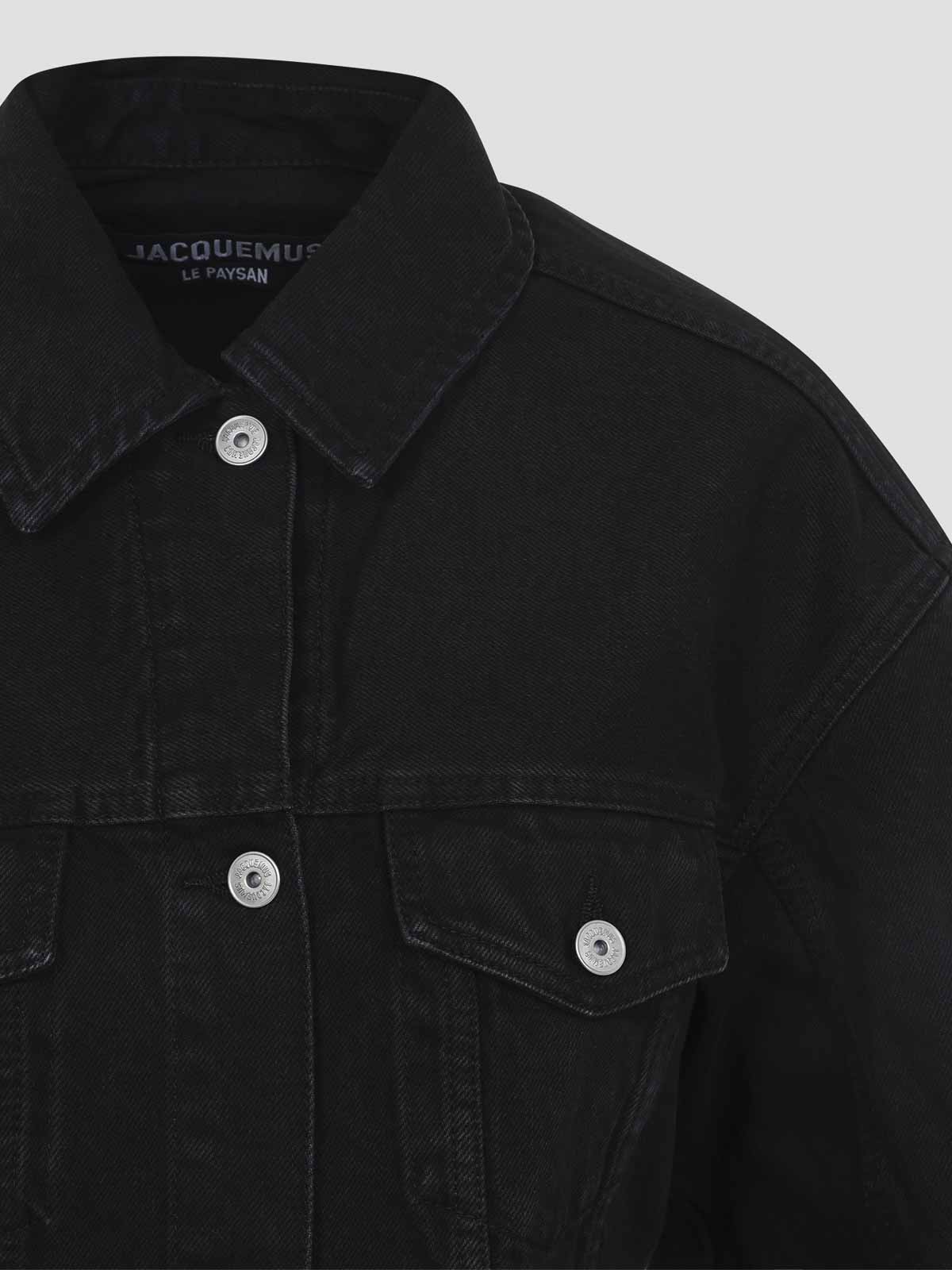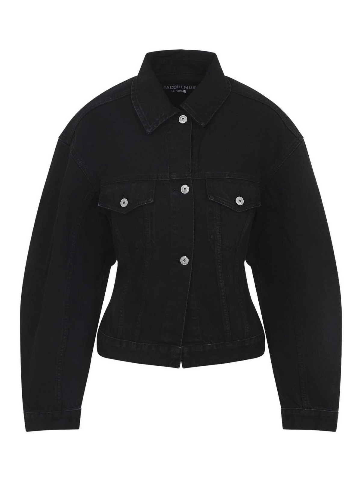 Jacquemus la veste dennimes schwarze Baumwolljacke. Hergestellt aus schwarzem Baumwoll-Denim, mit Hemdkragen, vorderem Knopfverschluss, Pattentaschen auf der Brust, eingesteppter Taille mit Knopfleiste auf der Rückseite, abgerundeten Schultern, langen Ärmeln, geknöpften Manschetten, einer Rückenpasse und geradem Saum.