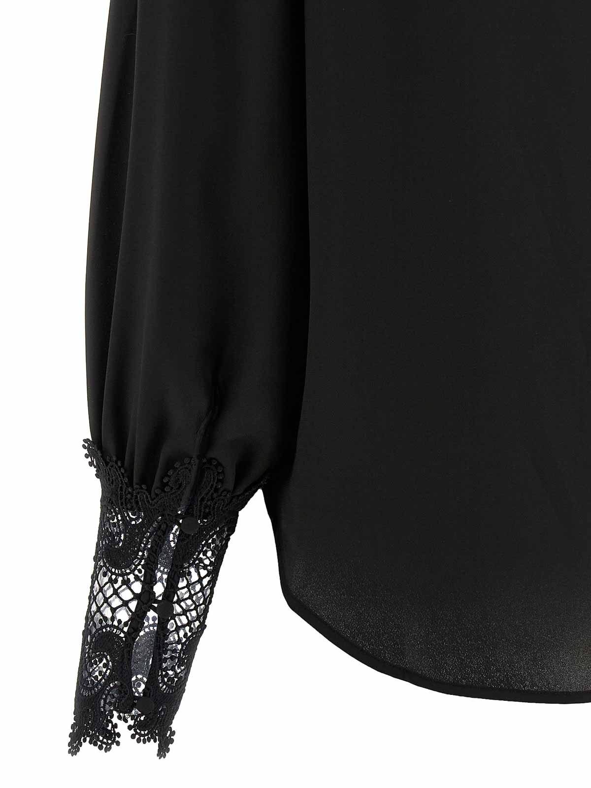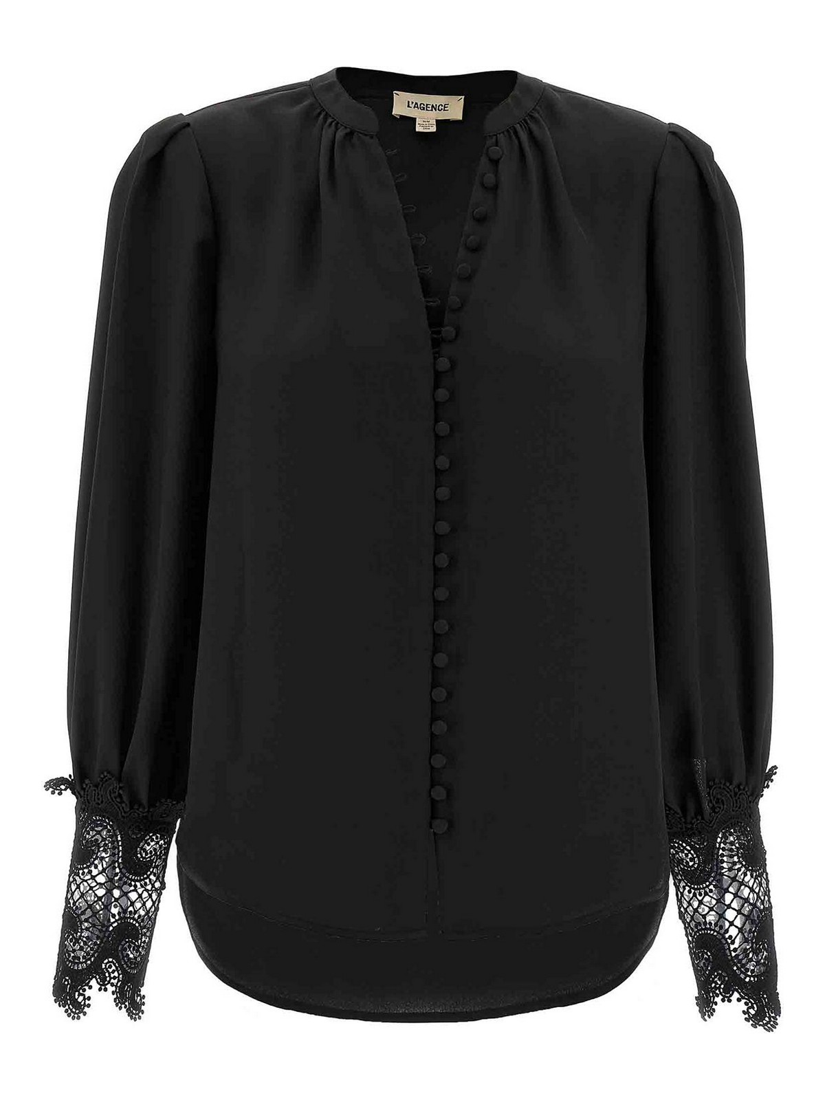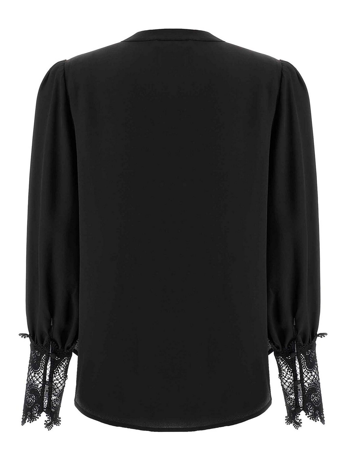 Cady-Shirt von Ava, Stehkragen, Knopfverschluss auf der Vorderseite, lange Ärmel mit langen, gerafften Manschetten aus Guipure-Spitze und leicht gepuffter Schulter.