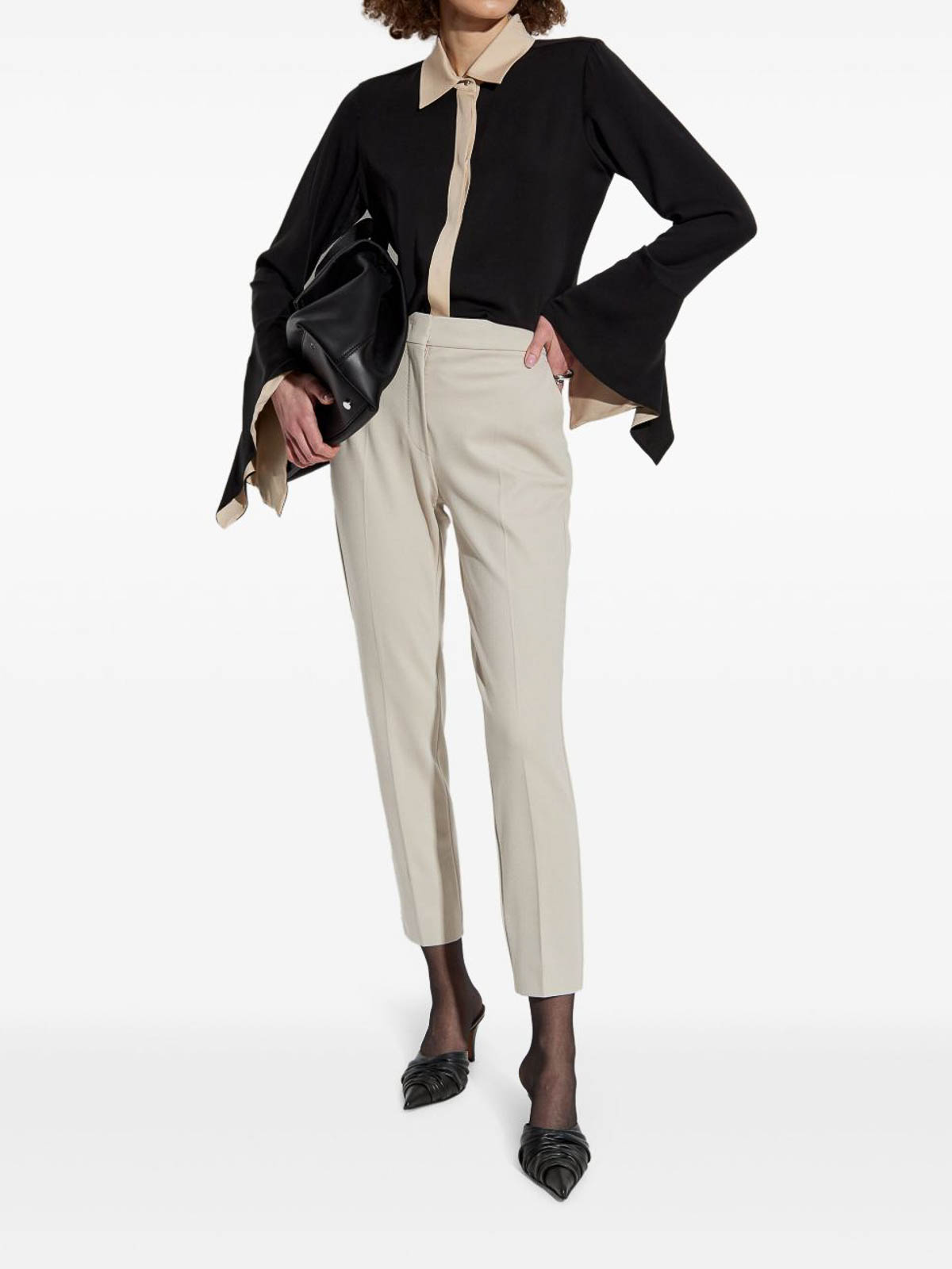 Fließendes und feminines Hemd, schwer, rein, Charmeuse mit Kontrast. Das Modell zeichnet sich durch einen klassischen Spitzkragen, lange Ärmel mit Rüschenmanschetten und abgerundete Seitenschlitze an der Unterseite des Kleidungsstücks mit versteckten Knöpfen aus.