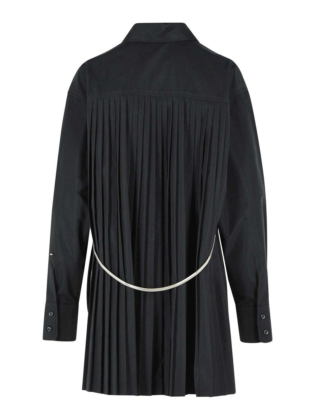Spitzkragen, Knopfverschluss auf der Vorderseite, aufgesetzte Brusttasche, Knopfmanschetten, Dekoration mit Lichtpunkt am Ärmel, ausgestellter Saum mit breitem Seitenschlitz, Rückenfalte, dekorativer Kettengürtel