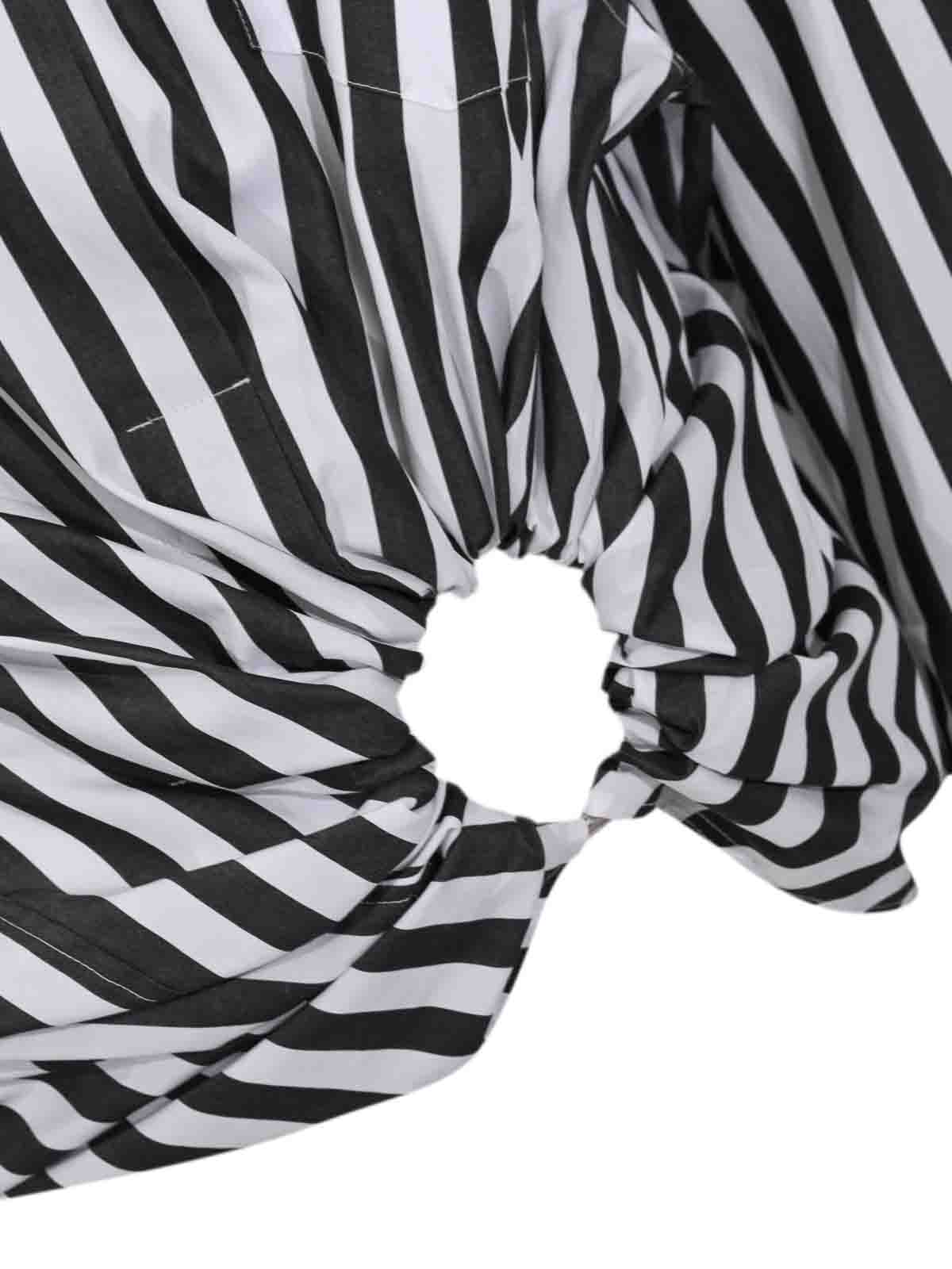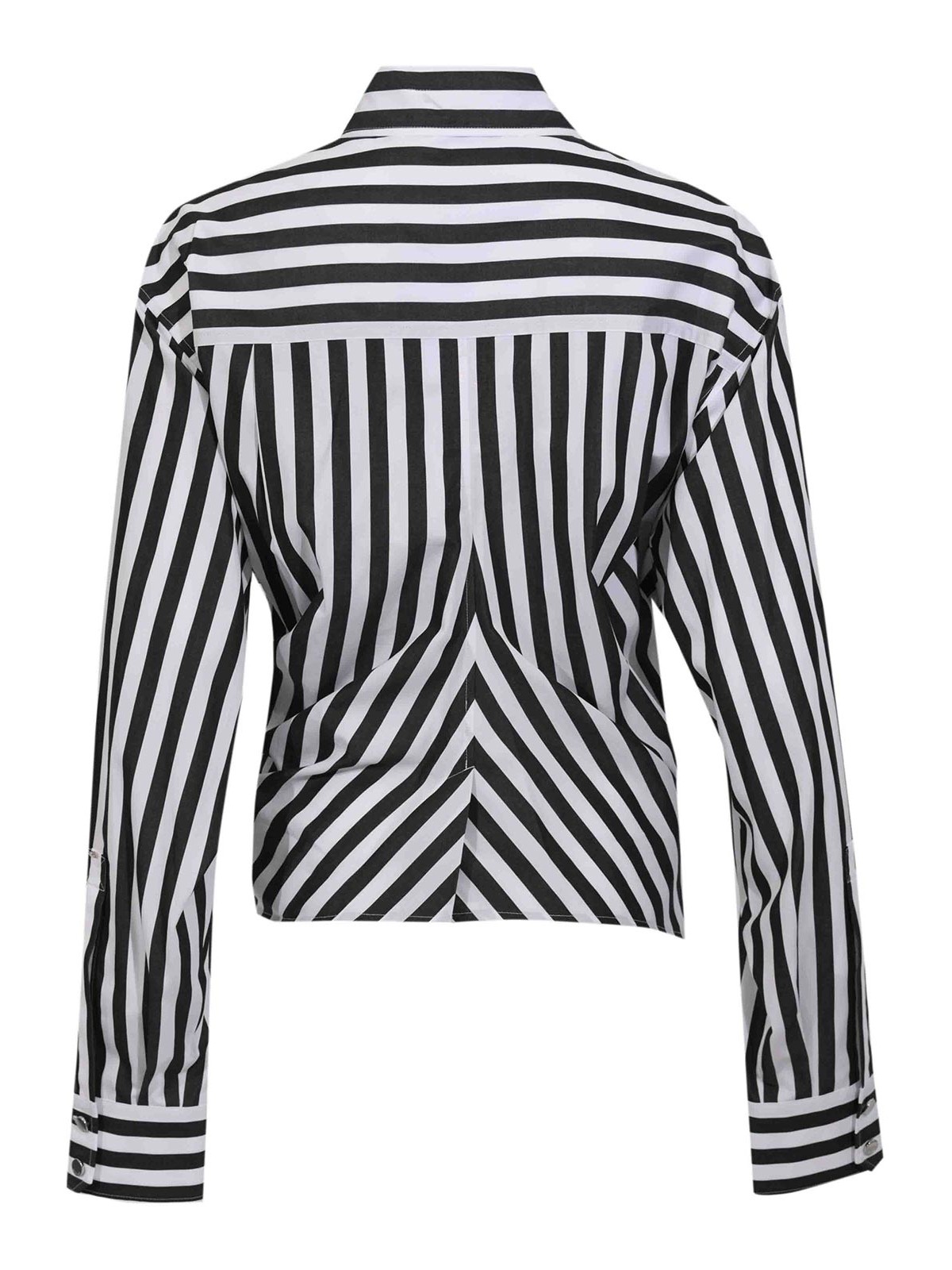 Damenhemd aus Baumwollpopeline, Sportmax, Modell Spxpalmizi, Stoff: Baumwollpopeline, Muster: vertikale Streifen, Ärmel: lang mit Manschetten, Kragen: klassischer Hemdstil, Verschluss: Frontknöpfe, Taschen: aufgesetzte Brusttasche, Details: Drapierung mit Metallring, Spiel in der Richtung der Streifen, geraffter Effekt, gefüttert: nein, Passform: normal