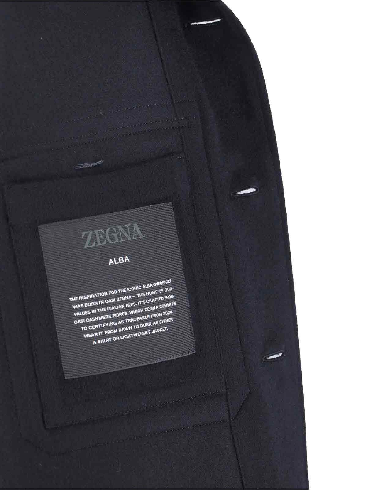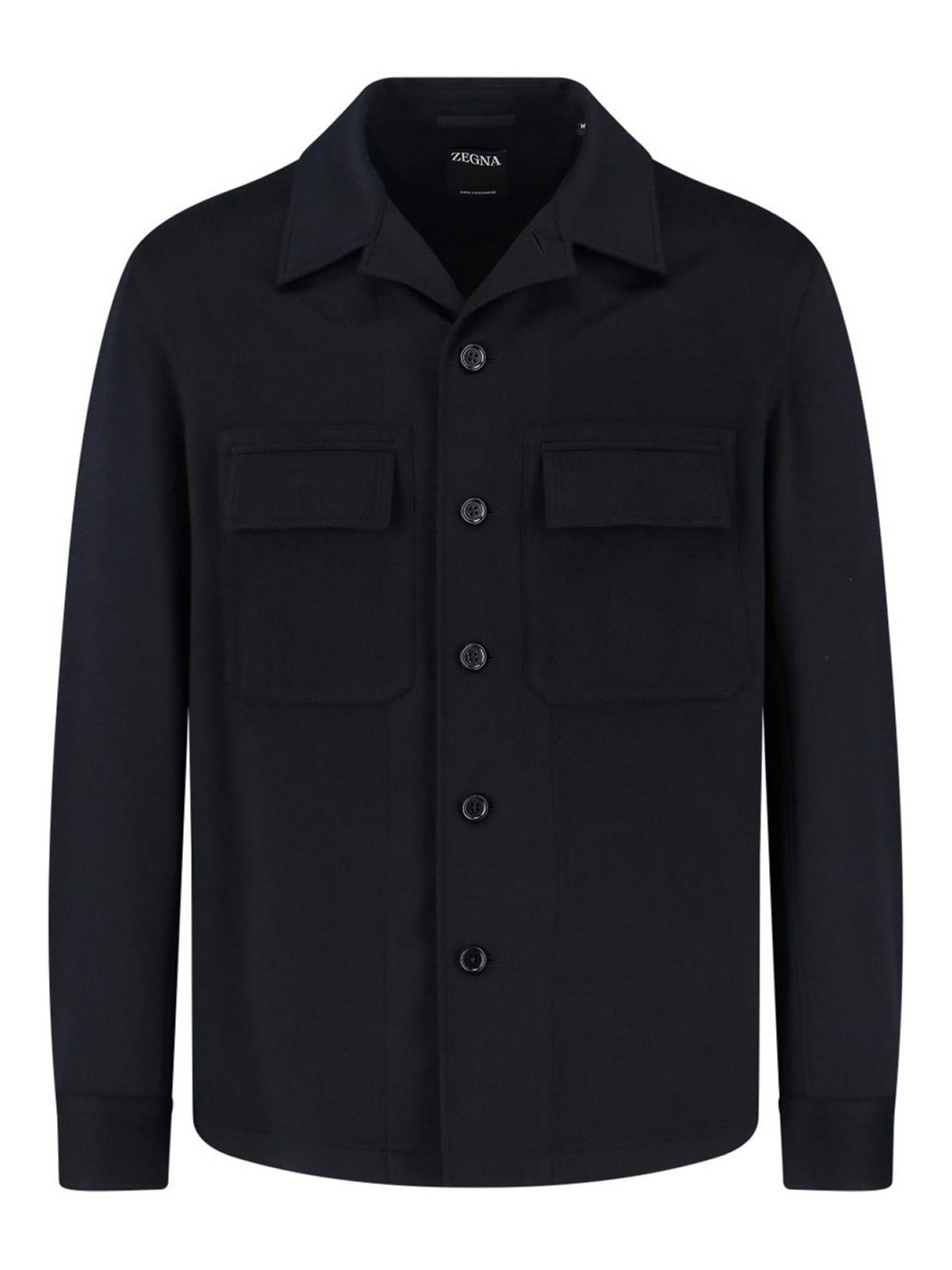 Zegna Alba Kaschmirhemdjacke, schwarz, klassischer Kragen, Knopfverschluss, zwei Fronttaschen, geknöpfte Manschetten, gerader Saum.