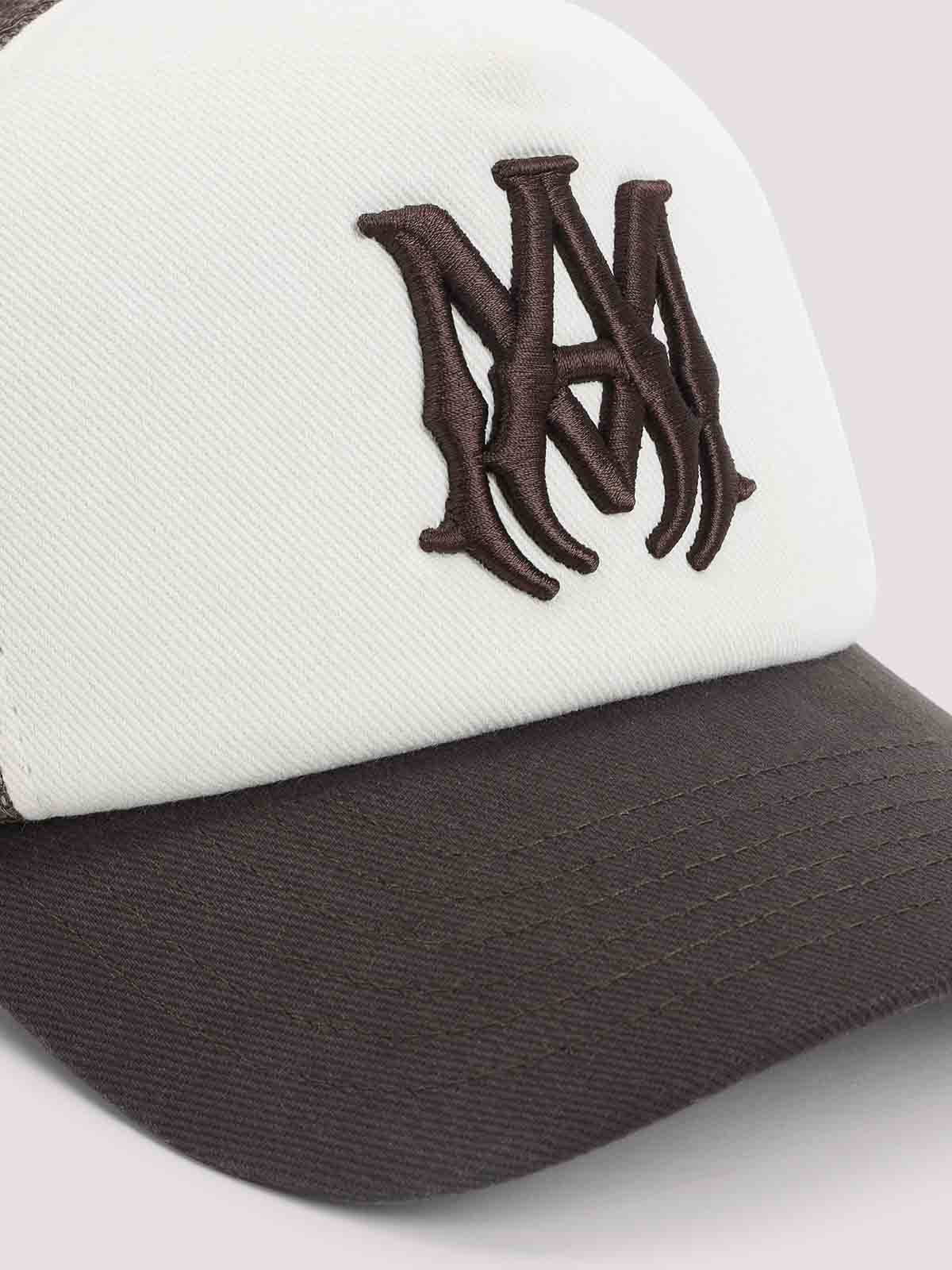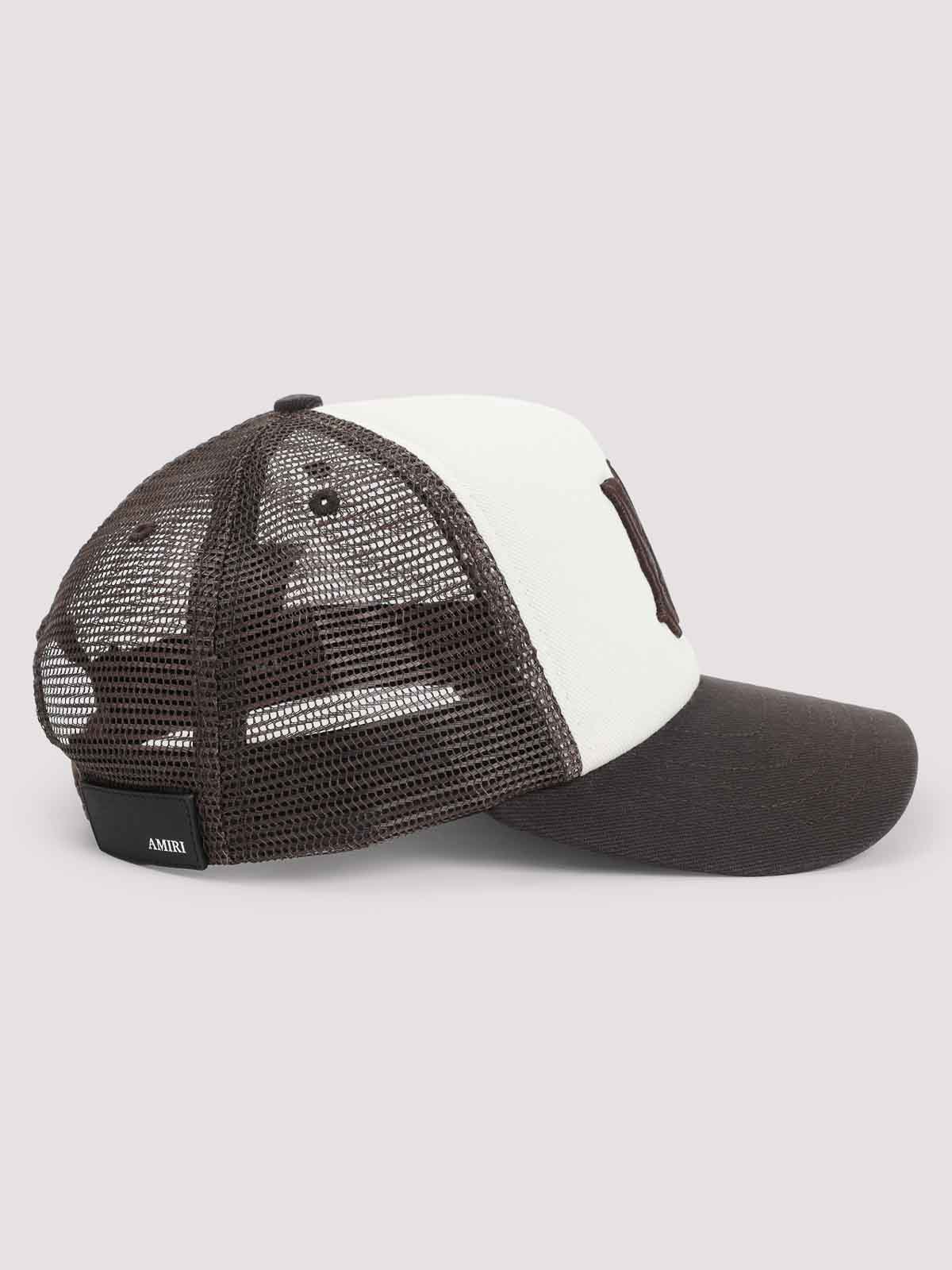 Amiri Foam Trucker Hut aus brauner Baumwolle. Baseballmütze aus weißem Baumwollsegeltuch und braunem Mesh, mit der Amiri-Logostickerei auf der Vorderseite, einem Markenetikett auf der Rückseite und einem verstellbaren Gummiband auf der Rückseite.