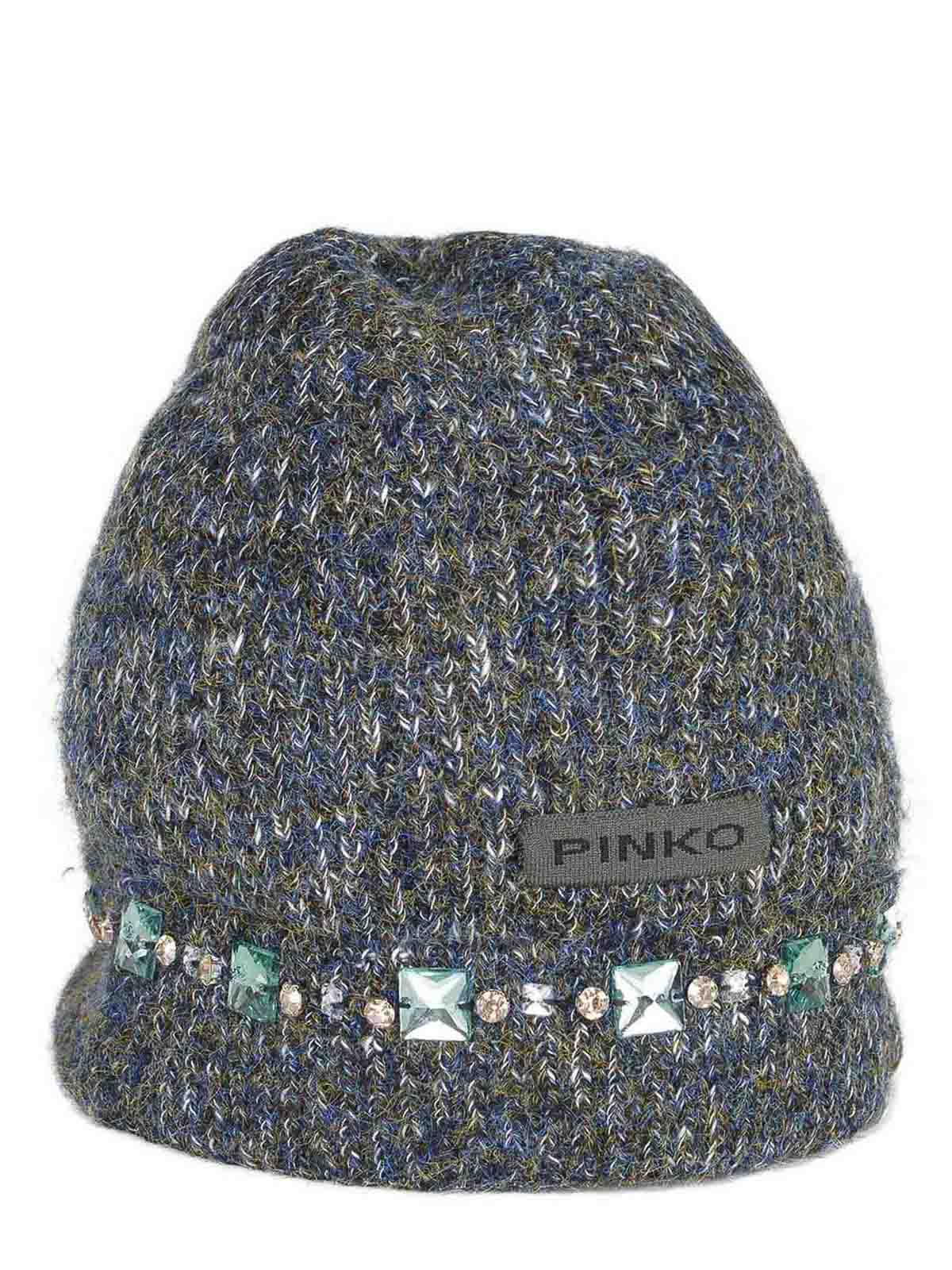 Pinko Belarus-Hut aus grauer Acrylmischung, kontrastfarbene Fadeneinsätze, Logo-Label auf der Vorderseite, Strassdetails auf Vorder- und Rückseite, 85% Polyester, 13% Polyacryl, 2% Elastan