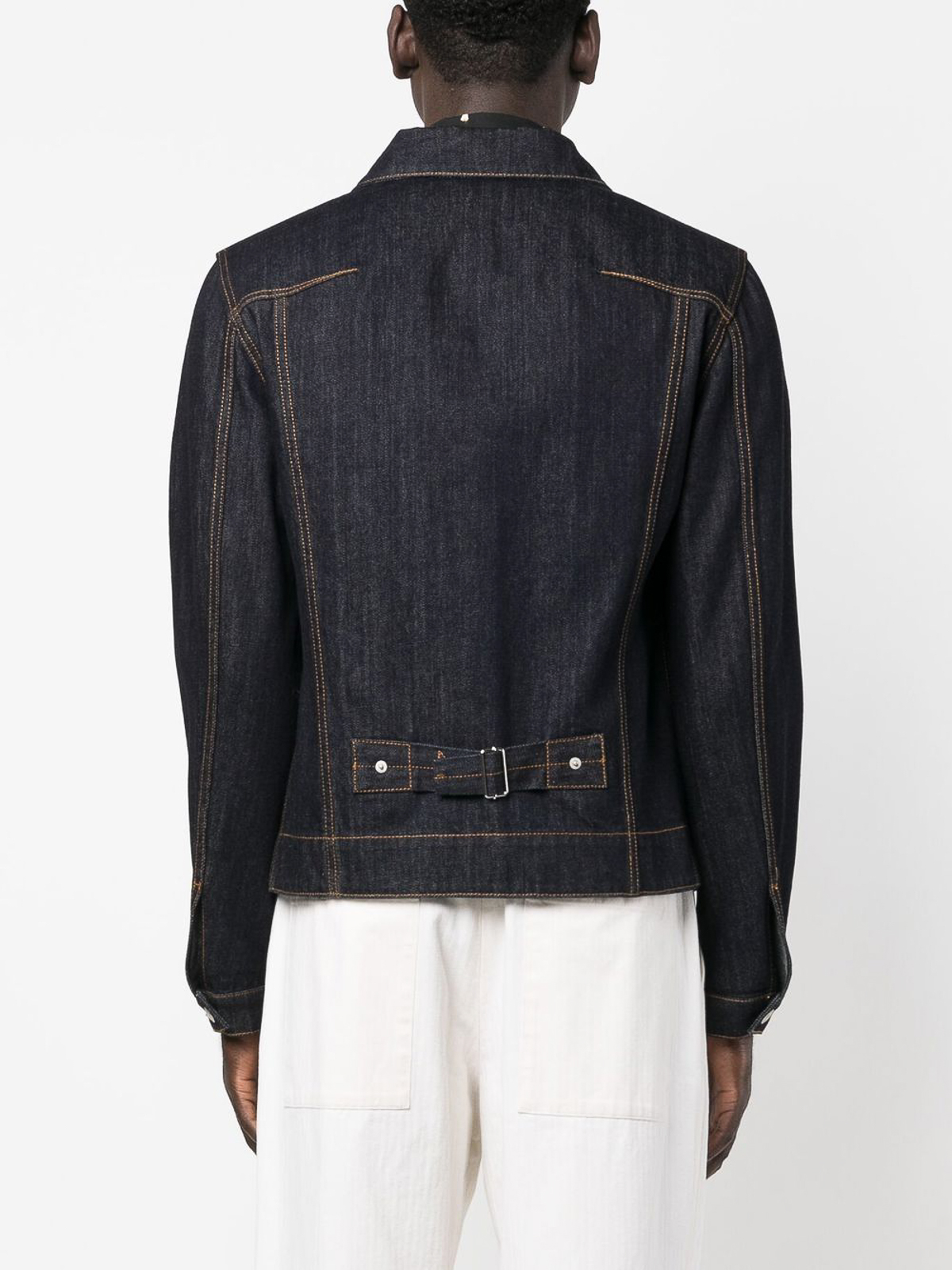 Jeansjacke von Alexander McQueen mit folgenden Eigenschaften: Marineblau, Baumwolle, dunkle Waschung, Kontrastnähte, verstellbarer Riemen auf der Rückseite, gespreizter Kragen, Knopfverschluss vorne, lange Ärmel, geknöpfte Manschetten, zwei aufgesetzte Brusttaschen und zwei seitliche Leistentaschen.