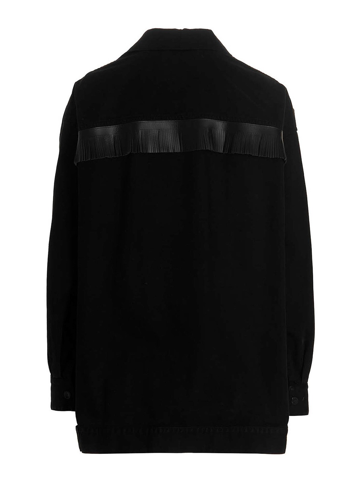 Jeansjacke mit einer Lederapplikation mit Fransen auf der Rückseite und silbernen Metallnieten, einem Knopfverschluss, Taschen, einem Logo-Patch aus Leder auf der Vorderseite und langen Manschettenärmeln.