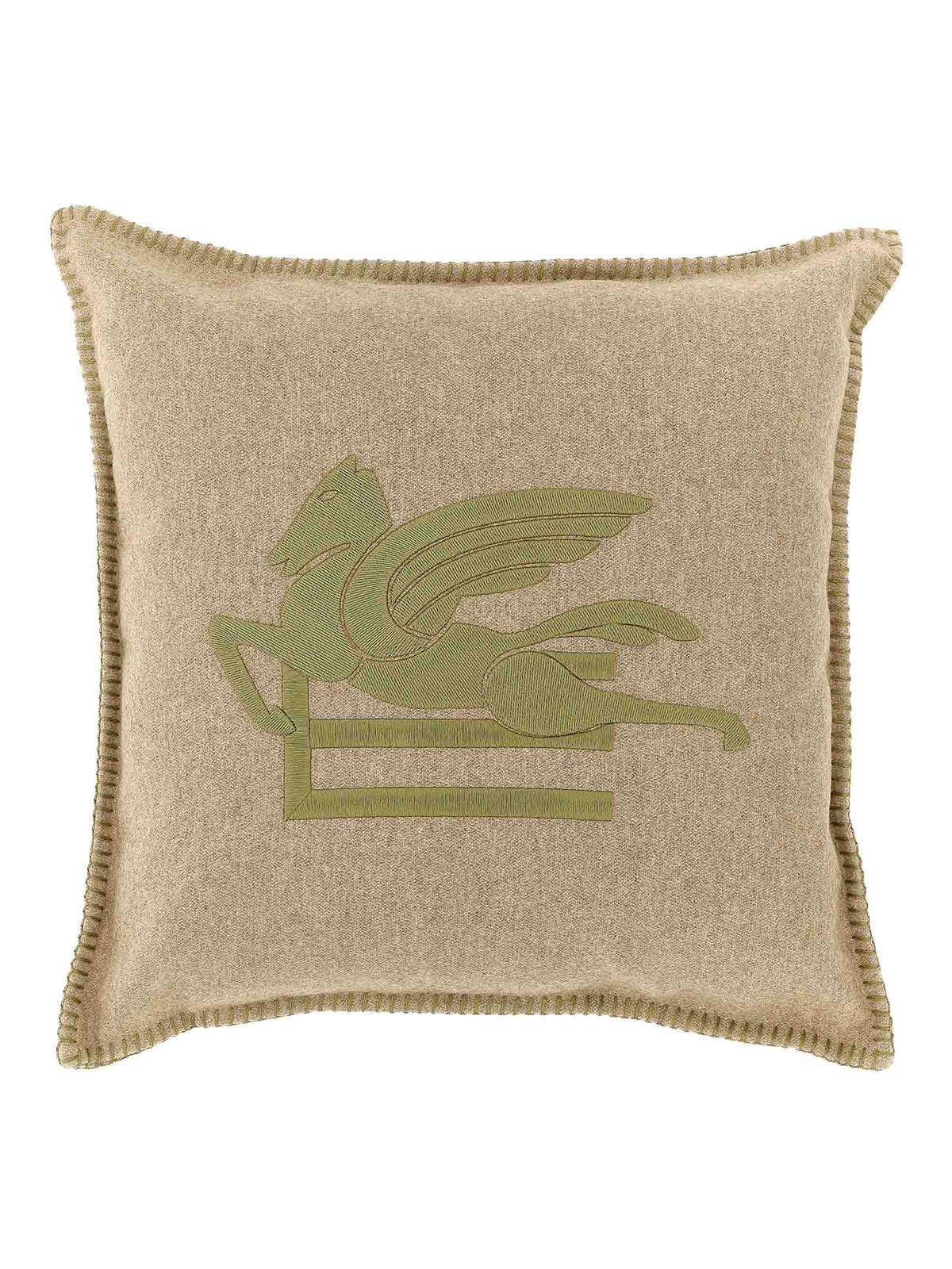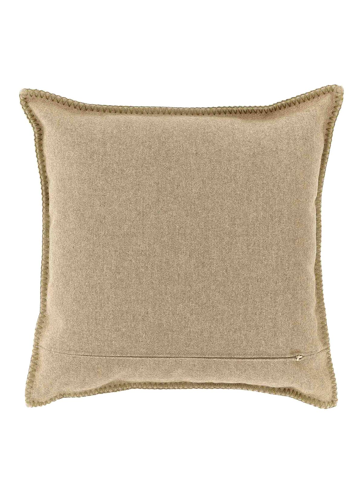Wollkissen, Logostickerei und „Pegaso“ auf der Vorderseite, Reißverschluss auf der Rückseite, Paspelierung mit Schrittnähten.