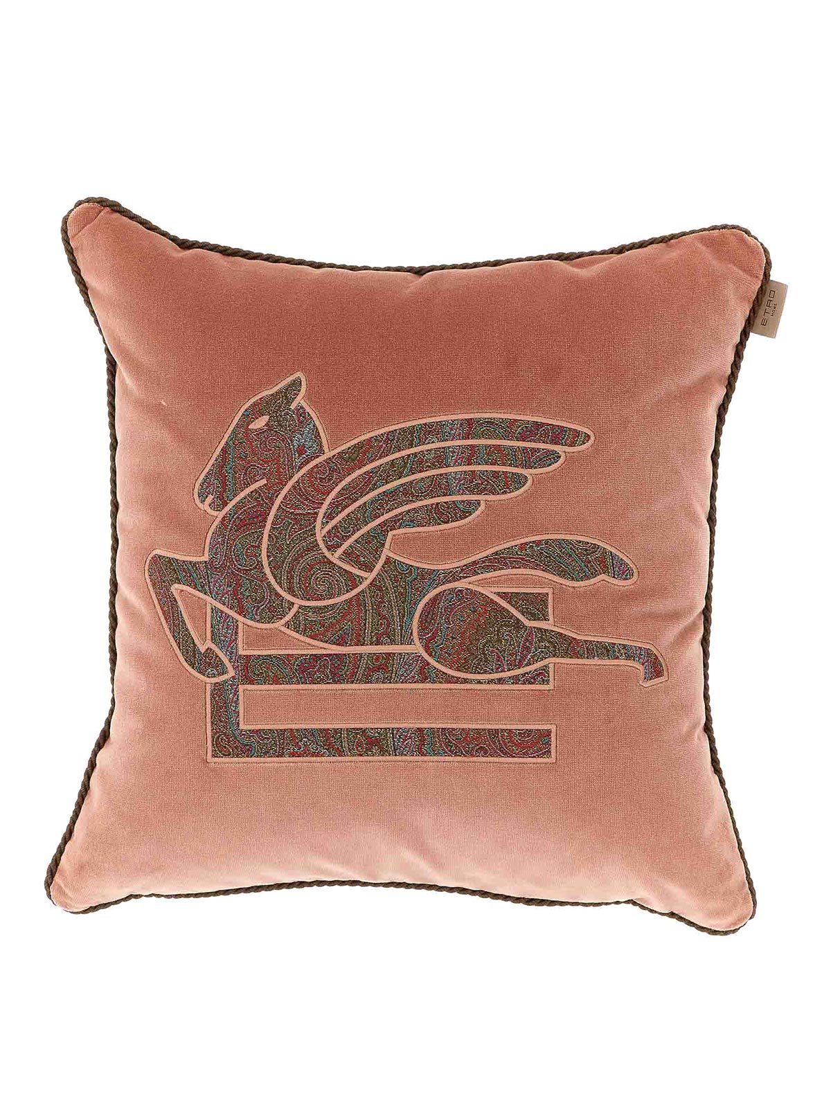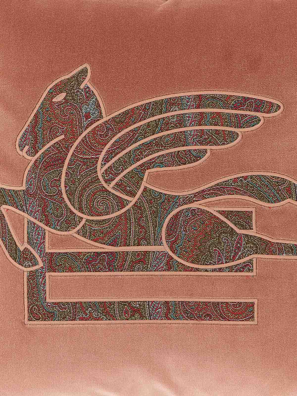 Kissen aus Baumwollsamt, Logostickerei und „Pegaso“ aus dem ikonischen Paisley-Jacquardstoff, verziert mit einer Fadenstickerei.