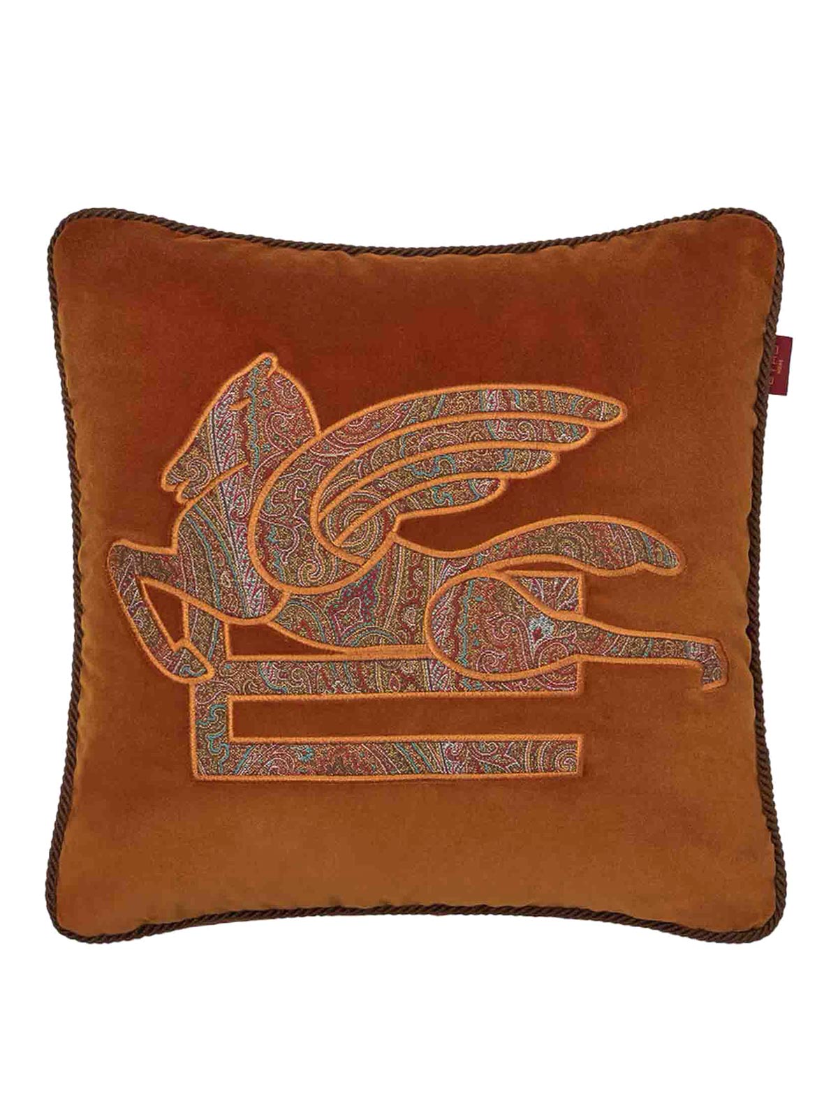 Kissen aus Baumwollsamt, Logostickerei und „Pegaso“ aus dem ikonischen Paisley-Jacquardstoff, verziert mit einer Fadenstickerei.