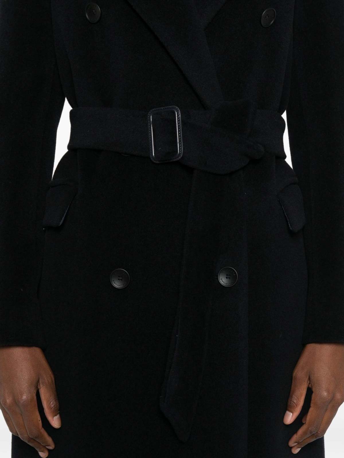 Schwarzer zweireihiger Knopfverschluss, Gürtel an der Taille, Spitze, Revers, lange Ärmel