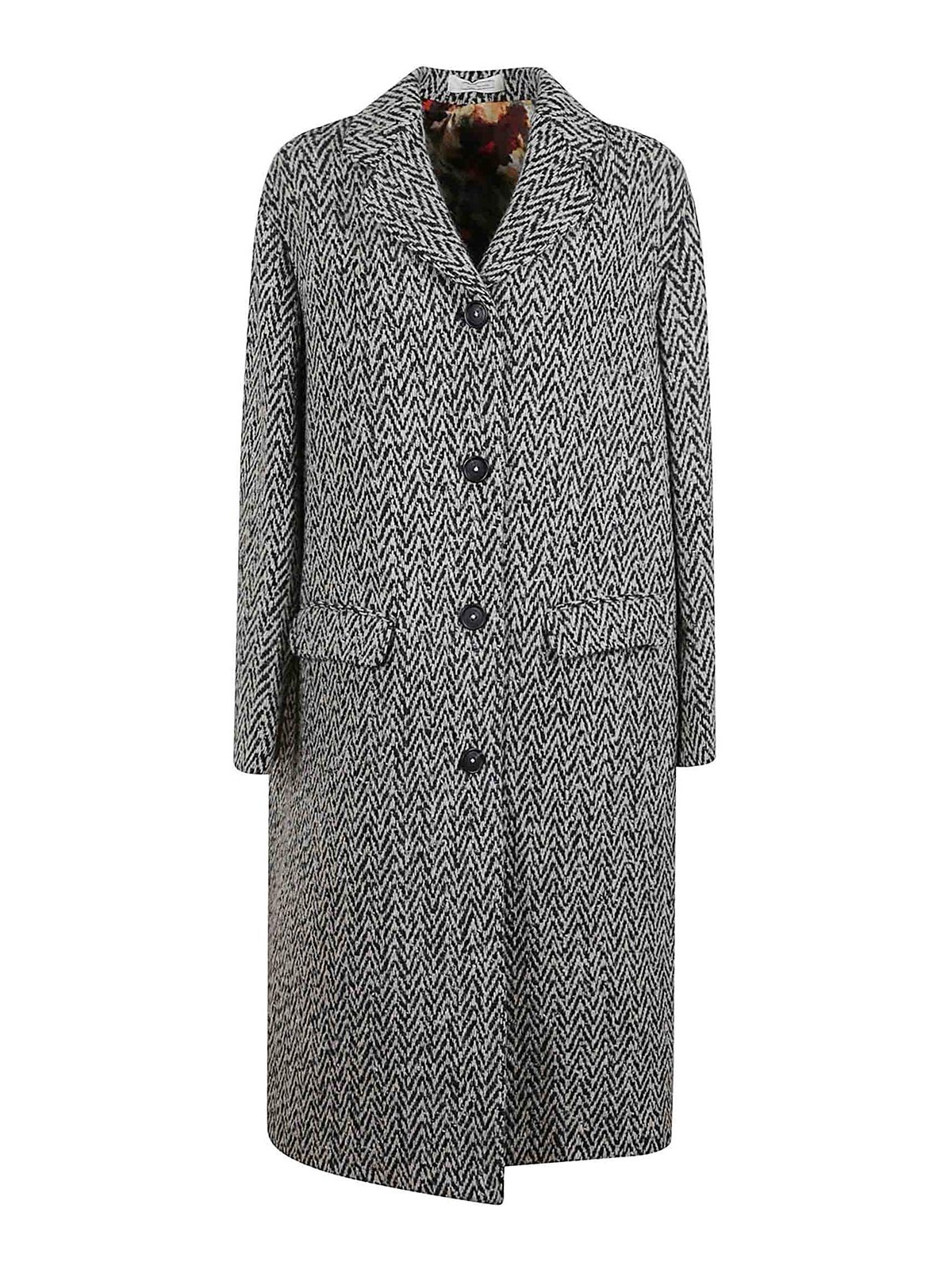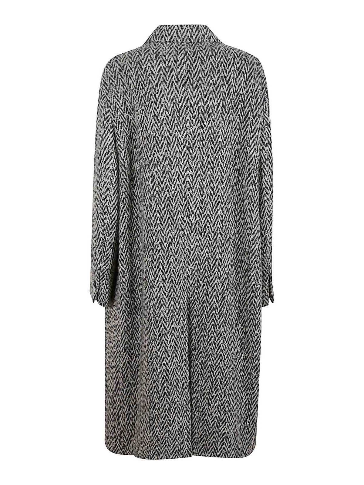 Schwarzer Mantel aus gemusterter Wollmischung, Knopfverschluss, Leistentaschen mit Klappe, zentraler Rückenschlitz, ikonisches gemustertes Futter, Overfit.