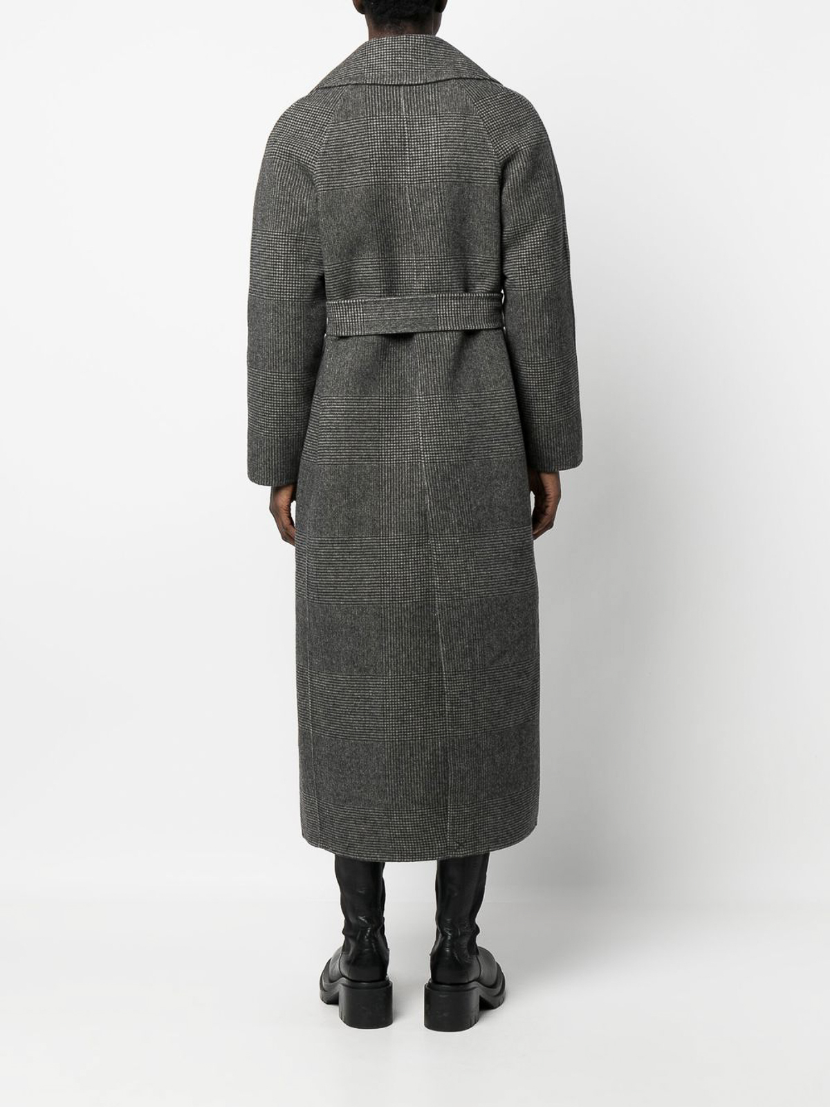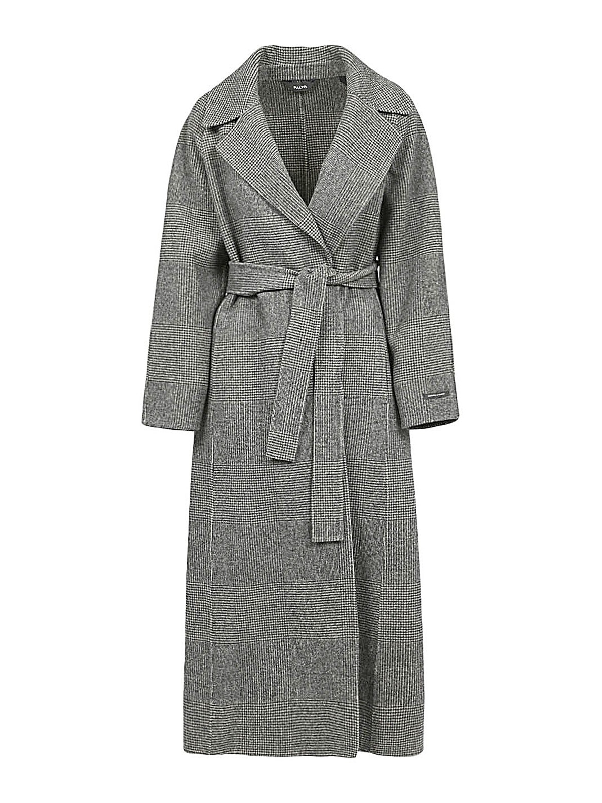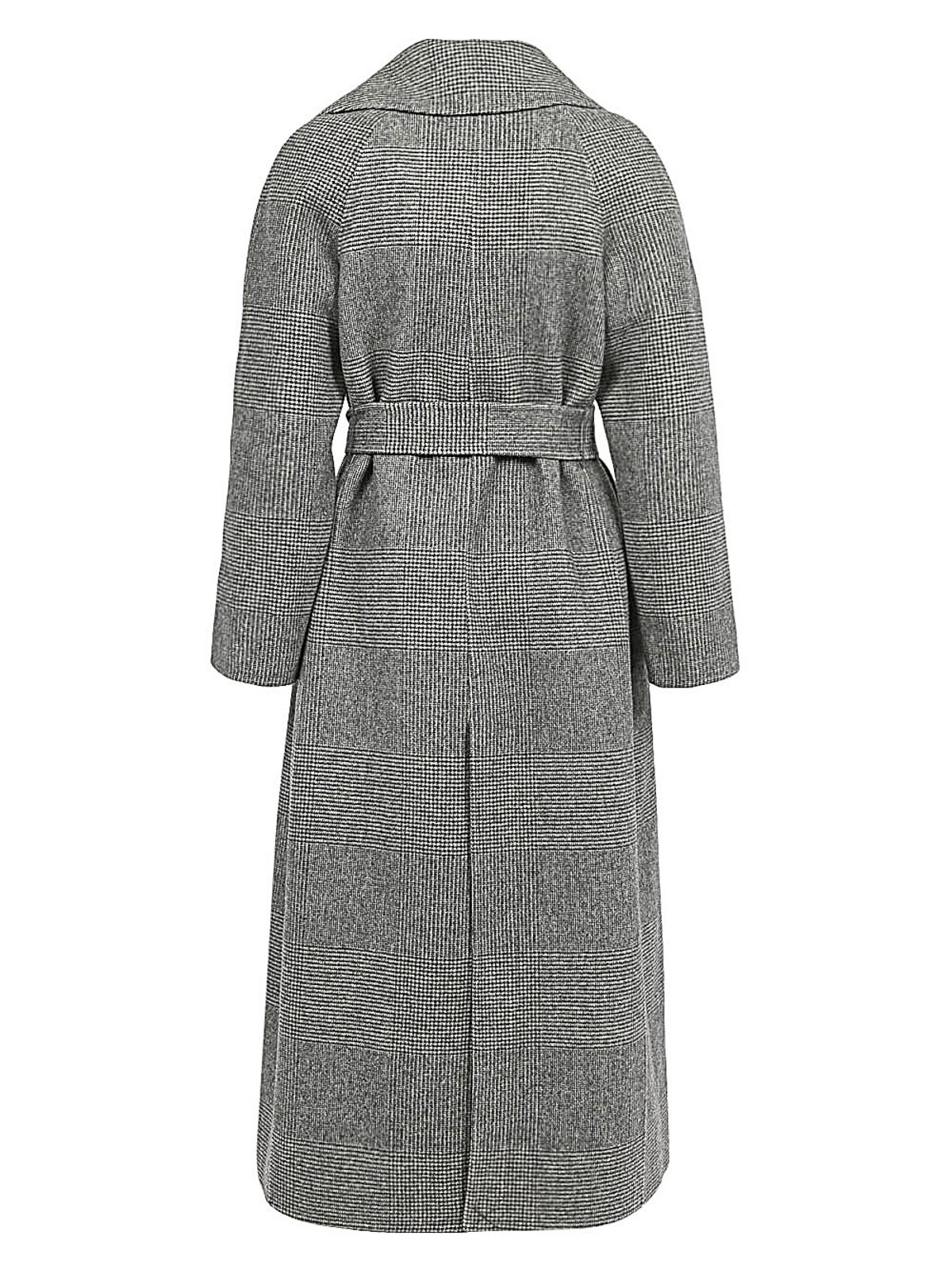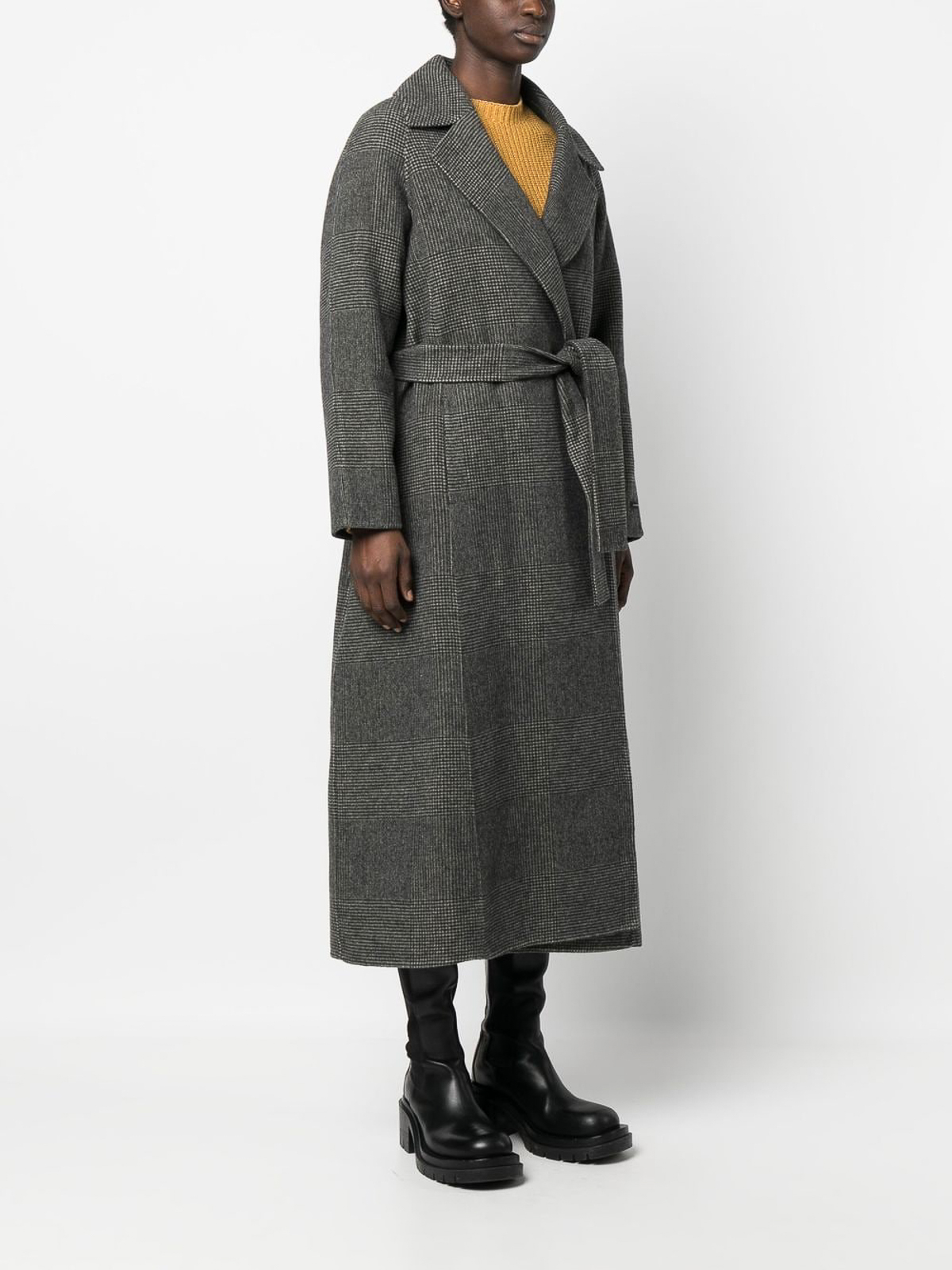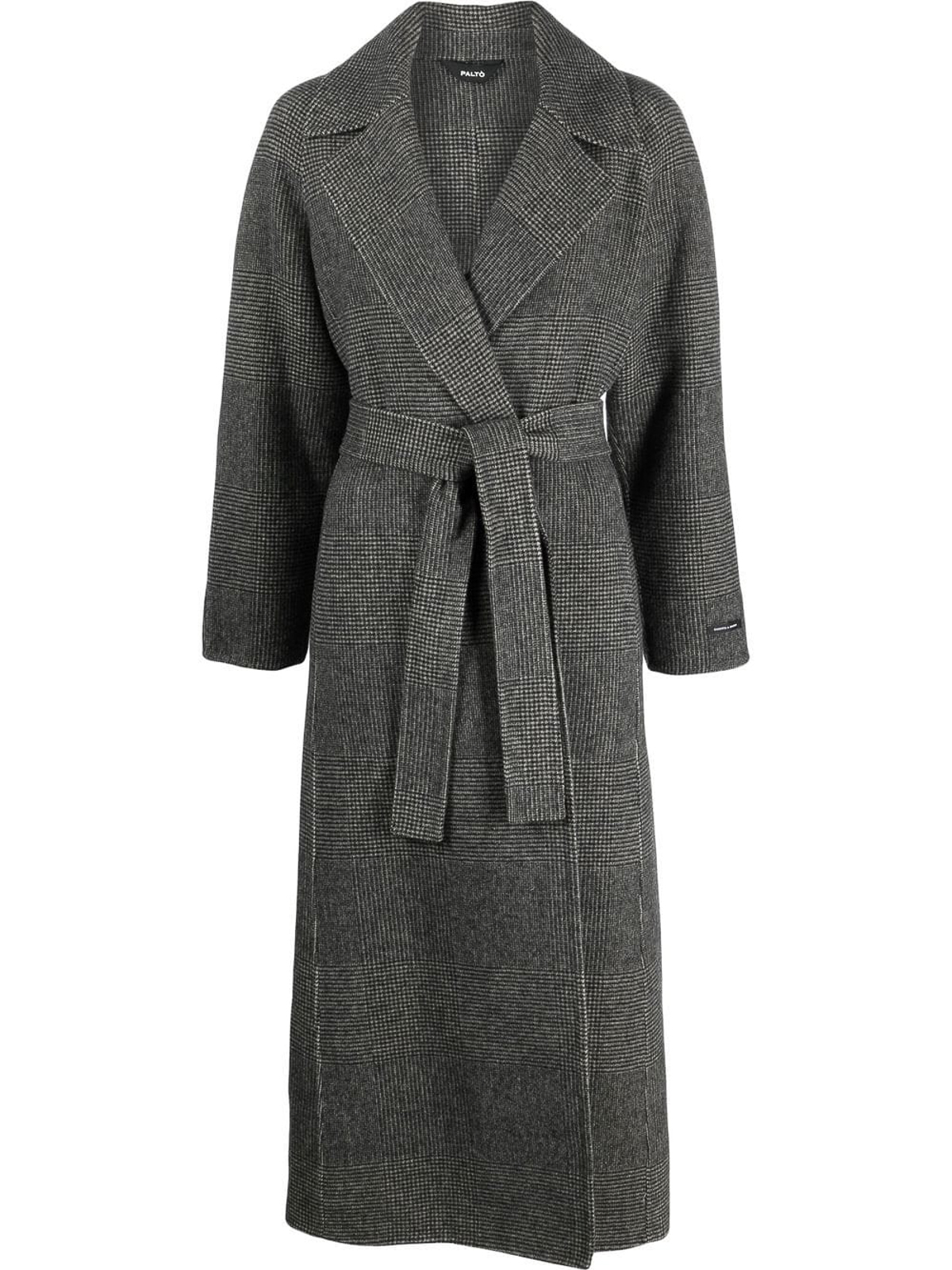 Mantel mit Hahnentrittmuster und Gürtel von Palt aus beigefarbener, schwarzer Wollmischung, Wickeldesign, Karomuster, Hahnentrittmuster, Gürtel in der Taille, gekerbtes Revers, lange Ärmel, gerader Saum und mittlere Wadenlänge