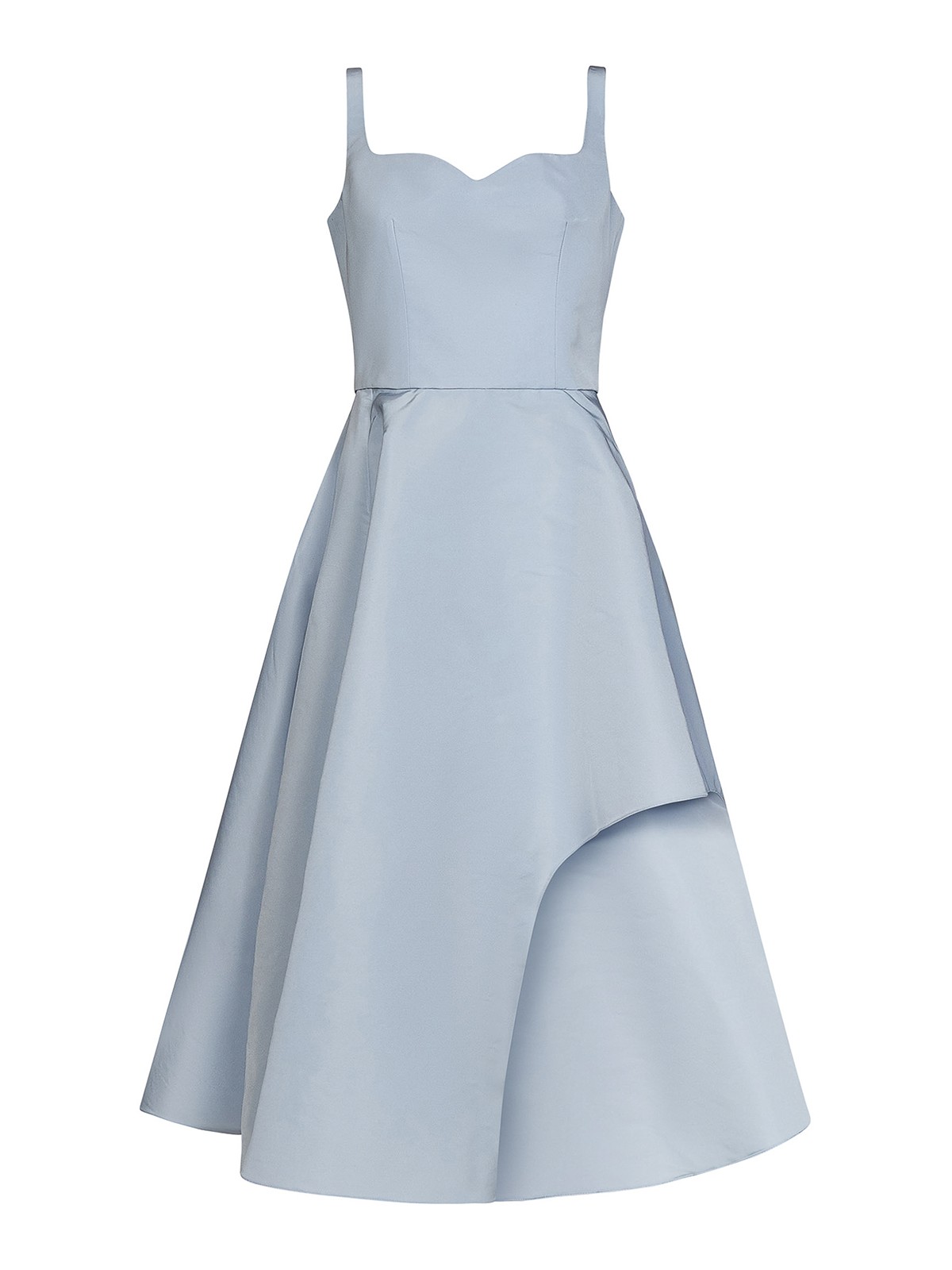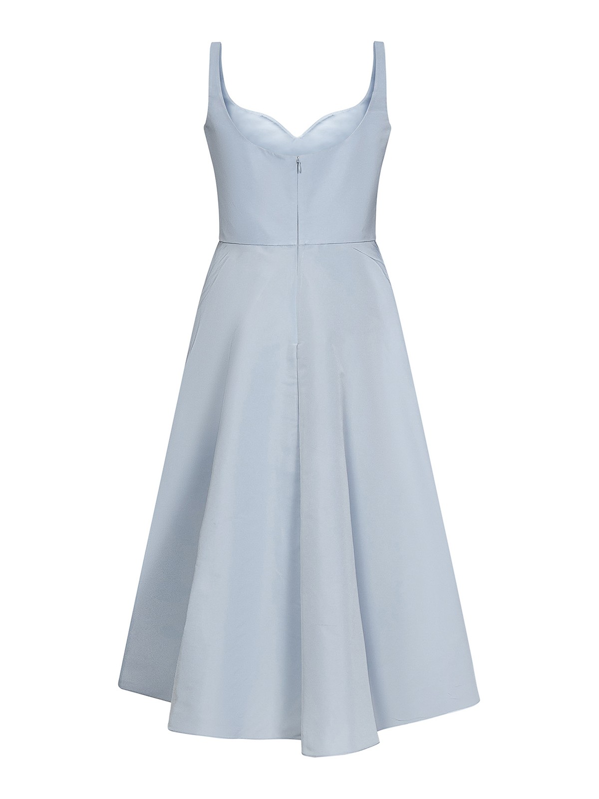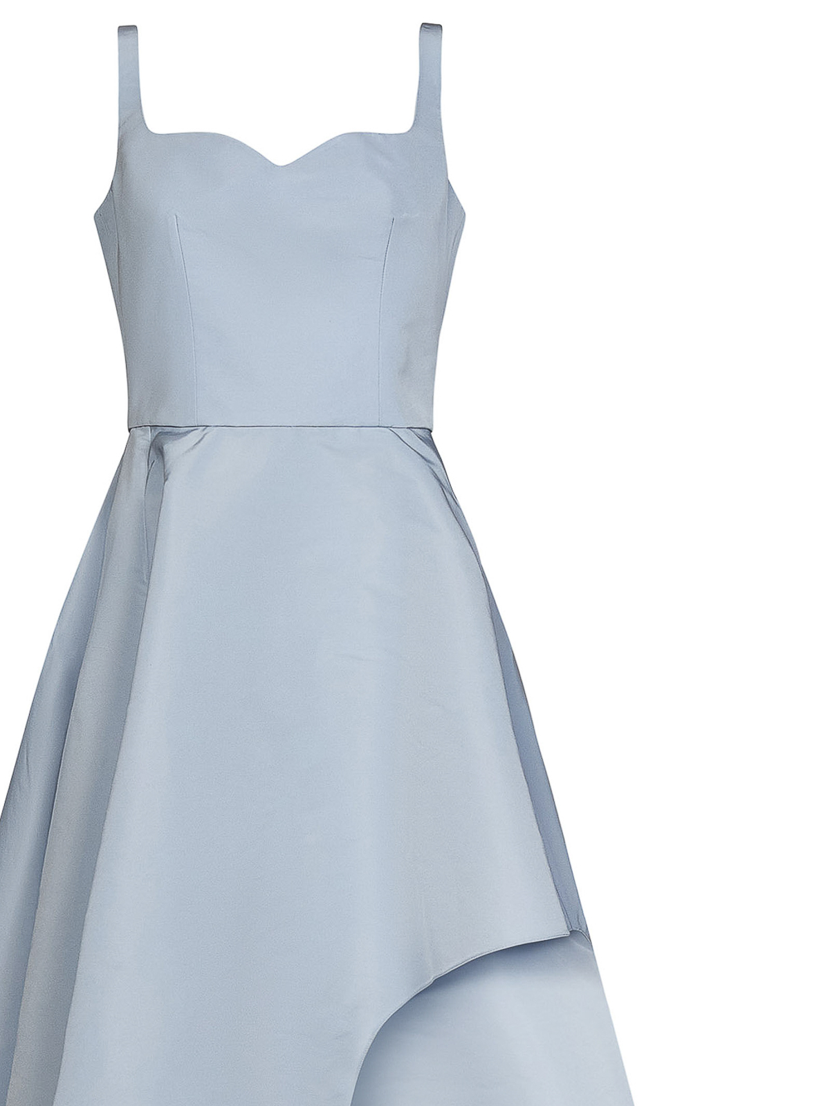 Verdeckter Reißverschluss hinten, herzförmiger Ausschnitt, Schulterriemen am Rücken, ärmelloser Taillenschnitt, geformter Schlitz an der Vorderseite, asymmetrischer Saum, puderblaues Polyester, Artikel auf dem Foto entspricht einem